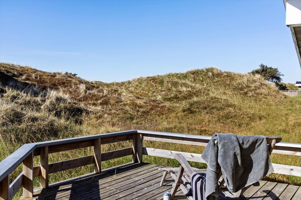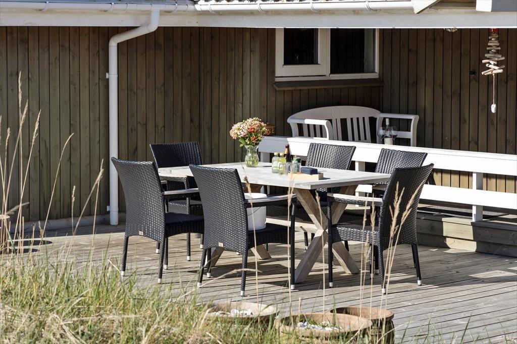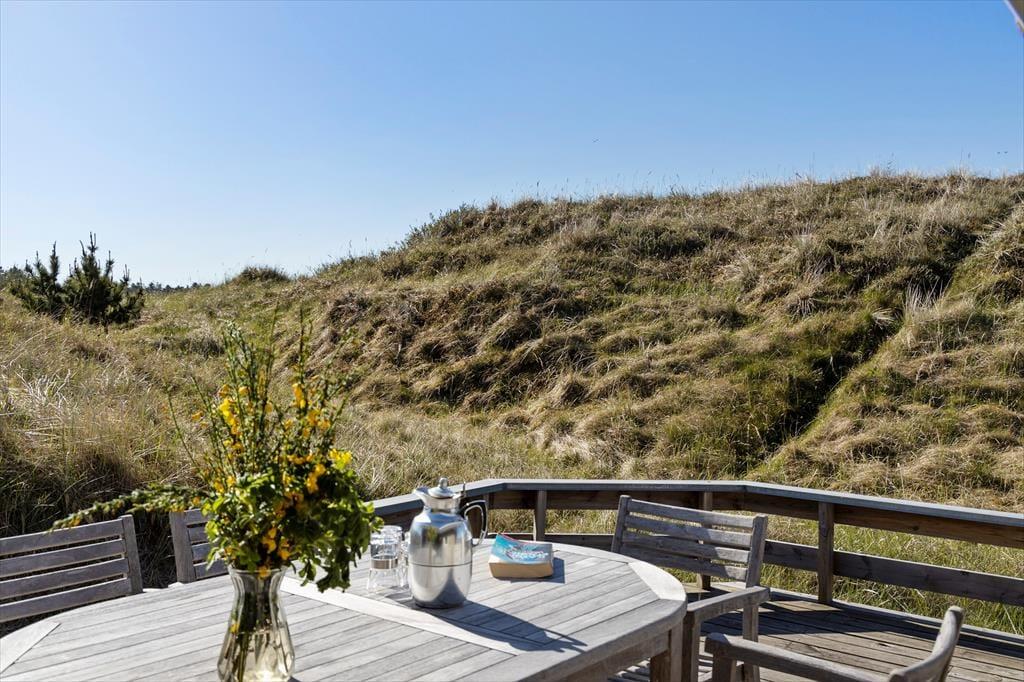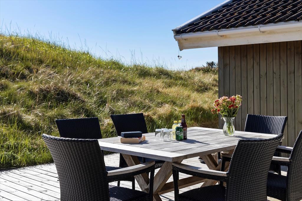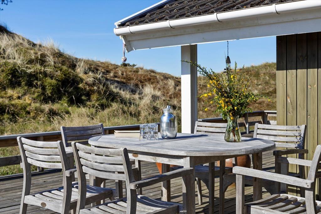 En stor terrasse strækker sig ud fra sommerhuset, inviterende til udendørs spisning, solbadning eller en eftermiddagslur i skyggen. Delvist overdækket, giver den mulighed for at nyde de skiftende vejrforhold uden at miste fornemmelsen af beskyttelse og intimitet. Beliggende på en usædvanligt smuk klitgrund, er vores sommerhus en del af en naturlig scene, hvor landskabet skifter farve og tekstur med årstidernes skiften. I vores sommerhus er fred og afslapning mere end bare ord - de er en del af hverdagen, en tilstand af sindet og en invitation til at opleve livet i sin reneste og mest beroligende form.