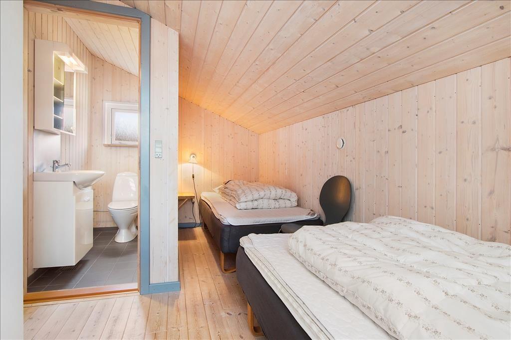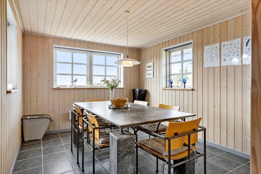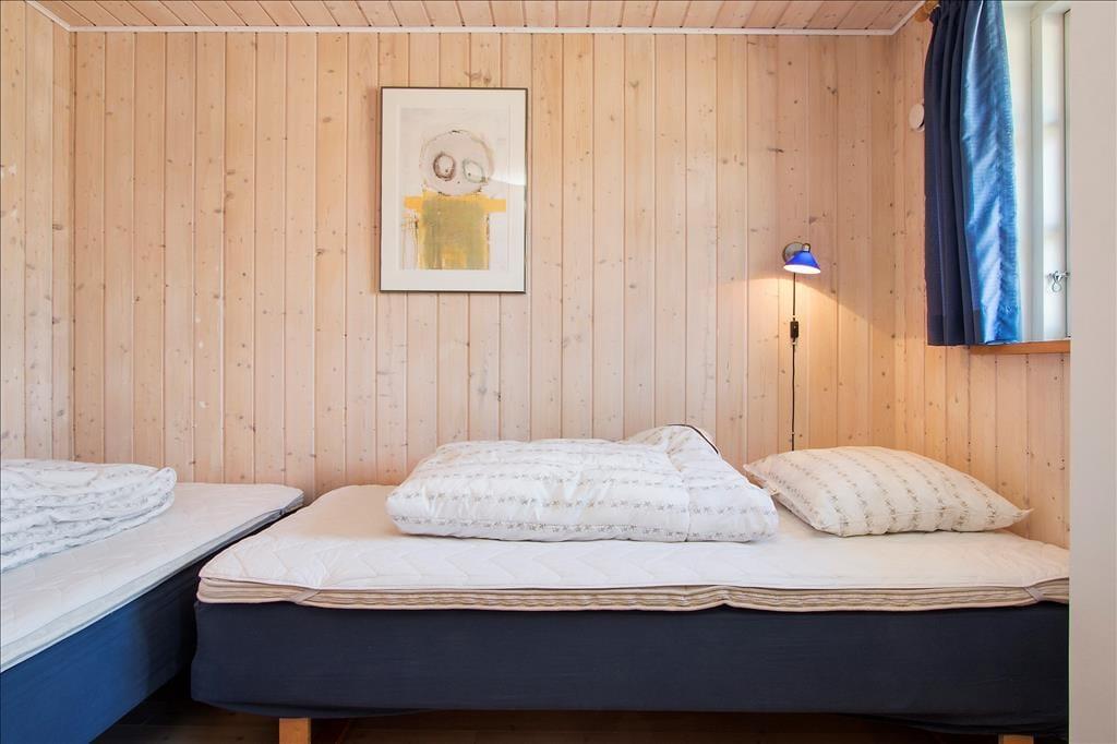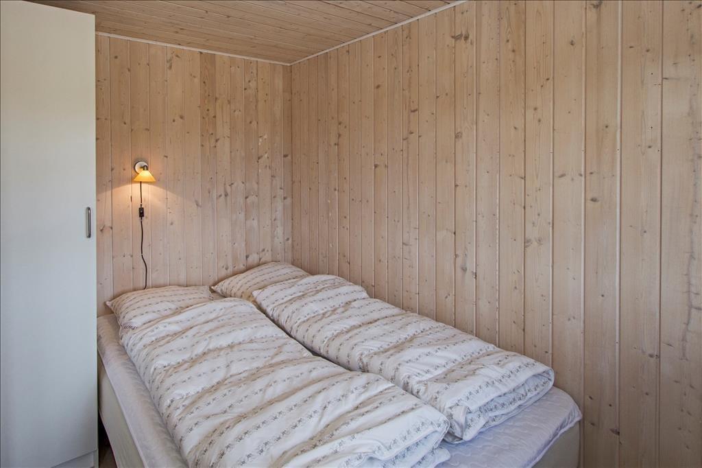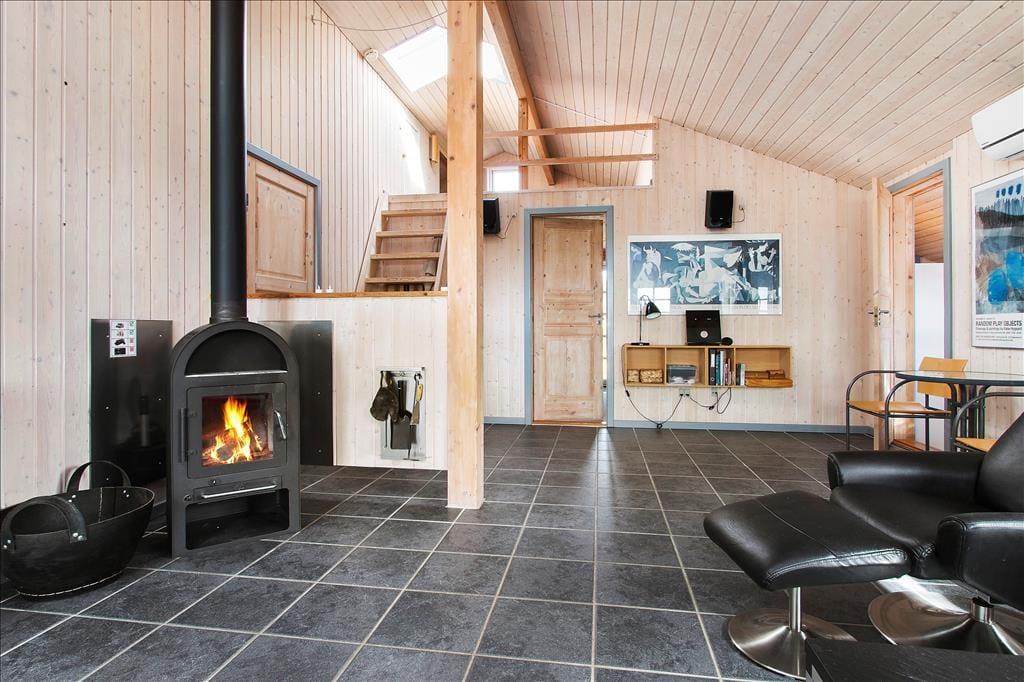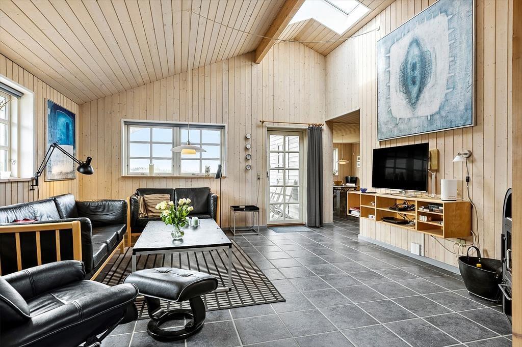 Indenfor byder sommerhuset på en skøn og afslappet atmosfære med loft til kip og store vinduespartier, der giver et smukt lysindfald og skaber forbindelse til det grønne udenfor. Stuen er indrettet med både spiseplads og bløde siddepladser, hvor familien kan samles til alt fra morgenbrunch og kortspil til stille aftener med film og ild i brændeovnen. Når du sætter dig i sofaen med et lunt tæppe og kan høre ilden knitre i baggrunden, føles det næsten, som om tiden står stille. Køkkenet ligger i åben forbindelse med stuen, så du kan lave mad uden at gå glip af selskabet, og når kroppen trænger til lidt ekstra forkælelse, er saunaen lige i nærheden og står klar til at give dig varmen helt ind i sjælen. Huset er rummeligt og giver dig både plads og ro til at nyde din ferie – uanset årstid.