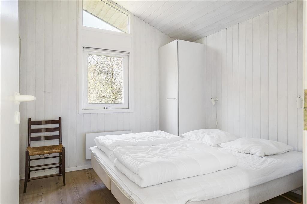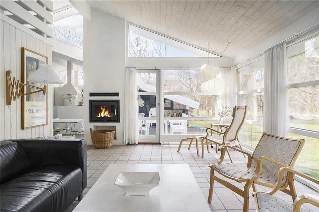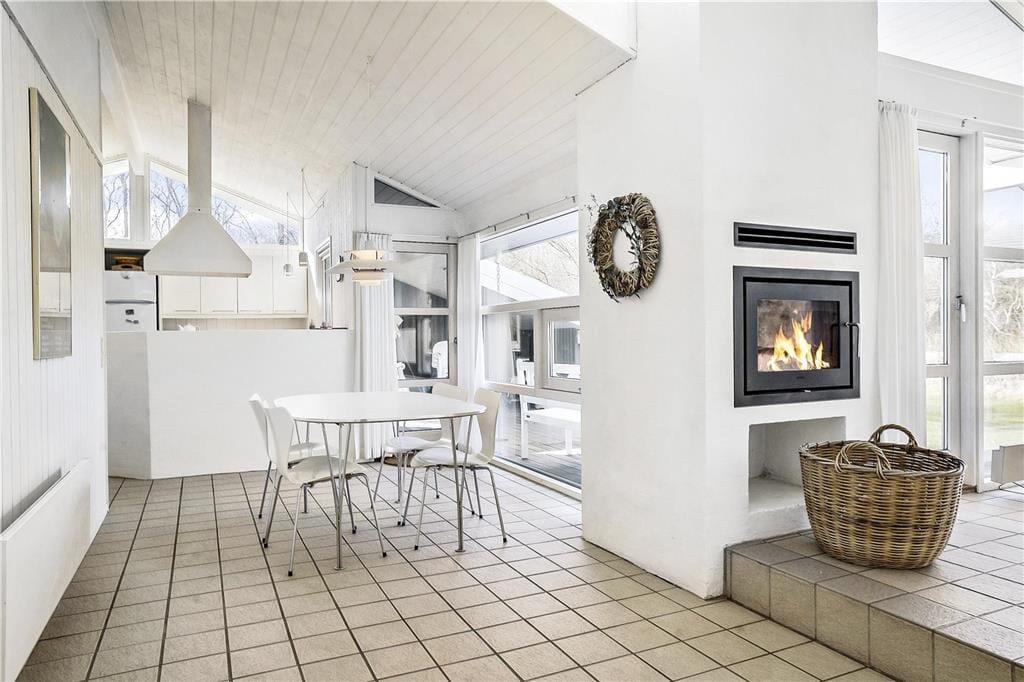 Sommerhuset har en lys og indbydende indretning, hvor store vinduespartier lukker det naturlige lys ind og skaber en åben atmosfære. I stuen kan du lade roen sænke sig i de bløde møbler eller samles med familien omkring brændeovnen, der spreder en hyggelig varme på kølige aftener. Det åbne køkken er forbundet med stuen og gør det let at være sammen under madlavningen, mens den hyggelige spiseplads er ideel til måltider og brætspil. Soveværelserne er enkle og komfortable, og her kan du få en god nats søvn og vågne udhvilet til en ny dag fuld af oplevelser.