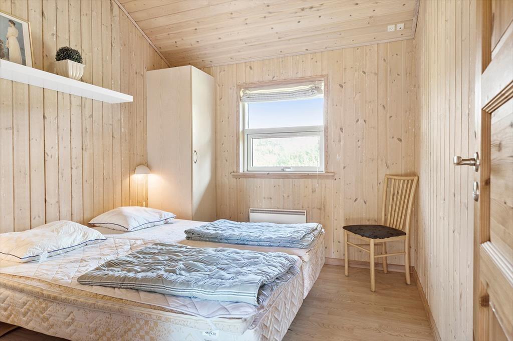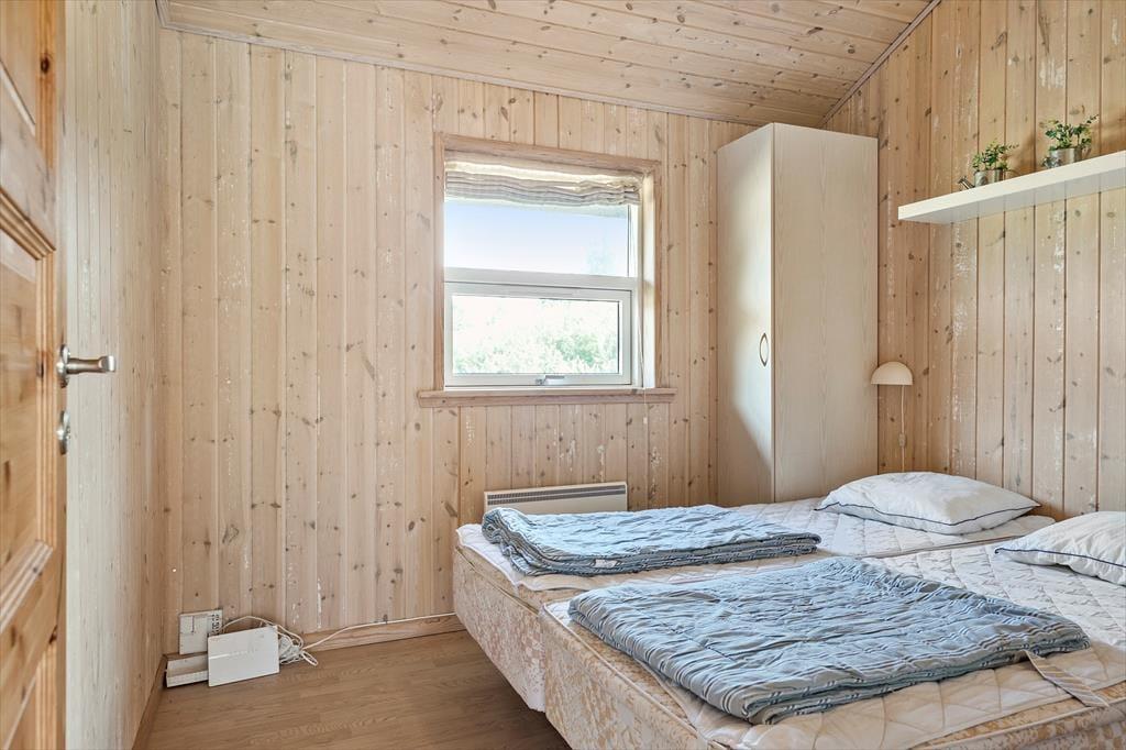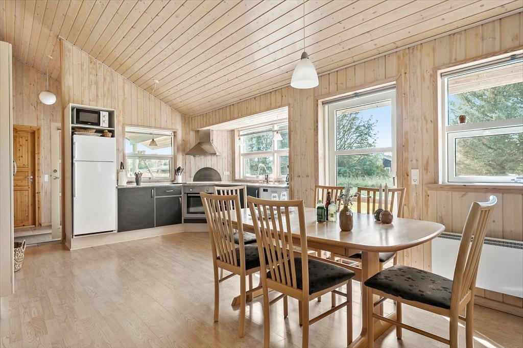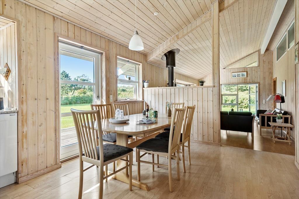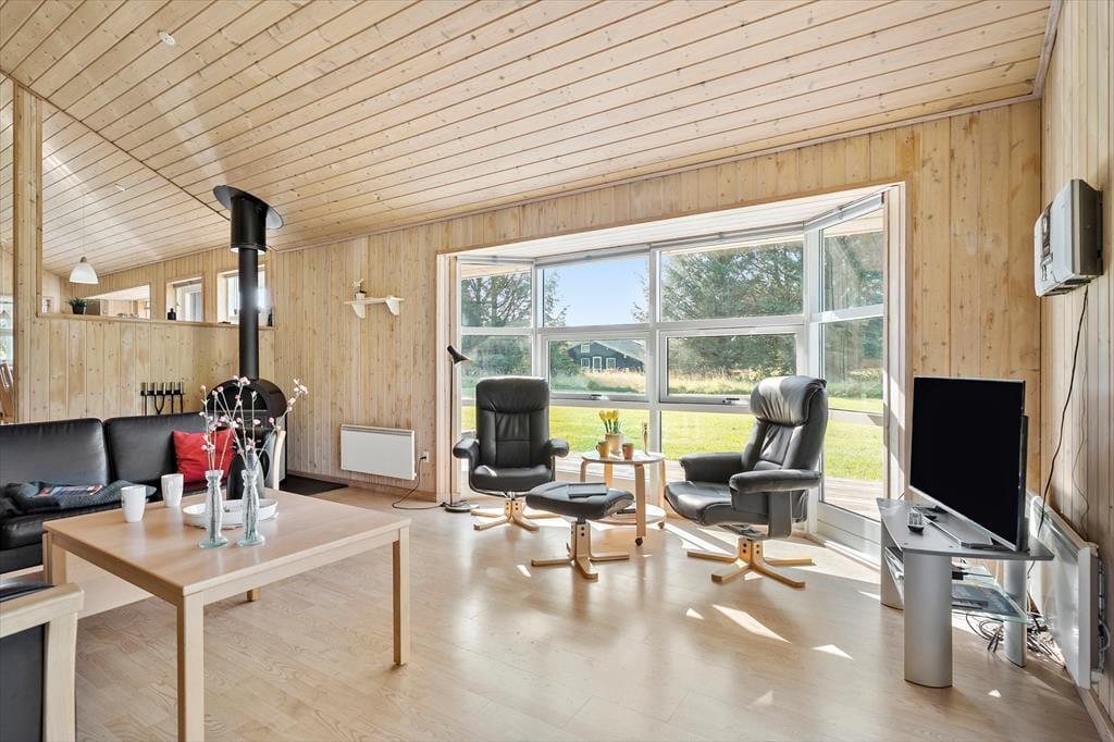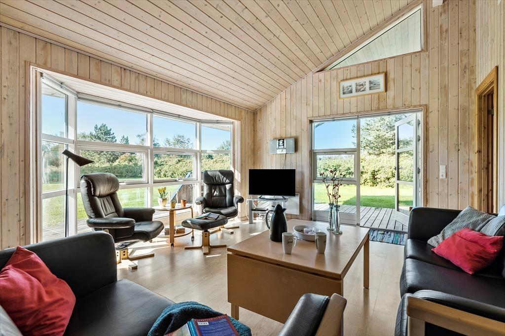 Sommerhuset byder indenfor med en lys og venlig indretning, der straks skaber en hjemlig følelse. Stuen er rummelig og indrettet med komfortable møbler, så du og dine kære kan samles til hyggelige aftener foran brændeovnen. Store vinduer sørger for et dejligt lysindfald og skaber en harmonisk forbindelse mellem inde og ude. Køkkenet ligger i åben forbindelse med stuen, hvilket gør det nemt at tilberede familiens måltider, mens snakken går. Huset har tre soveværelser, der alle indbyder til afslapning, og badeværelset er både praktisk og indbydende – perfekt til at lade op til en ny dag fyldt med ferieoplevelser.
