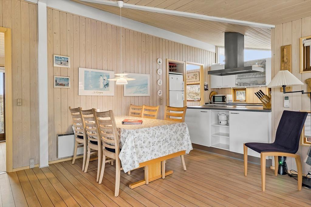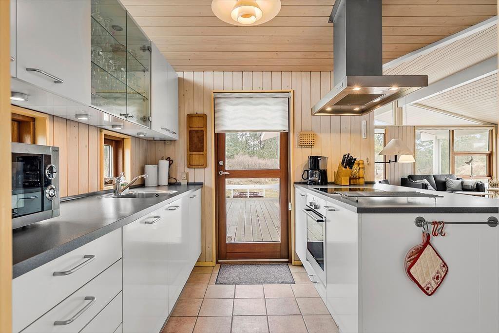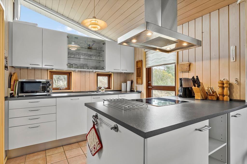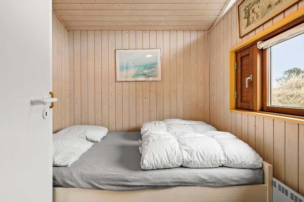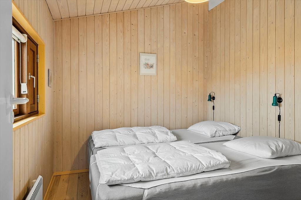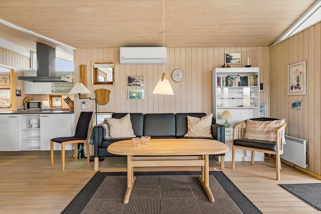 Indenfor byder sommerhuset dig velkommen med en lys og imødekommende atmosfære, der straks skaber en følelse af afslapning. Det rummelige opholdsrum er hjemligt indrettet med en brændeovn, der indbyder til hyggelige aftener, når solen er gået ned. Store vinduer sørger for et smukt lysindfald og udsigt til de grønne omgivelser udenfor. Køkkenet er praktisk og ligger i åben forbindelse med stuen, så du kan være med i samtalen, mens du tilbereder lækre feriemåltider. De tre soveværelser giver ro og plads til en god nats søvn, og badeværelset er lyst og funktionelt – ideelt til at starte dagen frisk og veludhvilet.