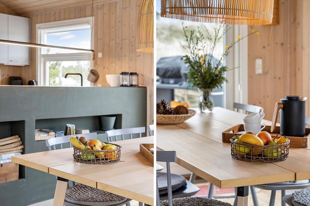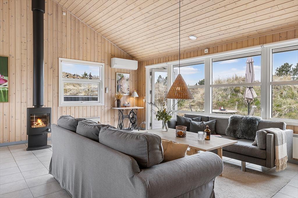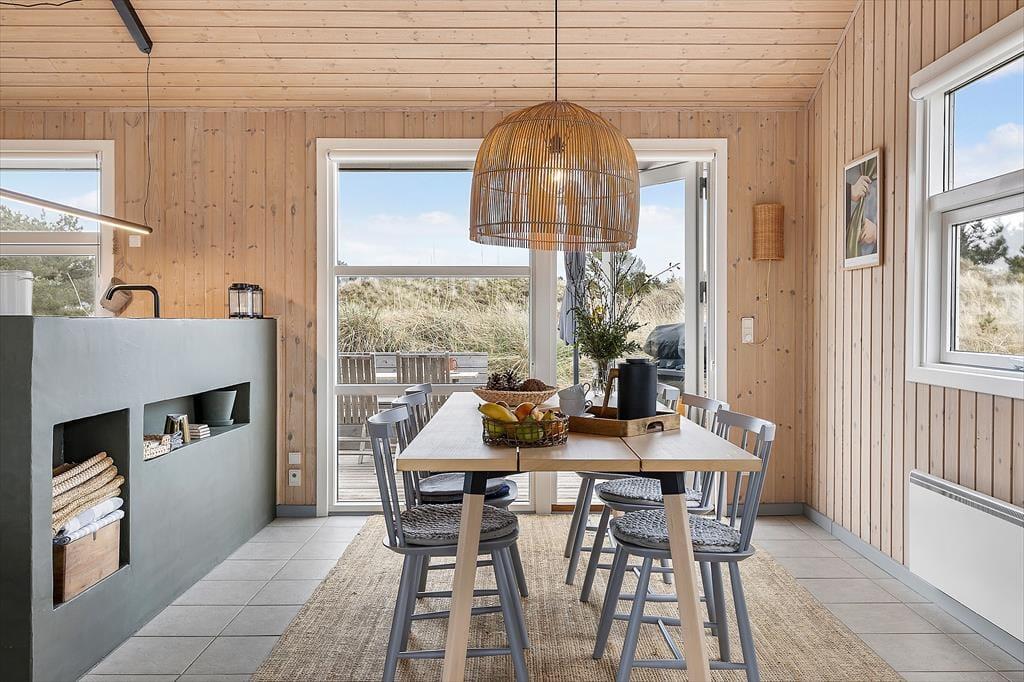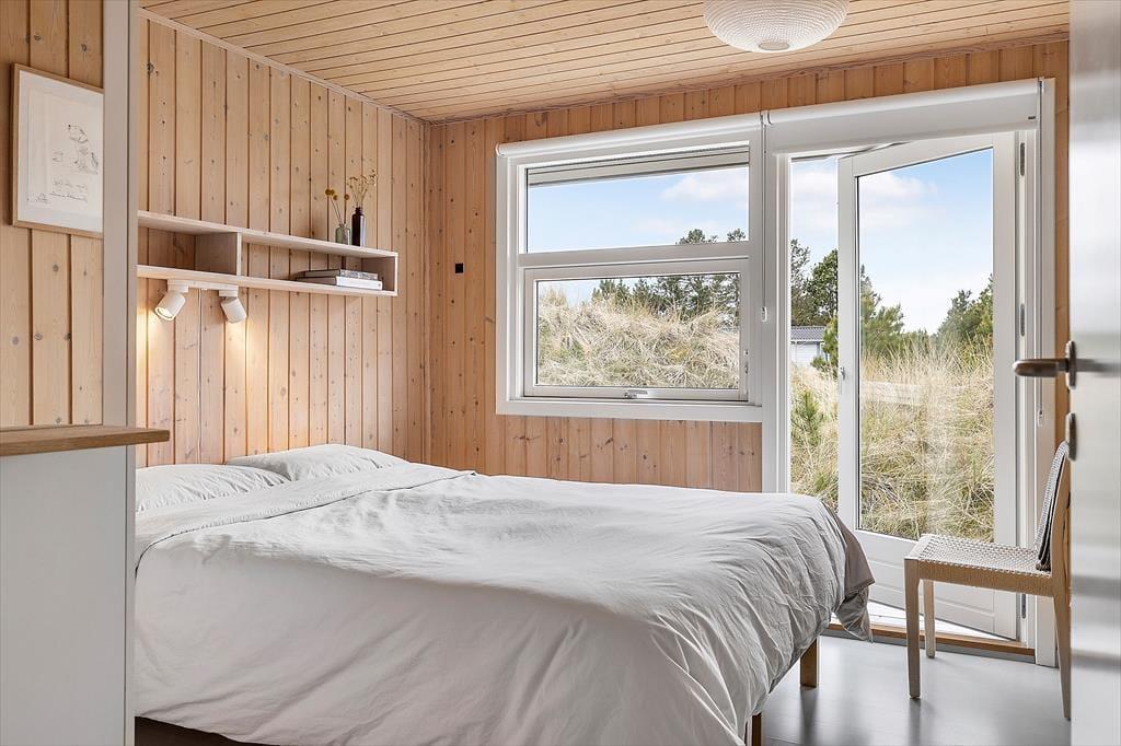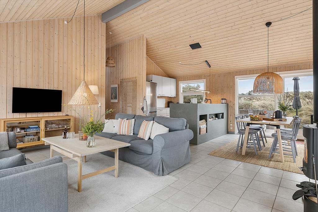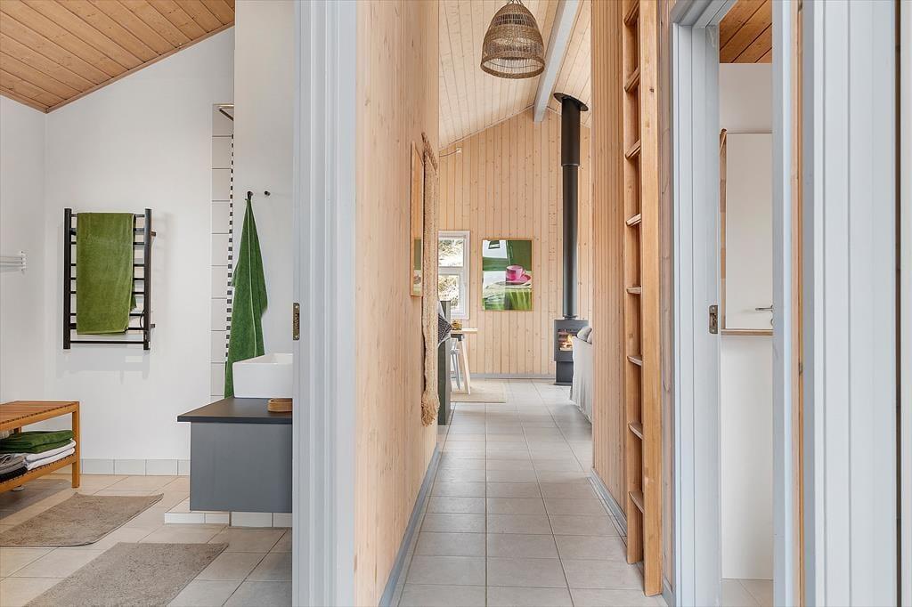 Indenfor møder du en lys og rummelig atmosfære, der straks giver dig følelsen af at være hjemme. Sommerhusets store stue med åbent køkken er familiens naturlige samlingspunkt, hvor I kan tilbringe timer med samtaler, spil eller hyggestunder foran brændeovnen. Det store badeværelse emmer af komfort og afslapning med god plads og rolige omgivelser, der inviterer til en pause fra hverdagens stress. Husets værelser er indrettet til at give dig ro og velvære, så du kan vågne op til fuglesang og sollys gennem vinduerne.