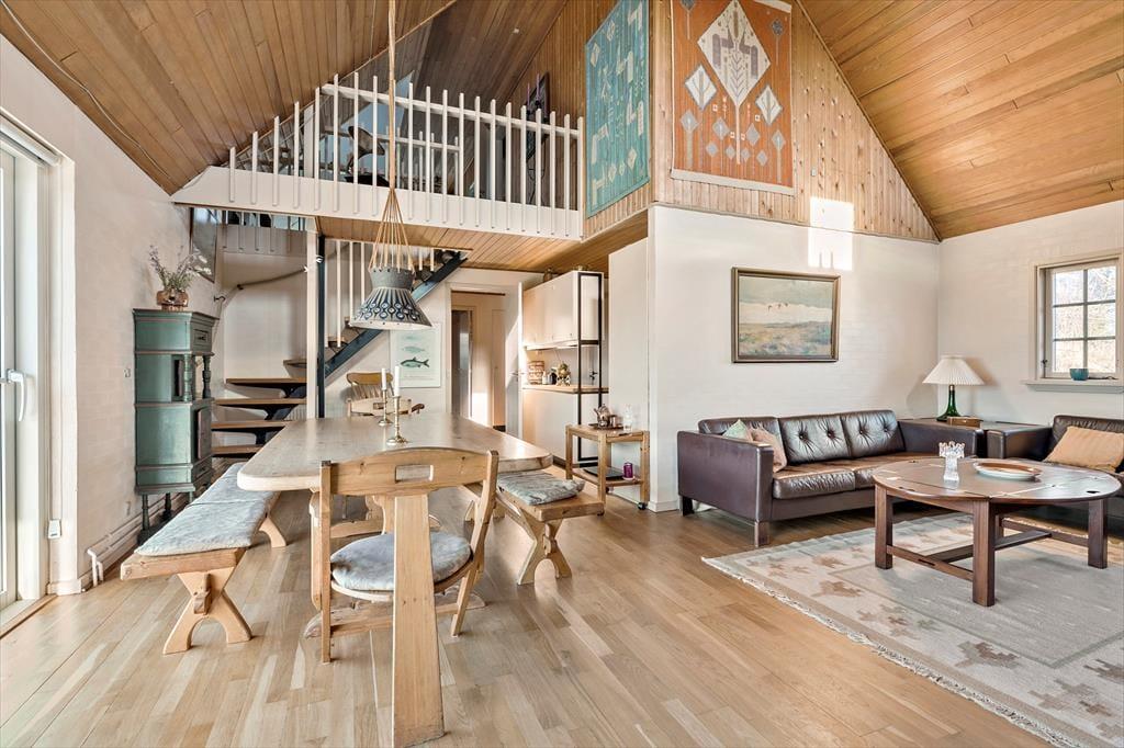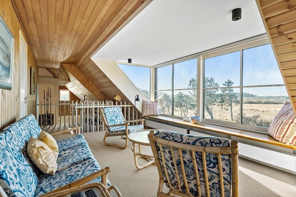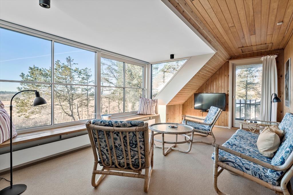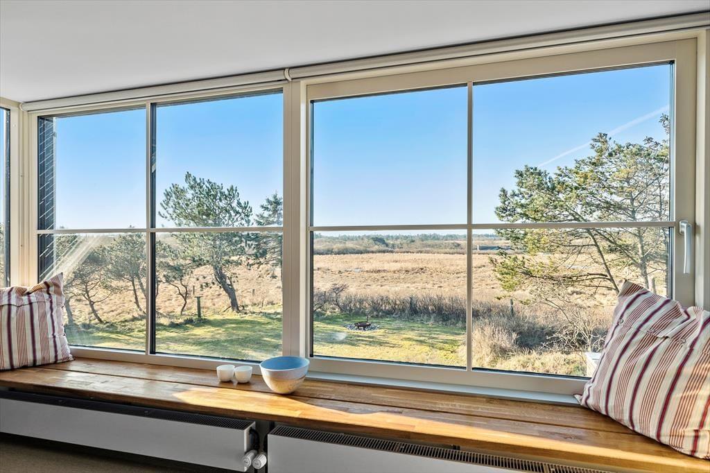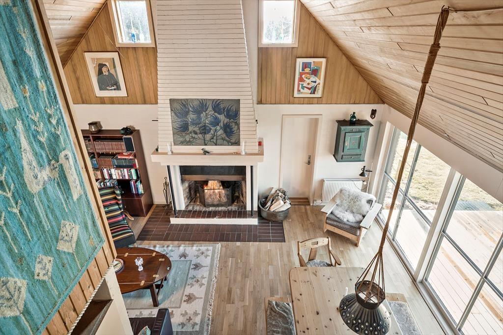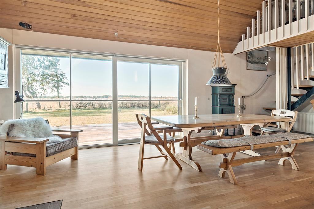 Indenfor i sommerhuset venter der dig og dine kære en lys og imødekommende atmosfære med højt til loftet og god plads at brede sig på. I den rummelige stue strømmer dagslyset ind fra flere sider, og sammen med loftet til kip skabes der en dejlig lethed og rummelighed i hele opholdsrummet. Her er pejsen også klar til at lune, når dagen går på hæld og aftenhyggen begynder – og mens ilden knitrer sagte, kan du læne dig tilbage i sofaen og lade roen falde på. Det separate køkken ligger praktisk placeret i forhold til stuen, så du let kan tilberede morgenkaffen eller en god middag uden at gå glip af snakken og fællesskabet. Når du træder hen til vinduerne, kan du lade blikket vandre ud over det fredede naturområde, der breder sig bag huset – en udsigt, som med garanti vil følge dig på nethinden, længe efter ferien er slut.