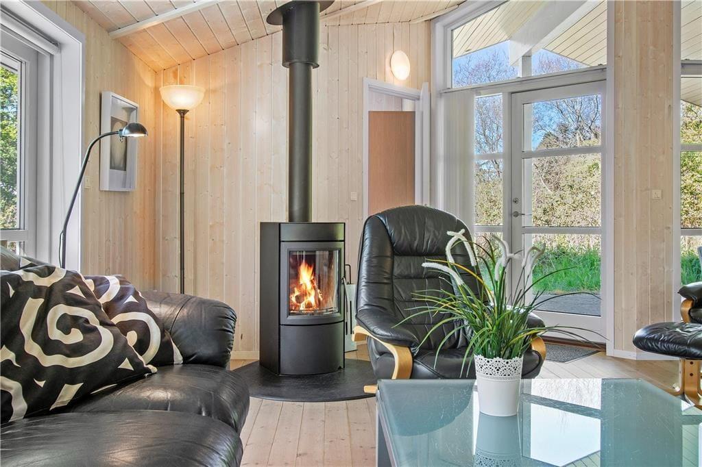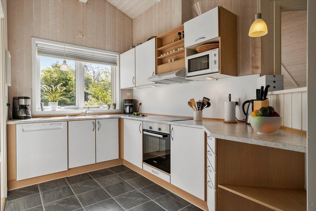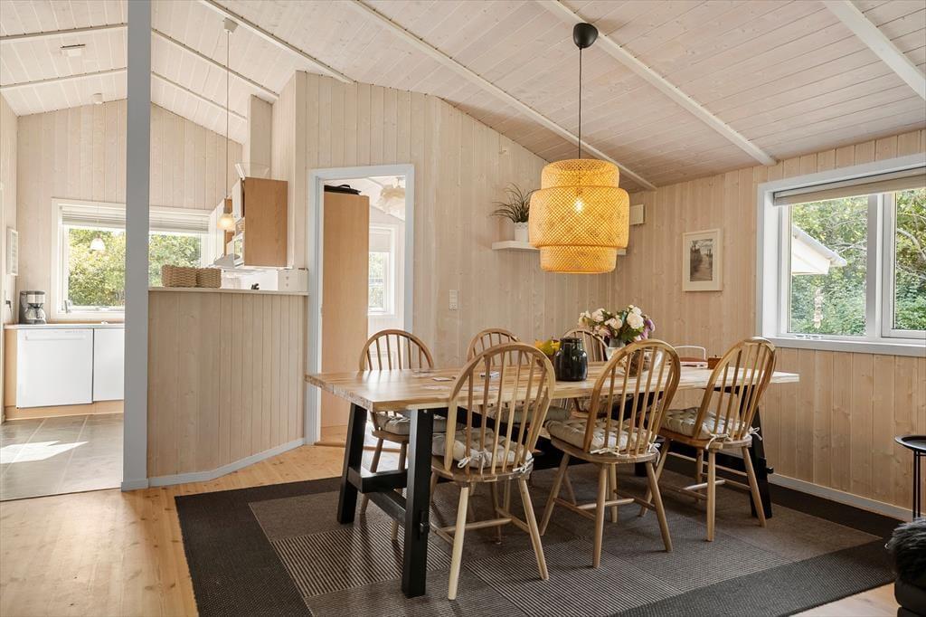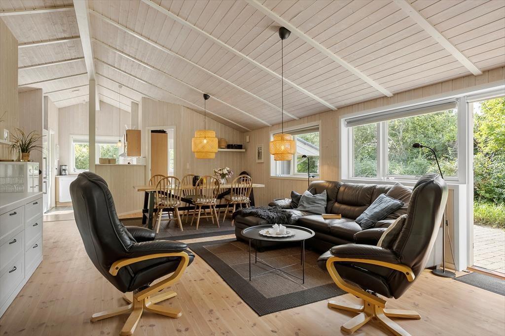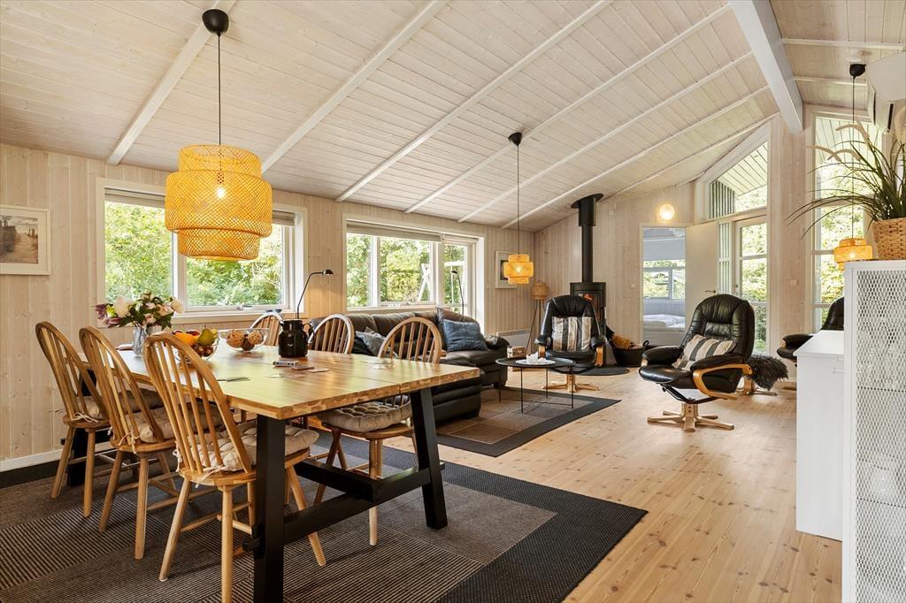 Når du træder indenfor i sommerhuset, bliver du mødt af et lyst og venligt indre med store vinduespartier, der lukker lyset og naturen ind. Huset er indrettet med en gennemtænkt planløsning, der gør det velegnet til to familier. De åbne opholdsrum indbyder til fællesskab, mens værelserne giver plads til privatliv og ro. Stuen er husets naturlige samlingspunkt, hvor du kan slappe af i de bløde møbler og nyde udsigten til de rolige omgivelser. Køkkenet er åbent og veludstyret, så du let kan tilberede måltider, mens børnene leger i nærheden.
