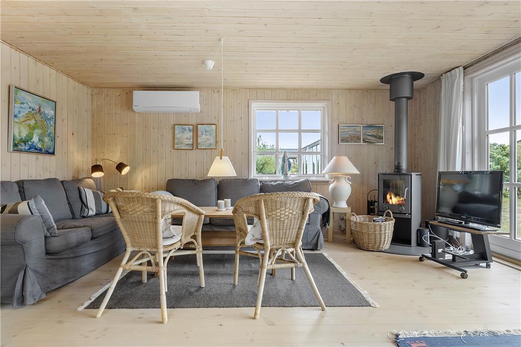 Når du træder indenfor, bliver du mødt af en varm og indbydende stemning. De store vinduer i opholdsstuen sørger for, at lyset strømmer ind og giver et fantastisk kig til det omkringliggende naturlandskab. Indretningen er hyggelig og funktionel med fokus på komfort og samvær. Her er plads til at samle familien til en god middag, hyggelige samtaler eller en afslappende stund i sofaen med en bog. Køkkenet ligger i åben forbindelse med stuen, hvilket gør det nemt at være sammen, mens dagens måltider tilberedes.