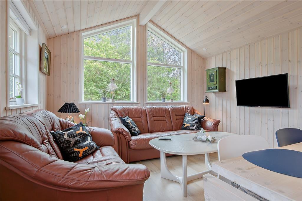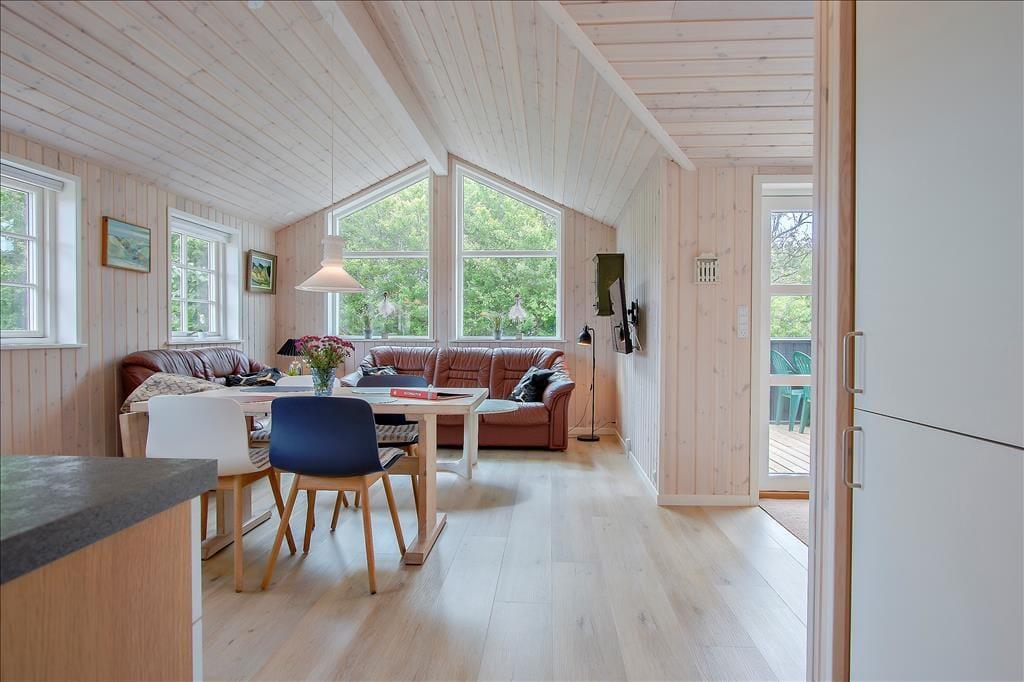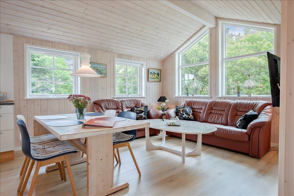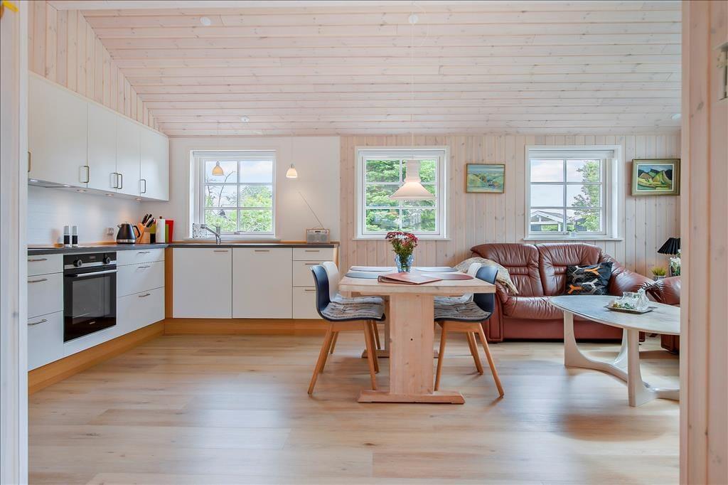 Sommerhuset byder dig velkommen med en varm og lys indretning, der straks skaber en følelse af hjemlig hygge. De store vinduer lukker det naturlige lys ind og giver en dejlig udsigt til de grønne omgivelser. Stuen er perfekt til afslapning efter en dag ved stranden, og med det åbne køkken-alrum kan hele familien samles om madlavning og måltider. Her kan du nemt forestille dig hyggelige aftener med kortspil, film eller bare gode samtaler.
