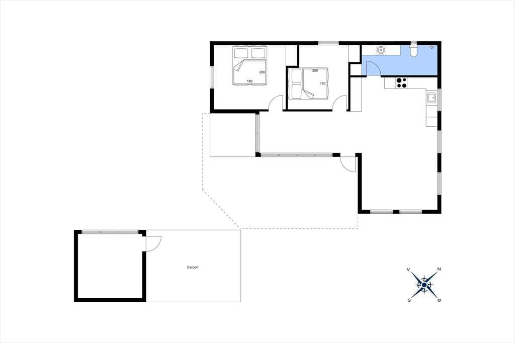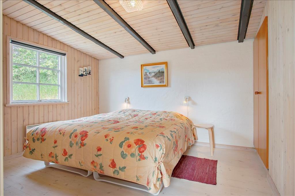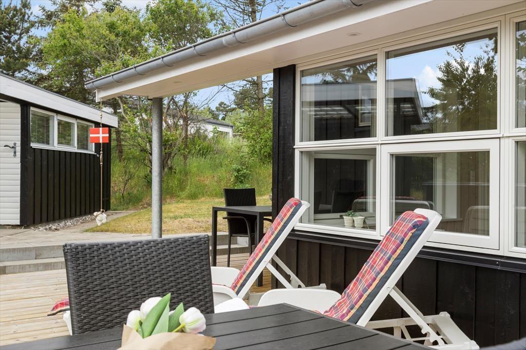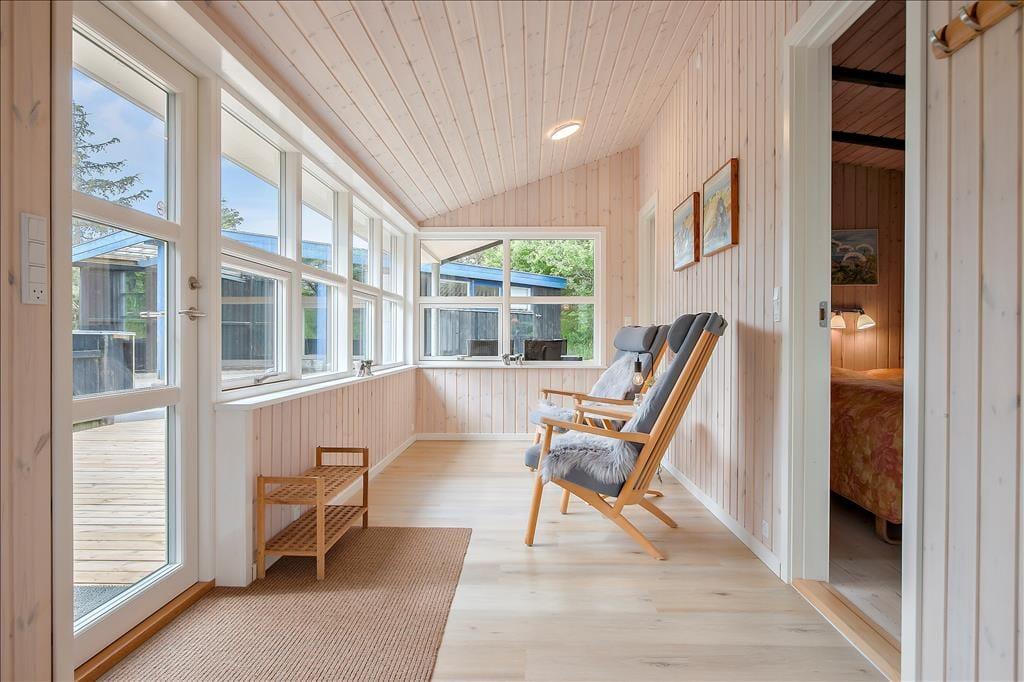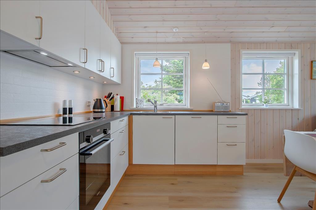 Sommerhuset byder dig velkommen med en varm og lys indretning, der straks skaber en følelse af hjemlig hygge. De store vinduer lukker det naturlige lys ind og giver en dejlig udsigt til de grønne omgivelser. Stuen er perfekt til afslapning efter en dag ved stranden, og med det åbne køkken-alrum kan hele familien samles om madlavning og måltider. Her kan du nemt forestille dig hyggelige aftener med kortspil, film eller bare gode samtaler.