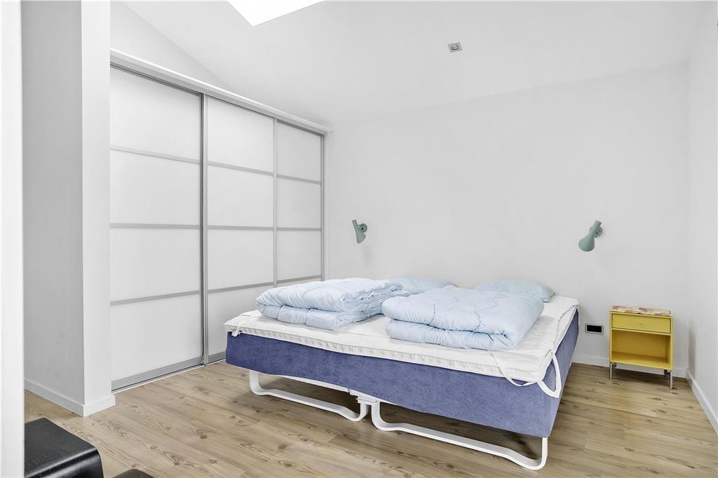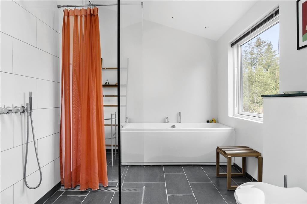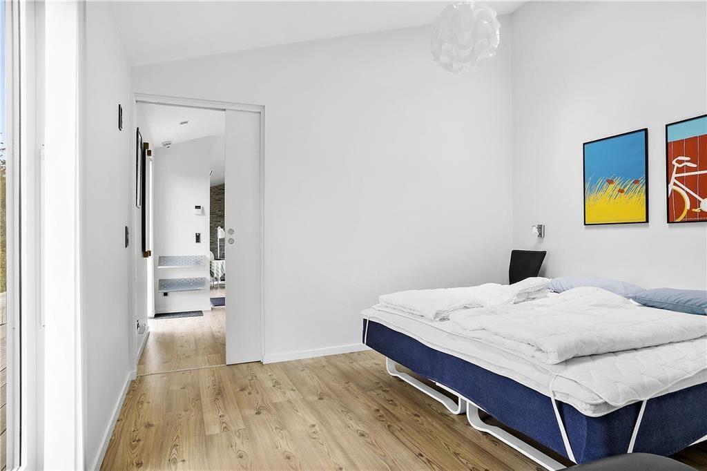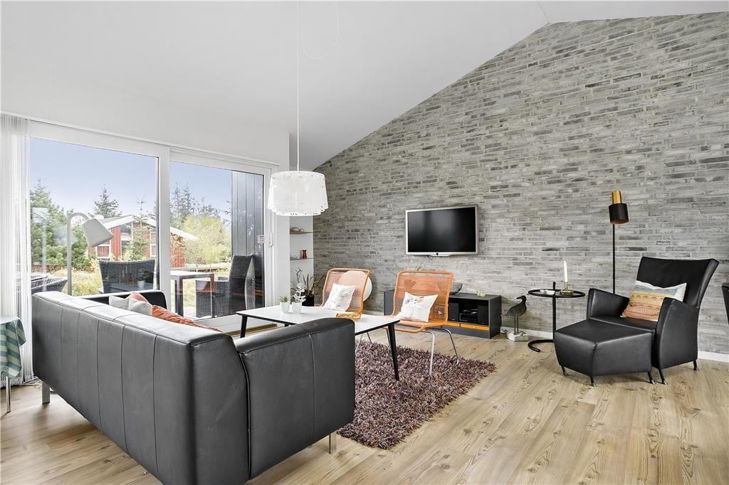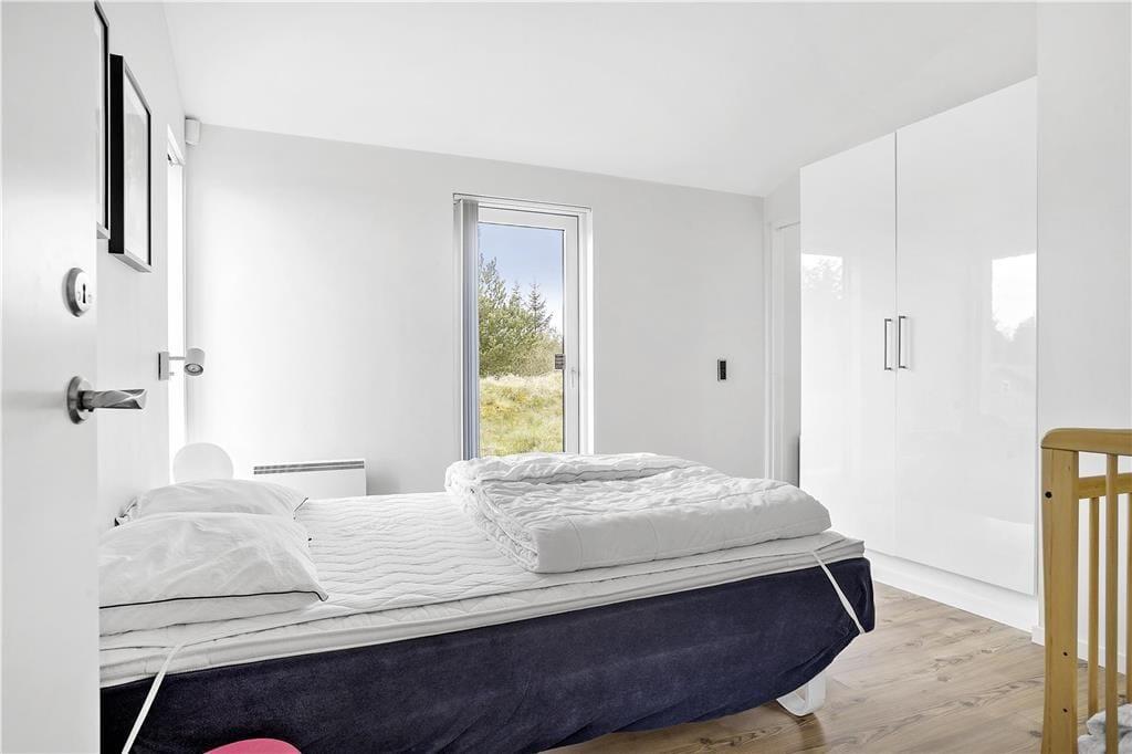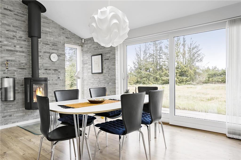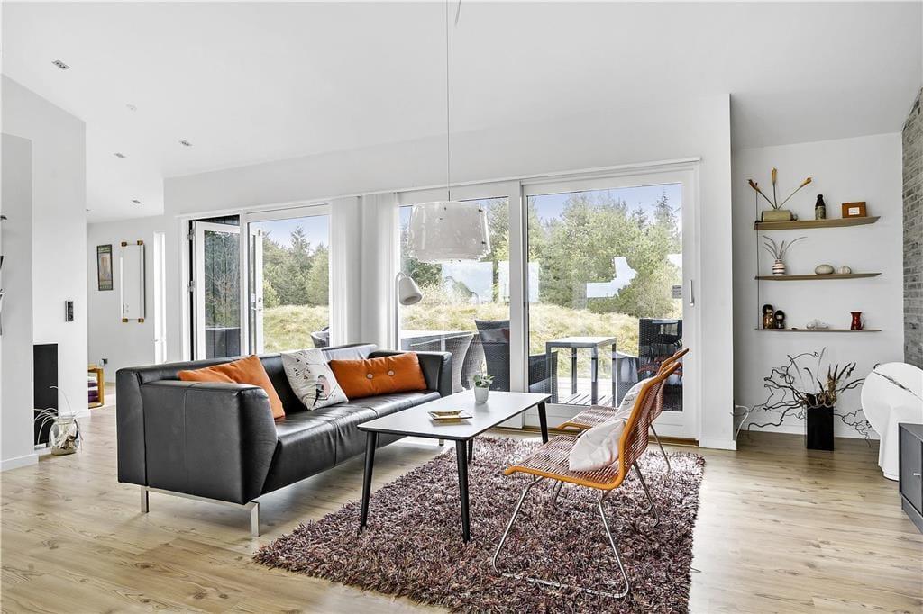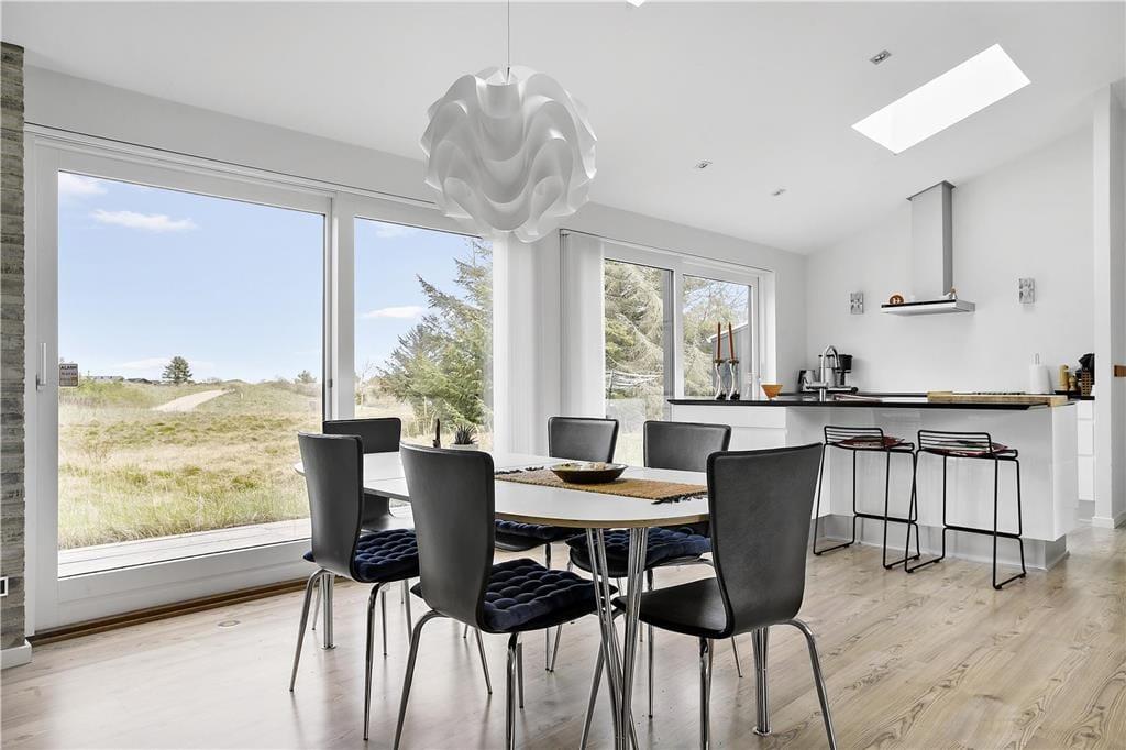 Sommerhuset byder dig velkommen med en lys og moderne indretning, hvor store vinduer sikrer masser af naturligt lys og en følelse af rummelighed. Den åbne planløsning mellem køkken og stue gør det nemt at være sammen, uanset om du står for madlavningen eller slapper af med en bog. Indretningen er smagfuld og hyggelig, og fra næsten alle rum kan du nyde udsigten til den omkringliggende natur – ofte med rådyr eller harer som dine nærmeste naboer. Det er et hjem, der føles som en oase af ro og komfort.