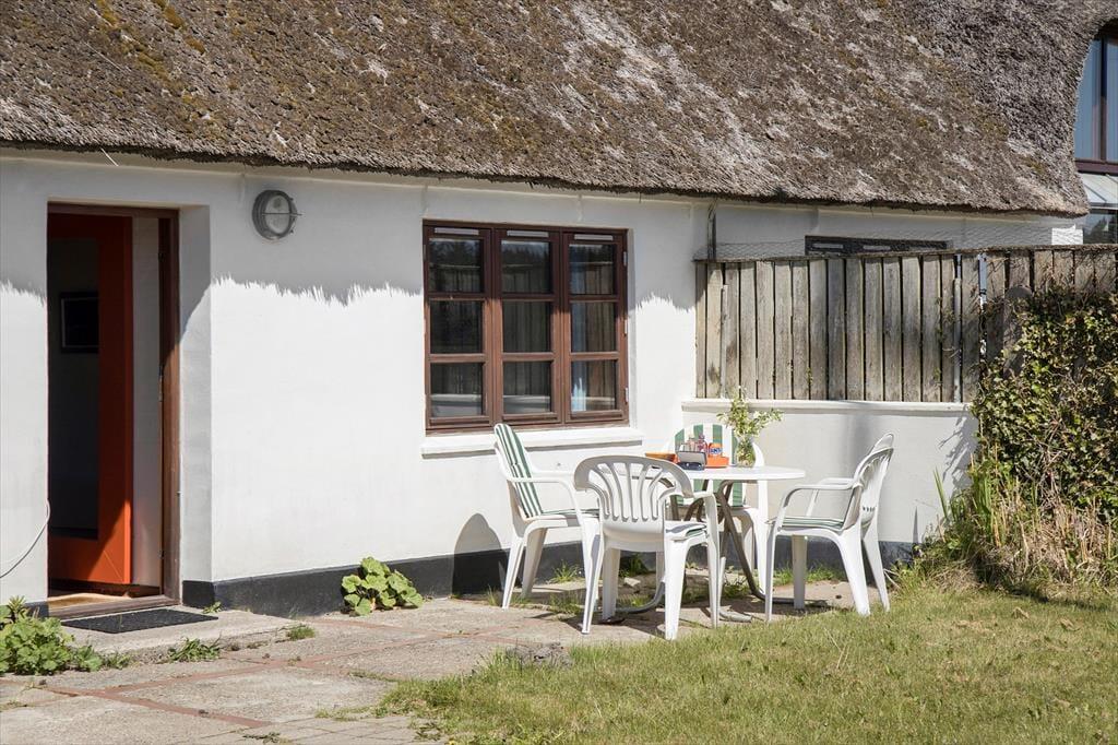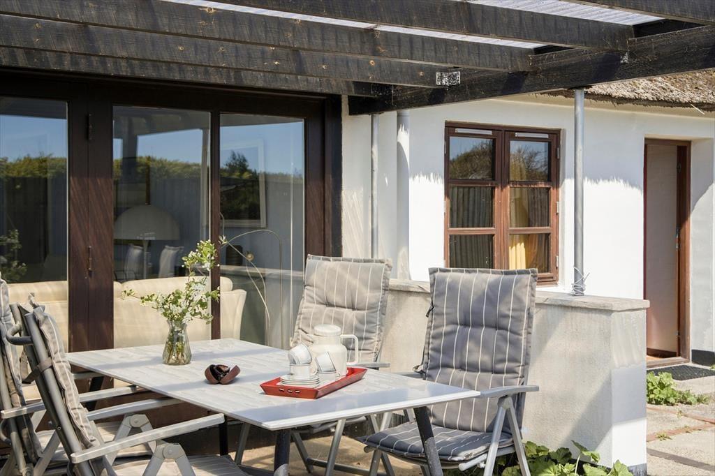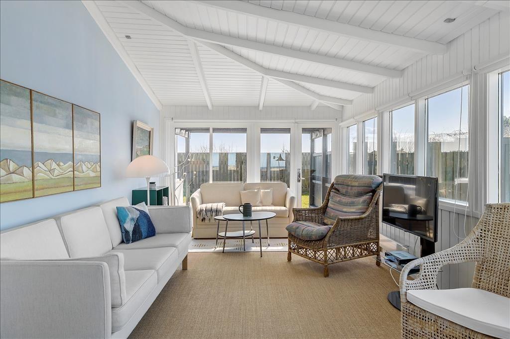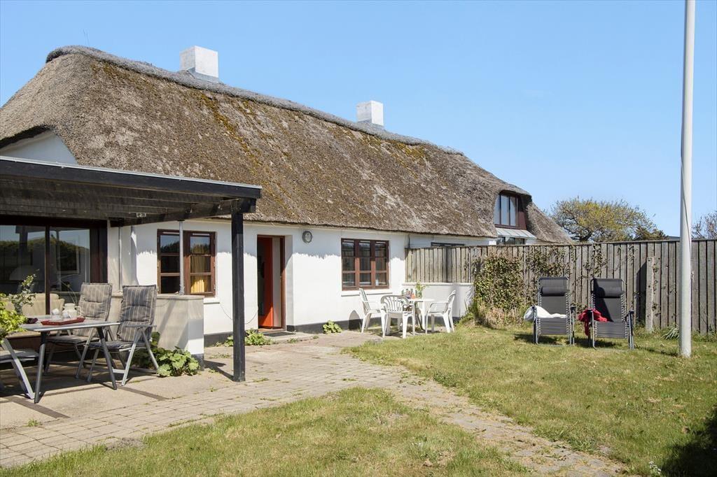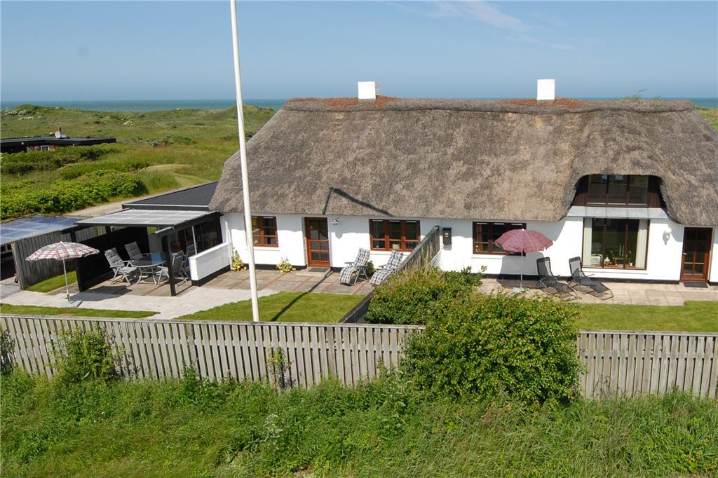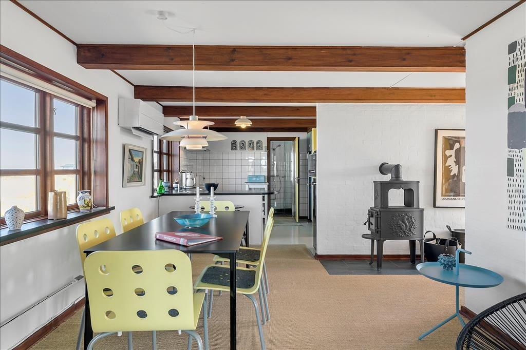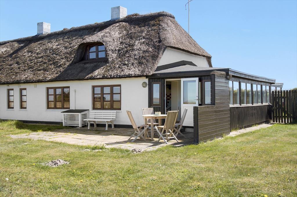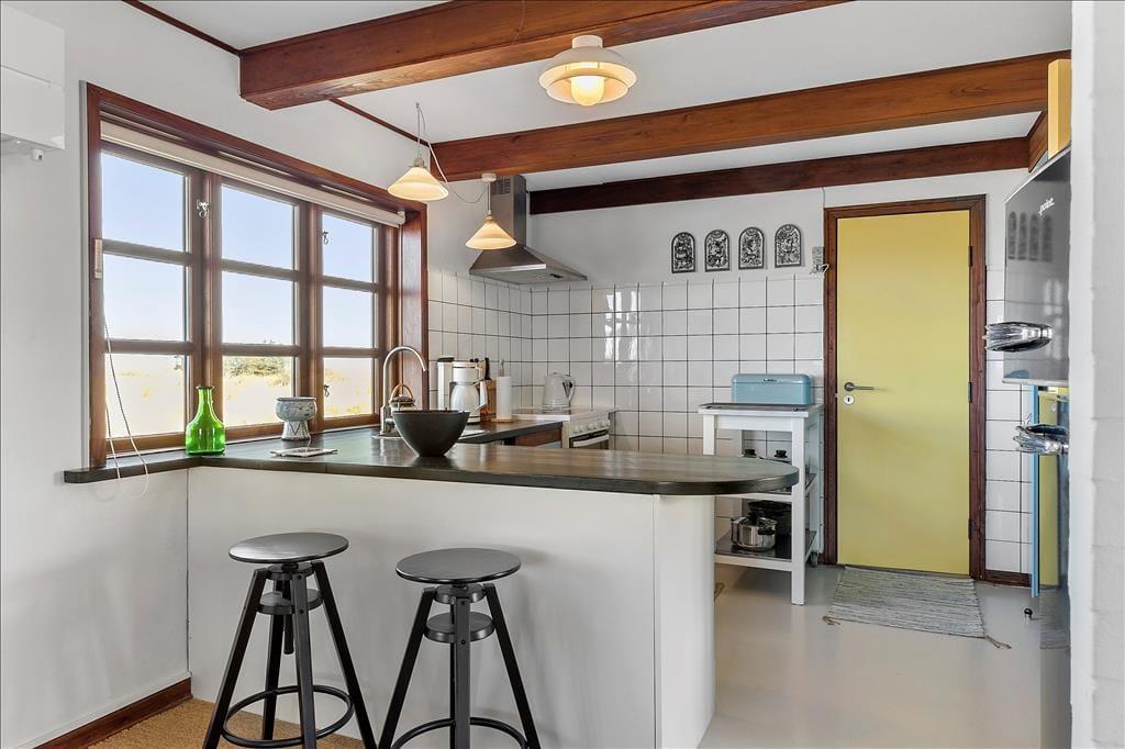 Indenfor bliver du mødt af en lys og luftig atmosfære, hvor de store vinduer trækker naturen helt ind i rummene. Den stråtækte ejendom emmer af charme, og den gennemførte indretning skaber en følelse af ro og hygge. De åbne fællesarealer er som skabt til kvalitetstid med familie og venner, og de rummelige værelser sikrer, at alle kan finde deres eget fristed. Køkkenet er både funktionelt og indbydende – det perfekte sted at tilberede måltider, mens du nyder udsigten til klitterne.
