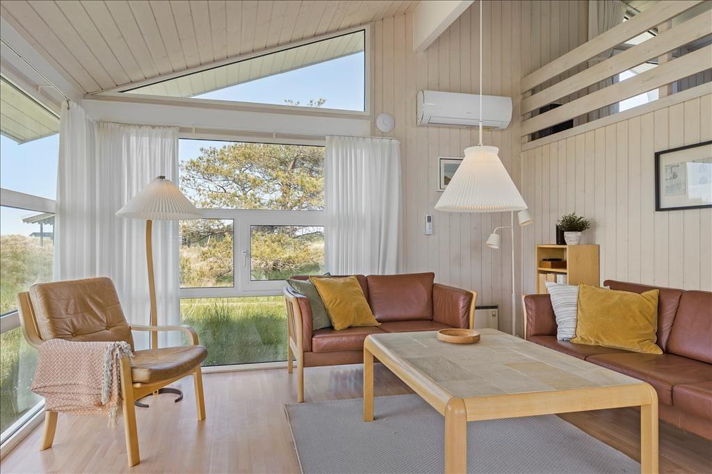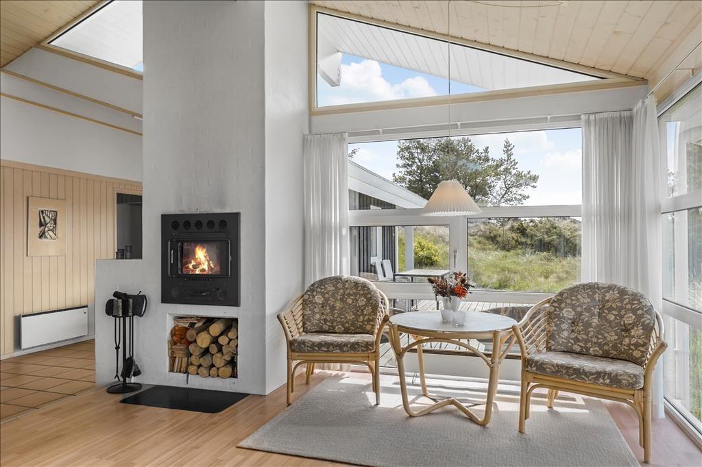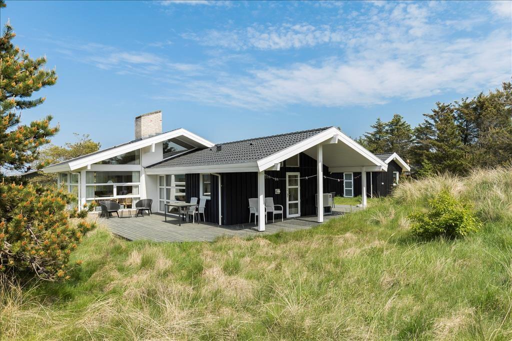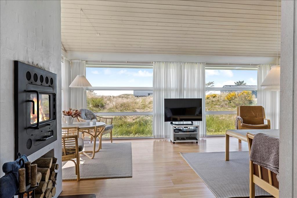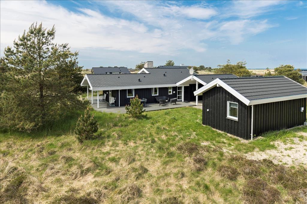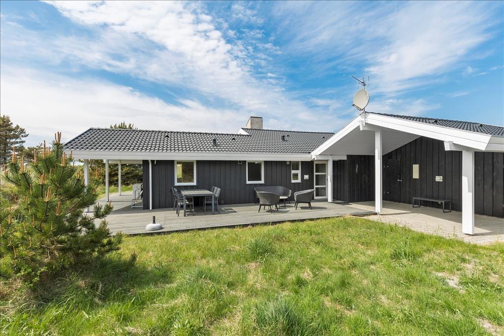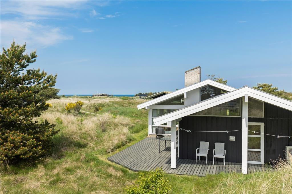 Haven og terrasserne omkring sommerhuset er ideelle til lange dage under åben himmel. Den store terrasse giver plads til både morgenkaffe, solbadning og hyggelige grillaftener med familie og venner. Naturgrunden omkring huset er fredfyldt og indbyder til afslapning og leg for både børn og voksne. Her kan du nyde fuglenes kvidren, vinden i træernes kroner og den forfriskende duft af hav. En kort tur på fødderne fører dig til klitterne og stranden, hvor du kan samle strandskaller eller blot nyde synet af Vesterhavets brusende bølger.