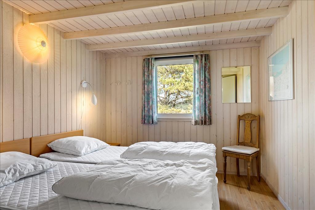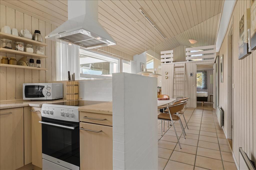 Inde i sommerhuset bliver du mødt af et lyst og luftigt interiør, hvor rummene åbner sig op og inviterer naturens lys helt indenfor. De store vinduespartier i stuen skaber en smuk forbindelse mellem inde- og udelivet og giver en fantastisk udsigt til den omgivende naturgrund. Stuen er hyggeligt indrettet med komfortable møbler og en brændeovn, der spreder varme og skaber en stemningsfuld ramme om aftener med spil, bøger eller en god film. Det åbne køkken ligger i forbindelse med stuen, så hele familien kan være sammen, mens maden tilberedes. Sommerhuset råder over tre soveværelser, som alle byder på ro og hvile, og et funktionelt badeværelse, der gør ferien nem og bekvem.