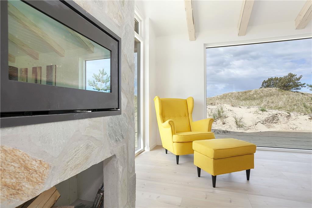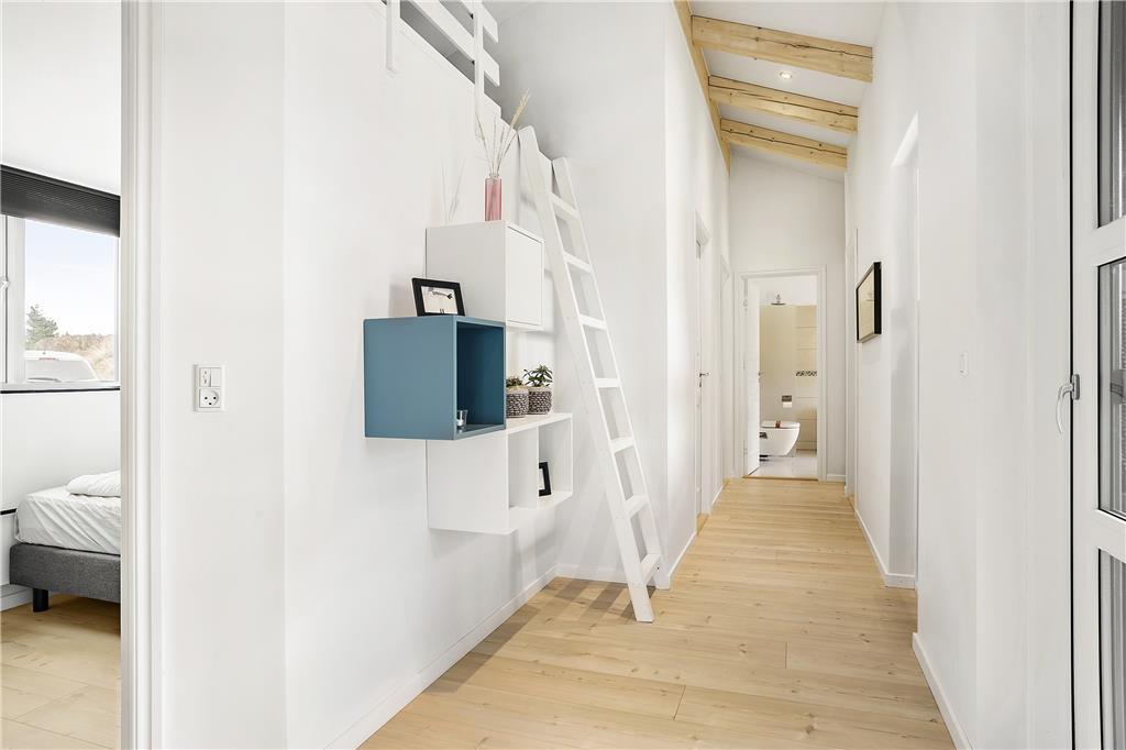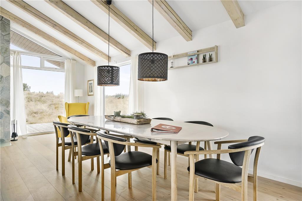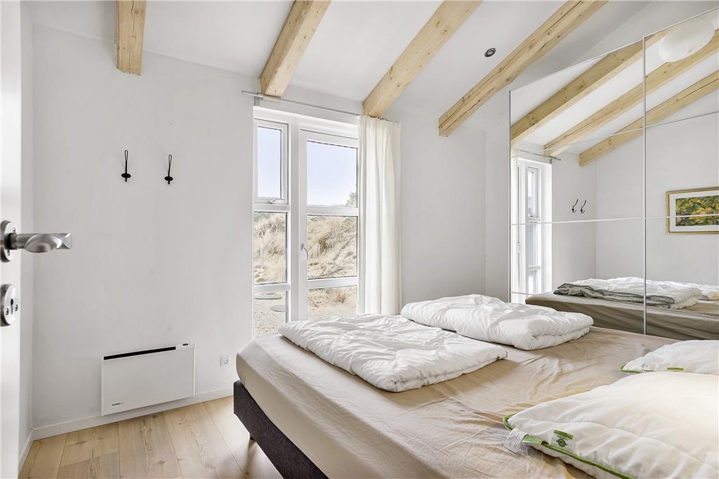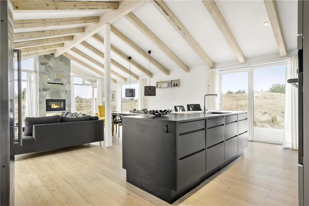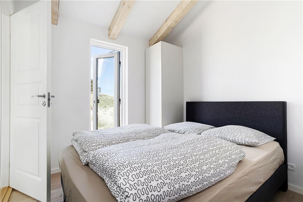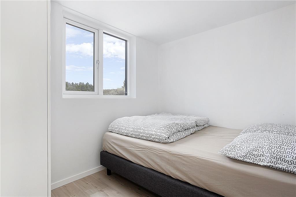 Når du træder ind i sommerhuset, bliver du mødt af et lyst og åbent opholdsrum med højt til loftet, der giver en fornemmelse af rummelighed og frihed. Store vinduer lukker lyset og naturen helt ind, mens den varme og hyggelige indretning skaber en hjemlig stemning. Køkkenet er åbent og forbinder sig smukt med stuen, hvor du kan slappe af i komfortable møbler foran brændeovnen. Soveværelserne er indrettet med tanke på afslapning og ro, så du kan vågne op til fuglesang og føle dig helt udhvilet.