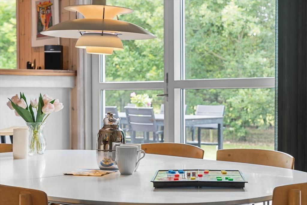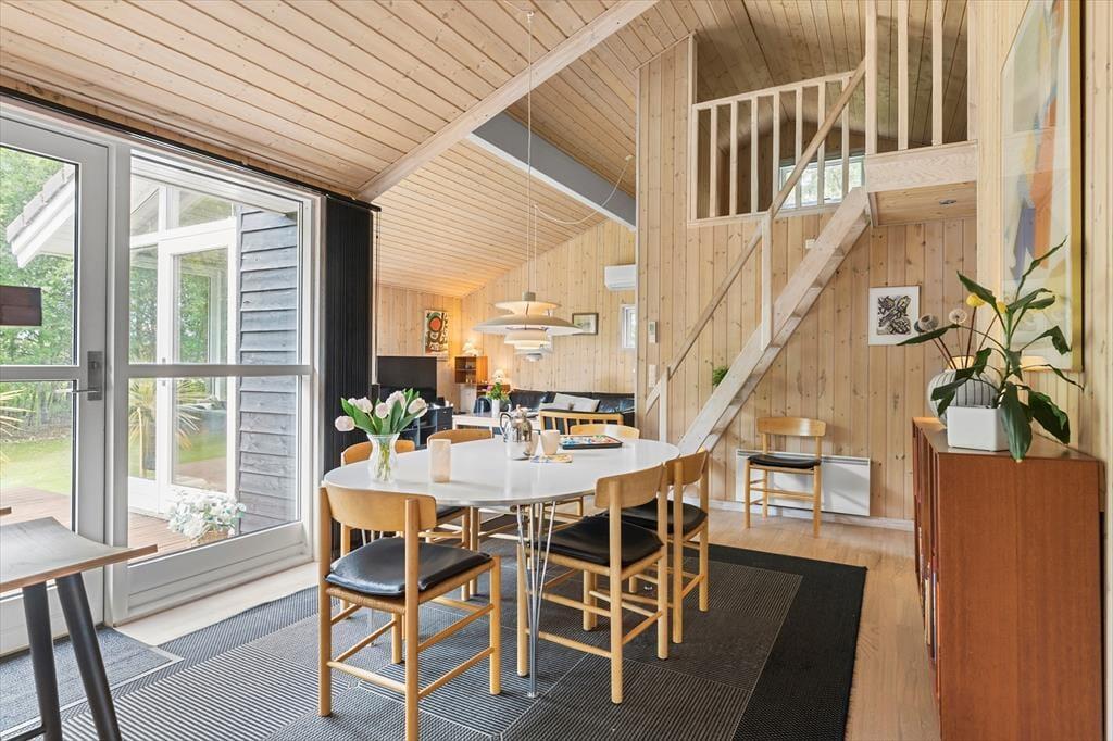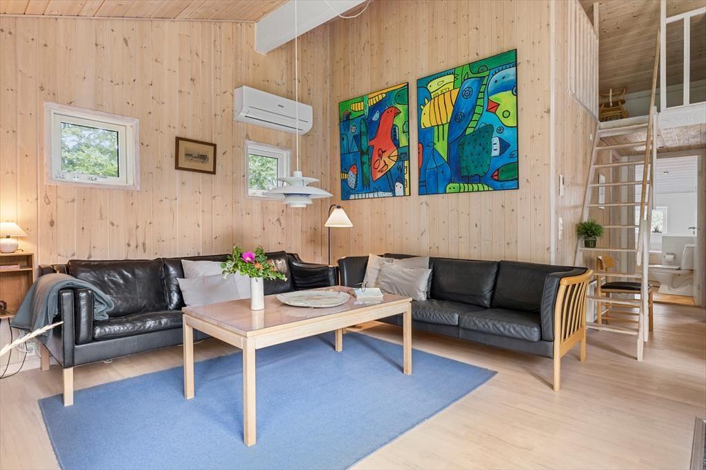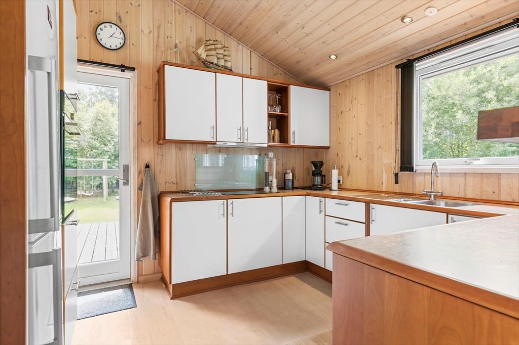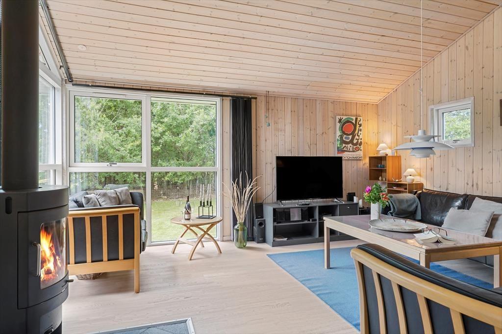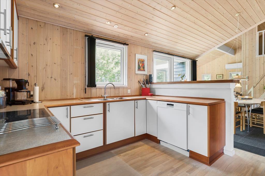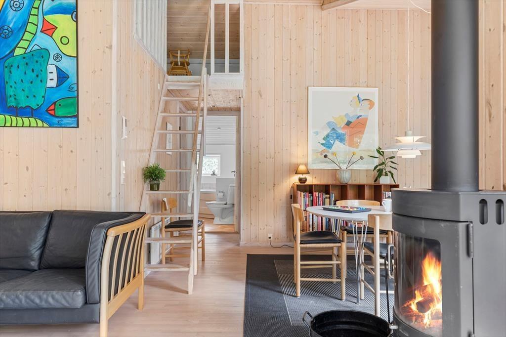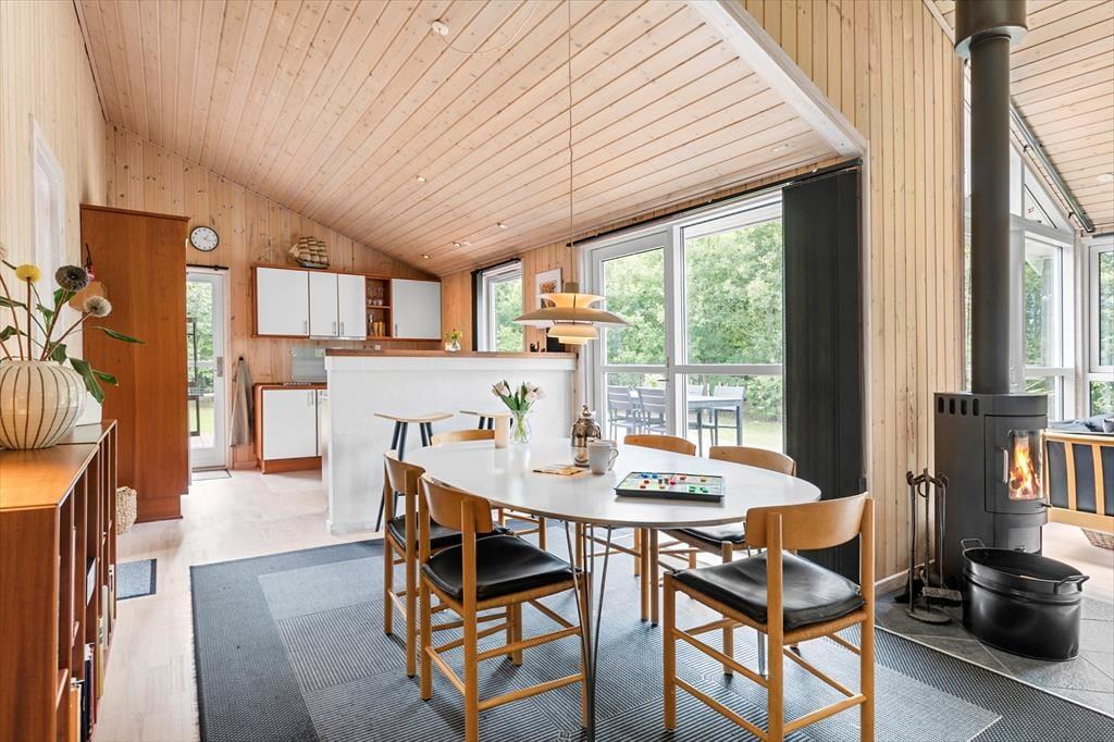 Når du træder ind i dette velholdte sommerhus, bliver du mødt af en lys og rummelig atmosfære. Loftet til kip og de store vinduespartier lader lyset strømme ind og skaber en fornemmelse af åbenhed og nærhed til naturen udenfor. Stuen er indrettet med et hyggeligt sofahjørne og en brændeovn, der gør aftenerne ekstra behagelige. Det åbne køkken ligger i forbindelse med opholdsrummet, hvilket gør det nemt at være sammen, mens maden tilberedes. Huset byder på hyggelige soveværelser, hvor der er fokus på afslapning og god søvn, så du vågner frisk og klar til en ny dag fyldt med oplevelser.