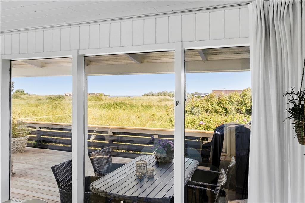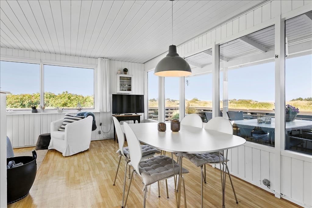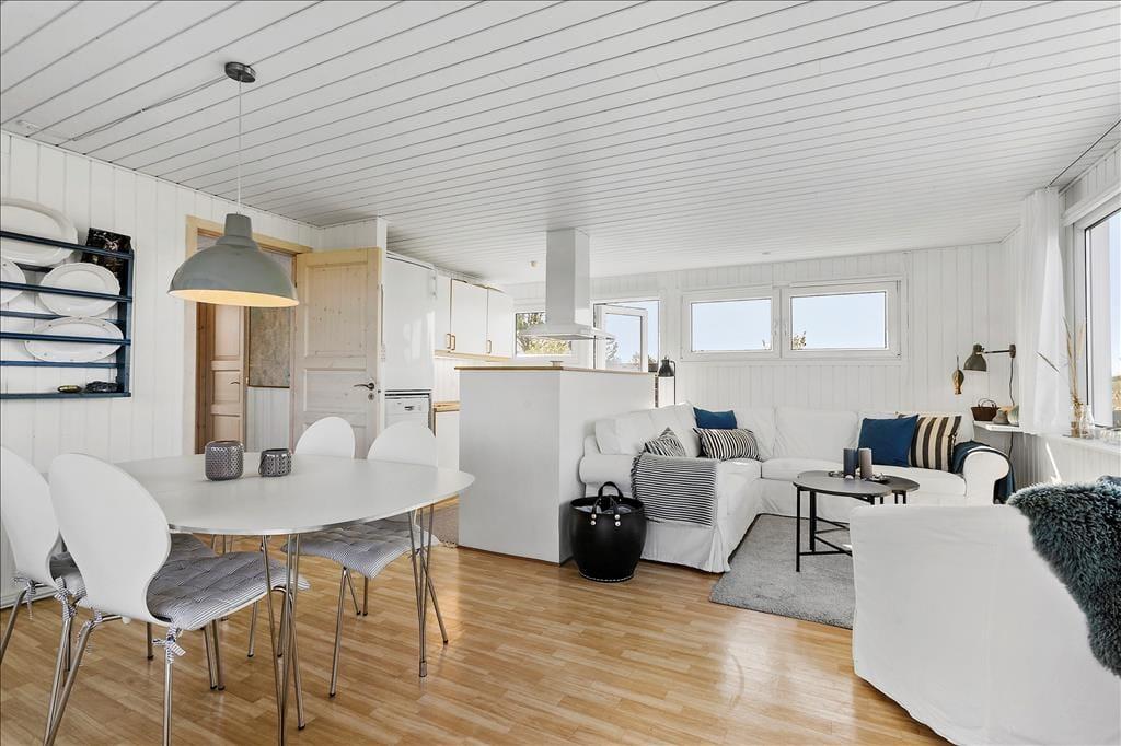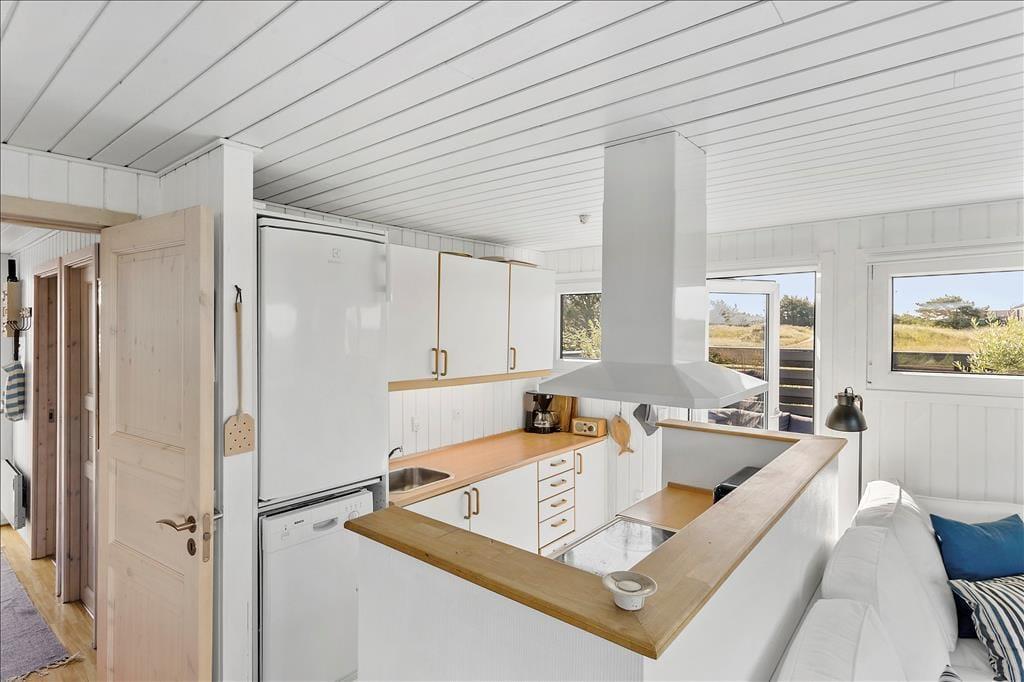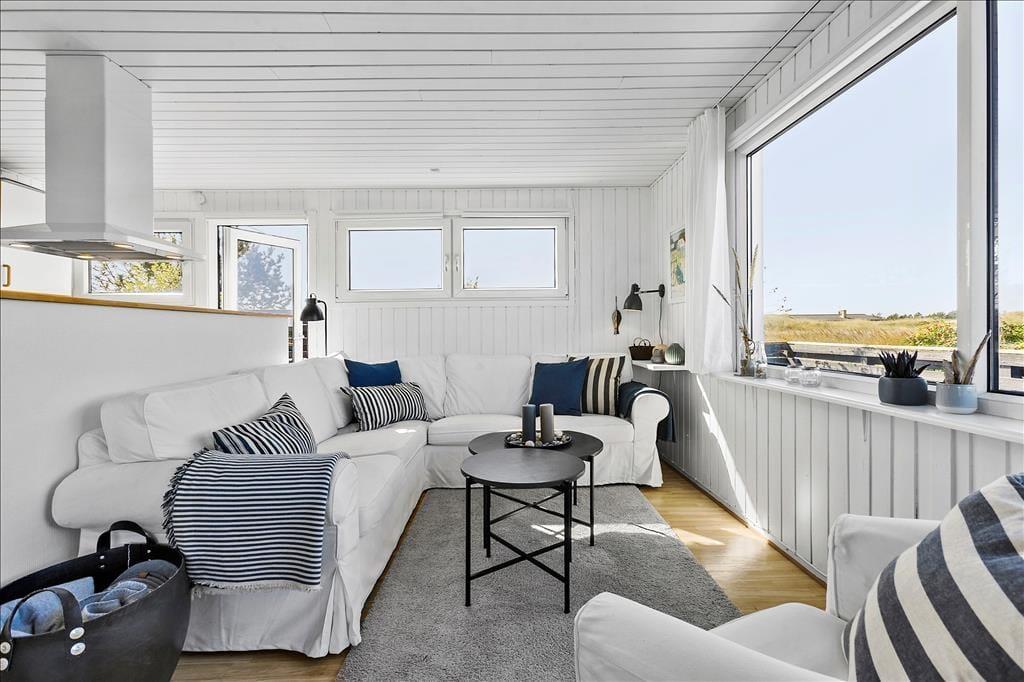 Når du træder indenfor i sommerhuset, bliver du mødt af et lyst og indbydende opholdsrum, hvor stuen og det åbne køkken smelter sammen i en hyggelig helhed. Store vinduespartier trækker lyset indenfor og skaber en dejlig fornemmelse af nærhed til naturen – og fra sofaen kan du nyde kigget ud over de fredede arealer, der breder sig bag huset. Indretningen er enkel og hjemlig, og her er plads til at trække sig tilbage, læse en bog eller nyde et måltid sammen med dem, du holder af. Når du står i køkkenet og rører i gryderne, er du stadig en del af fællesskabet – og det er netop det, der gør ferie i sommerhus så særligt: nærværet, roen og tiden til bare at være sammen.