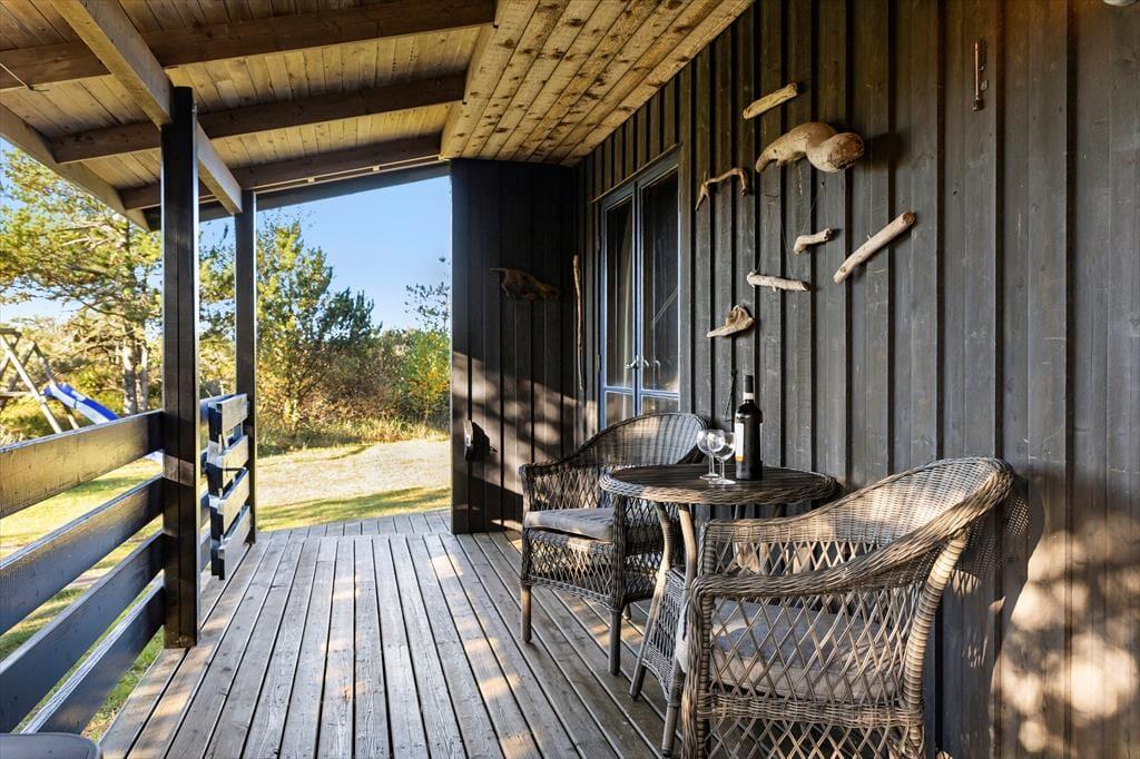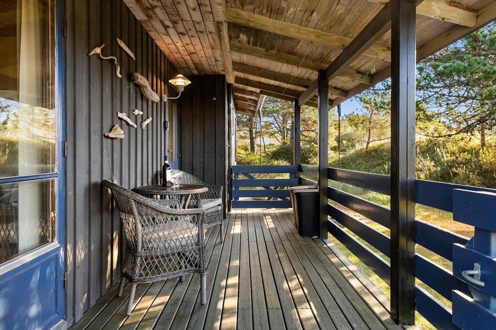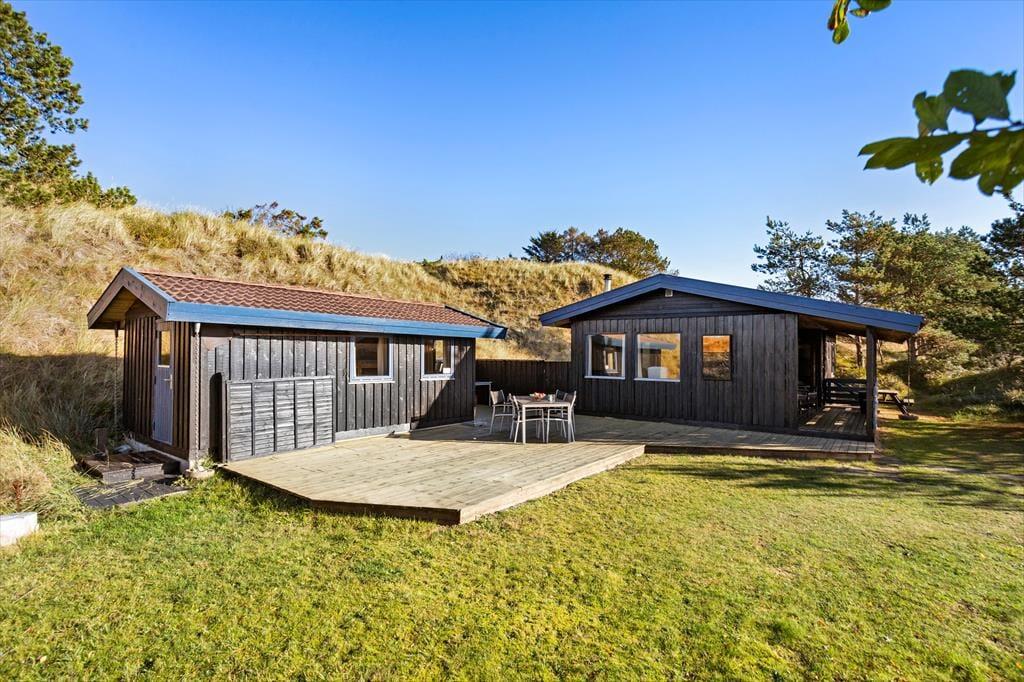 Huset ligger på en skøn naturgrund, hvor en ugenert terrasse skaber rammerne om mange afslappende timer under åben himmel. Her kan du nyde morgenkaffen i ro og mag, grille aftensmaden eller lade børnene lege frit på grunden. Fuglesangen og den friske luft fra Vesterhavet sætter prikken over i’et på din ferie. Hvis du ønsker mere aktivitet, kan du udforske de nærliggende stier og områder i Tversted Klitplantage.