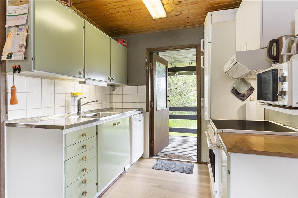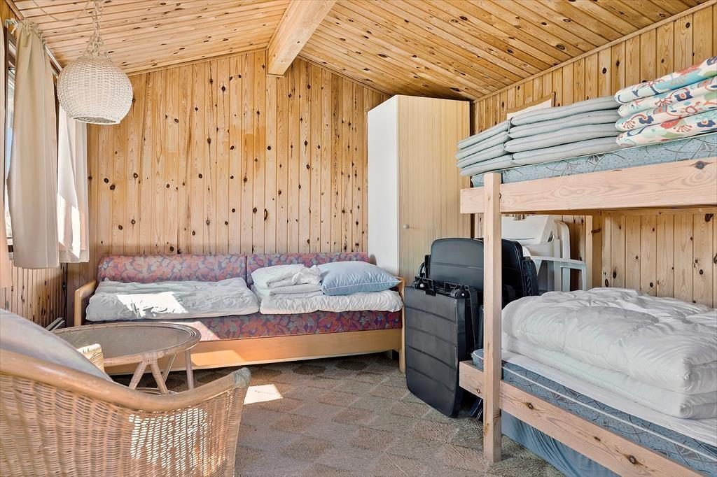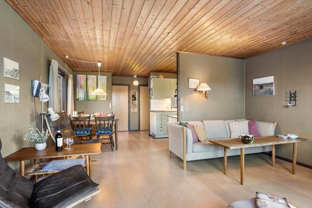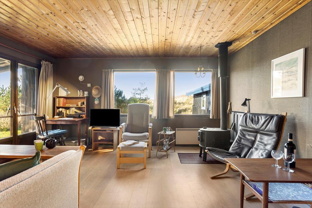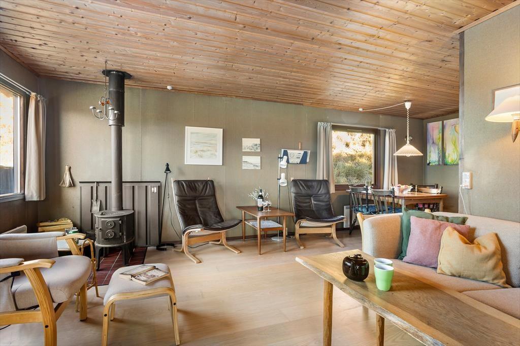 Sommerhuset byder dig velkommen med en lys og indbydende indretning, der straks får dig til at føle dig hjemme. Det åbne opholdsrum skaber en hyggelig atmosfære, hvor familien kan samles om både måltider og afslapning. Stuen har store vinduespartier, der giver et flot lysindfald og en dejlig udsigt til den omkringliggende natur. De komfortable soveværelser giver mulighed for en god nats søvn, og køkkenet er indrettet, så du let kan trylle lækre måltider frem til dig selv og dine nærmeste.