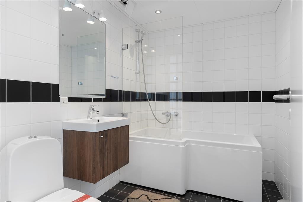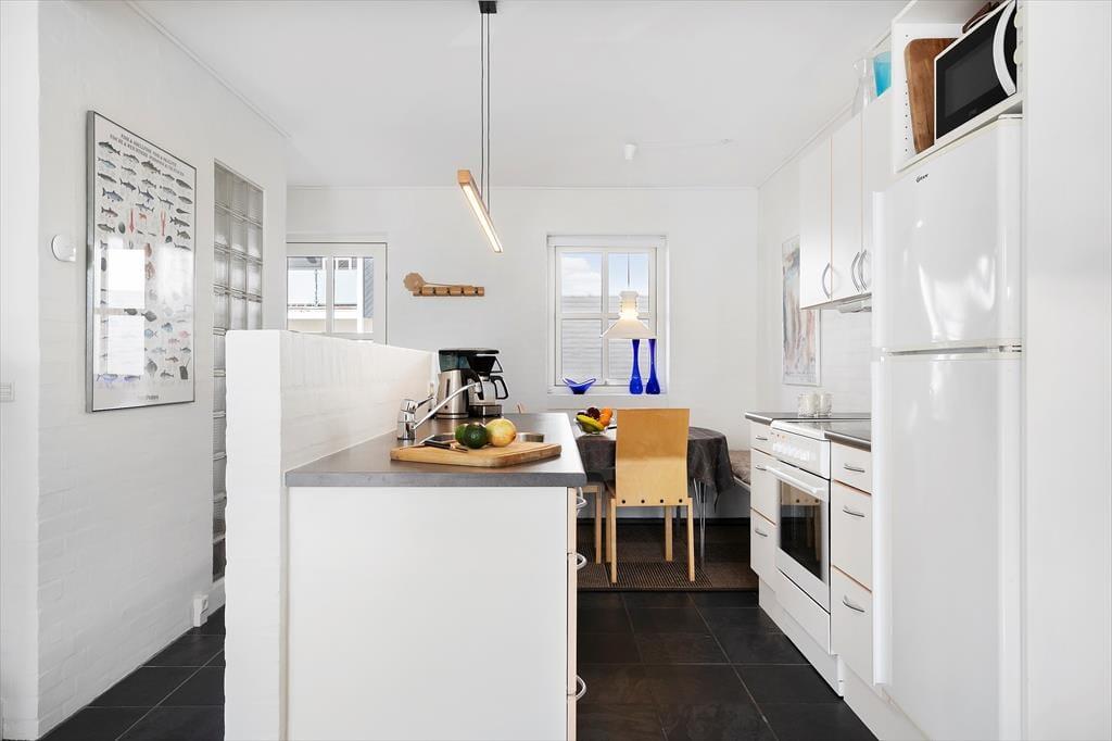 Lejligheden strækker sig over to etager og byder på et lyst og indbydende interiør. Stueetagen rummer et moderne køkken, der ligger i åben forbindelse med stuen – et perfekt samlingspunkt for hele familien. På første sal finder du et rummeligt soveværelse og en hyggelig opholdsplads, der indbyder til afslapning efter en dag fyldt med oplevelser. Den lille altan på første sal er ideel til at nyde morgenkaffen, mens dagens planer langsomt tager form.
