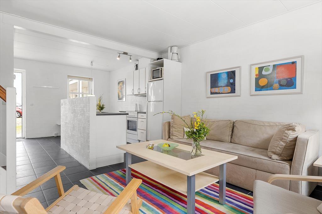 Lejligheden strækker sig over to etager og byder på et lyst og indbydende interiør. Stueetagen rummer et moderne køkken, der ligger i åben forbindelse med stuen – et perfekt samlingspunkt for hele familien. På første sal finder du et rummeligt soveværelse og en hyggelig opholdsplads, der indbyder til afslapning efter en dag fyldt med oplevelser. Den lille altan på første sal er ideel til at nyde morgenkaffen, mens dagens planer langsomt tager form.