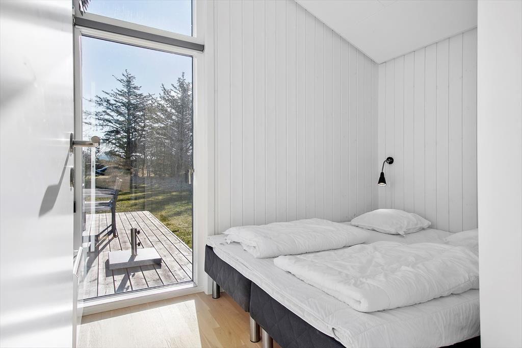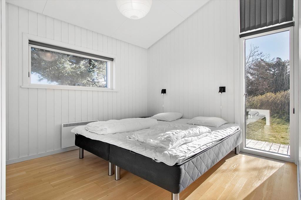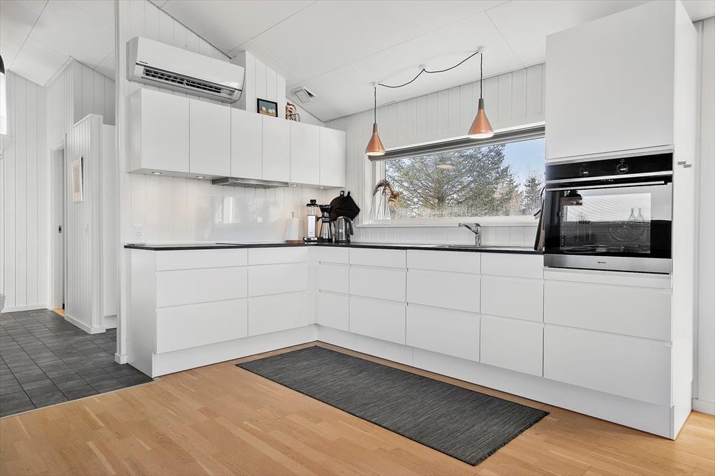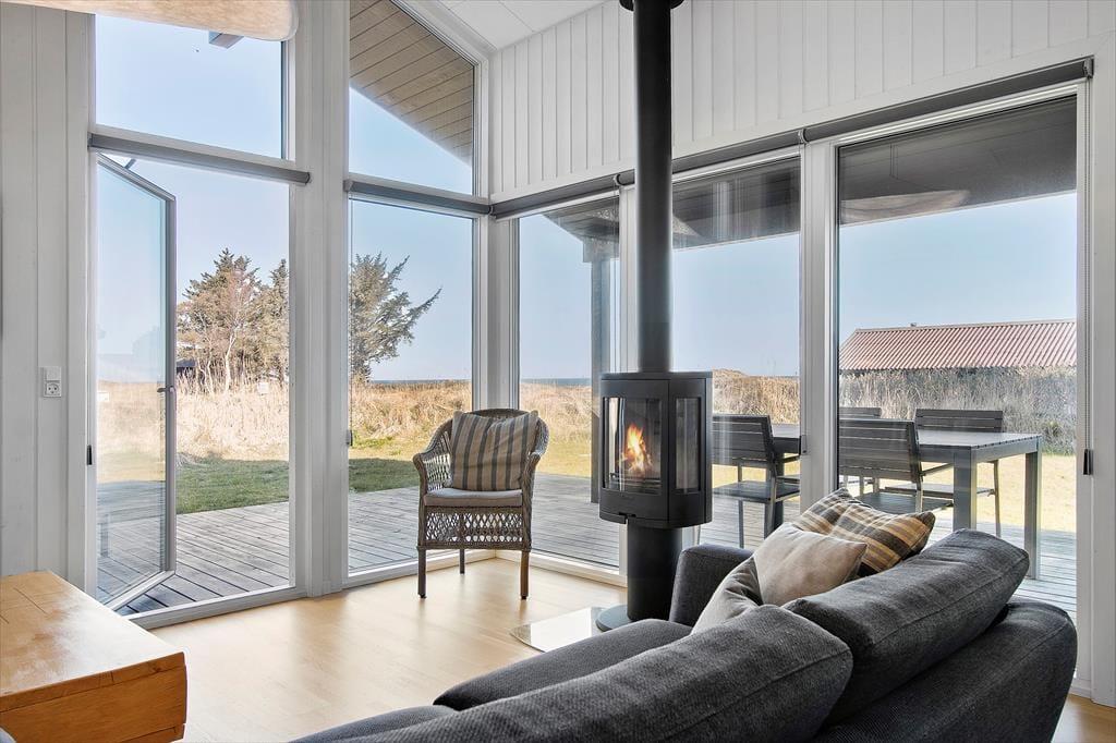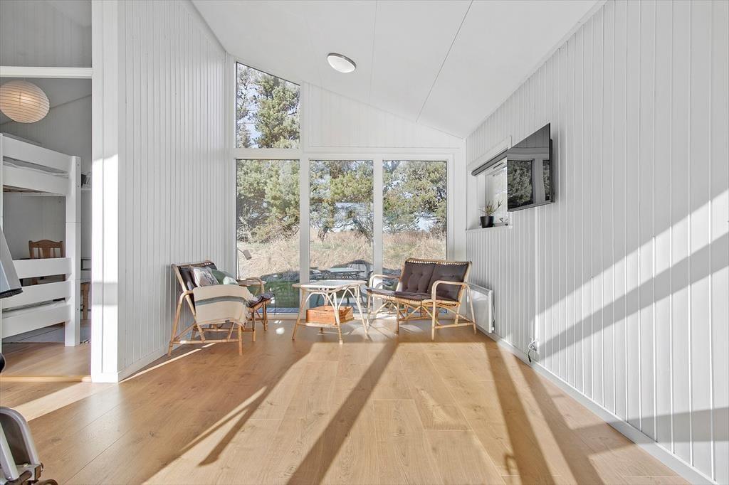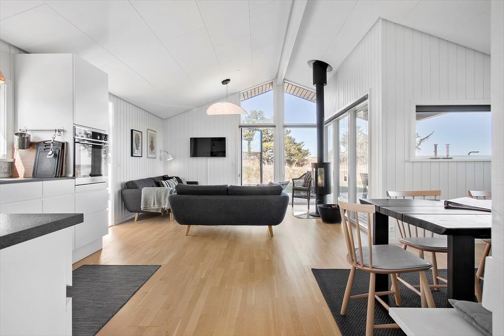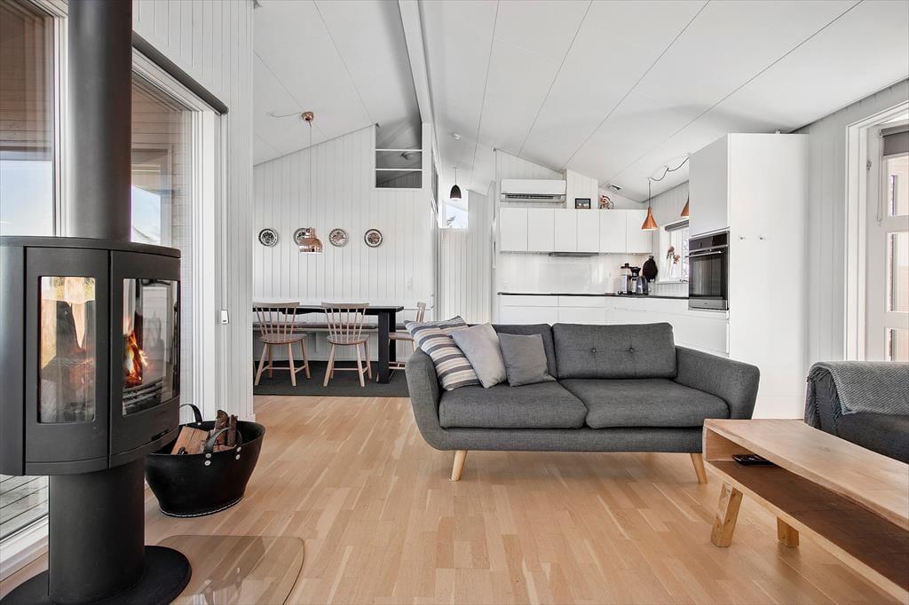 Når du træder ind i sommerhuset, mødes du af et lyst og indbydende hjem, hvor loft til kip og store vinduer skaber en behagelig og rummelig atmosfære. Den hyggelige stue indbyder til afslapning foran fjernsynet eller med en god bog, mens brændeovnen spreder varme på kølige aftener. Det åbne køkken gør det nemt at tilberede lækre måltider, samtidig med at du kan være en del af samtalerne i stuen. Sommerhusets indretning balancerer på smukkeste vis mellem det funktionelle og det hyggelige, så du straks føler dig hjemme.