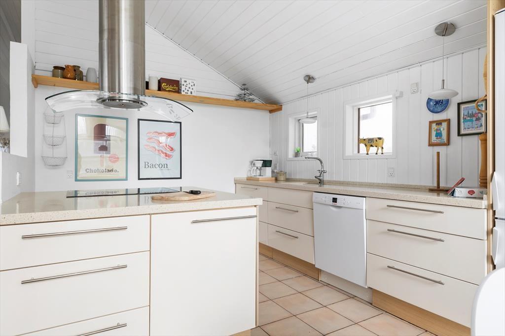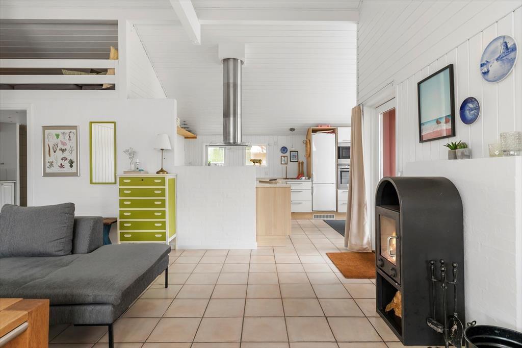 Når du træder ind i sommerhuset, mødes du af en lys og imødekommende atmosfære. Huset er indrettet med en rummelig opholdsstue, hvor store vinduer trækker naturen helt tæt på. Brændeovnen skaber hygge på kølige aftener, og den åbne forbindelse mellem stue og køkken gør det nemt at være sammen. Køkkenet er ideelt til at forberede lækre måltider, som kan nydes ved spisebordet eller tages med ud på terrassen. De komfortable soveværelser byder på gode rammer for en god nats søvn, så du vågner frisk og veludhvilet.