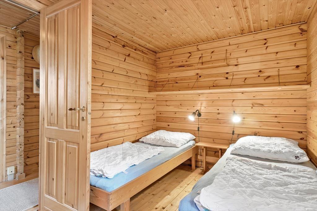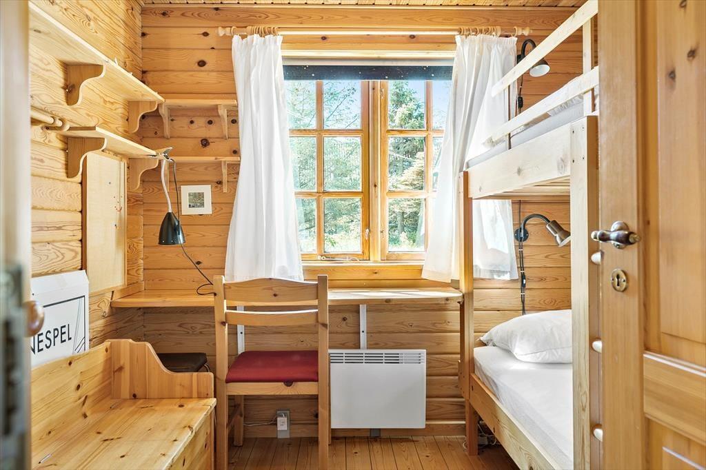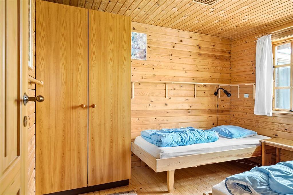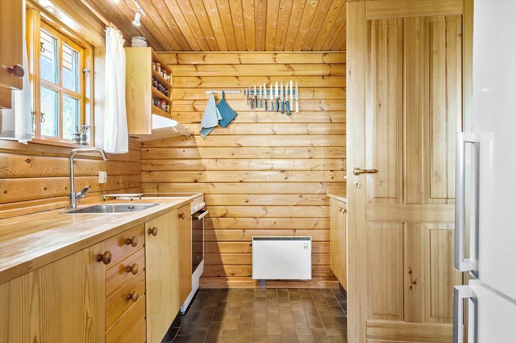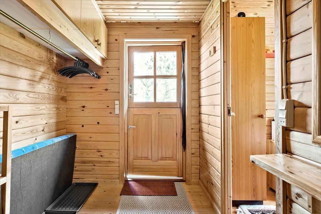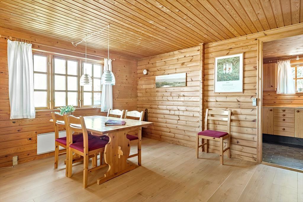 Det hyggelige bjælkehus emmer af charme og varme, og her er det let at føle sig hjemme. Fra stuen har du et skønt kig til den store udestue, hvor de store vinduer lukker masser af lys ind og skaber en stemning af at være midt i naturen – uanset vejret udenfor. Indretningen er hyggelig og indbydende med brændeovnen som et naturligt samlingspunkt, når aftenen falder på. Lyden af knitrende brænde og duften af varm kakao skaber en perfekt atmosfære til en aften med brætspil eller en god bog. Her kan du virkelig nyde feriens langsommelighed og lade dagene glide ubekymret afsted.