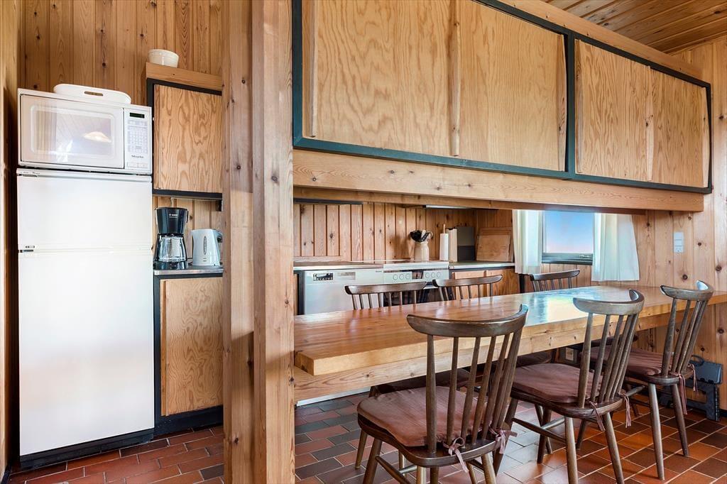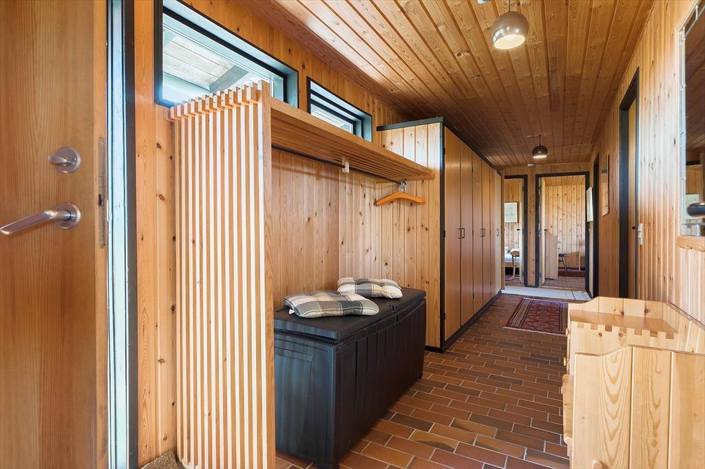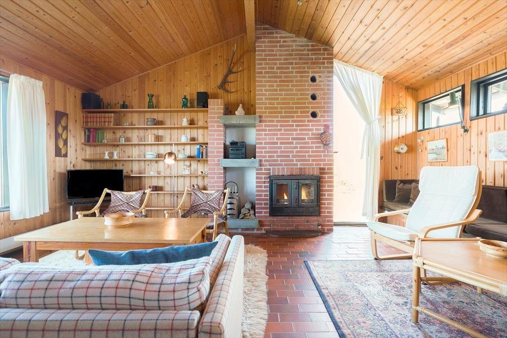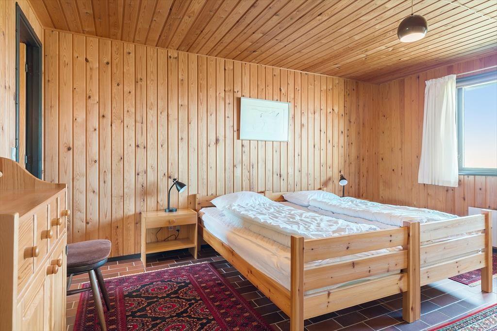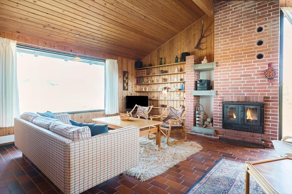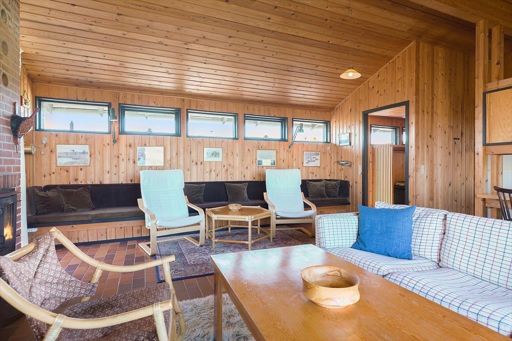 Dette charmerende bjælkehus byder på en helt særlig atmosfære, hvor naturen er trukket med ind i rummene. De varme trævægge og store vinduer skaber en hyggelig stemning, mens panoramaudsigten til Vesterhavet fuldender oplevelsen. Stuen er indrettet med komfortable møbler og en brændeovn, der samler familien til hyggestunder på kølige aftener. Køkkenet ligger i åben forbindelse med stuen og er et dejligt sted at tilberede feriens måltider, mens samtalen flyder frit mellem kok og gæster. Der er gode soveværelser, som indbyder til ro og afslapning efter en dag fuld af oplevelser.