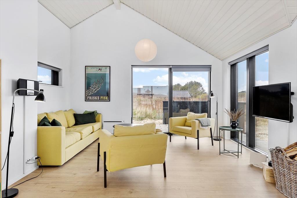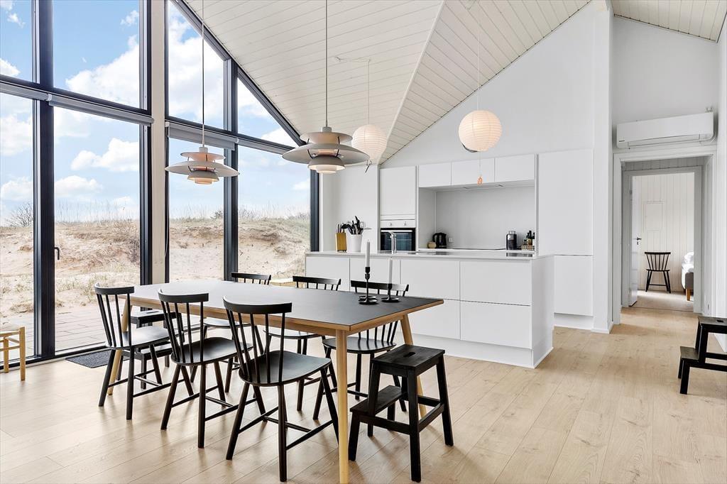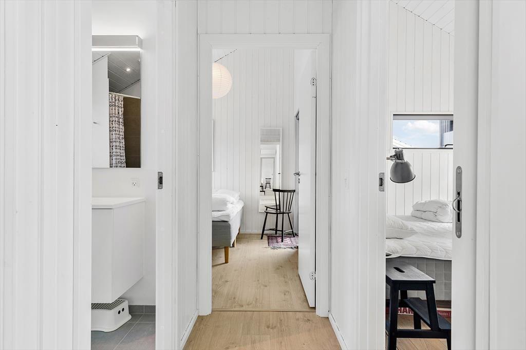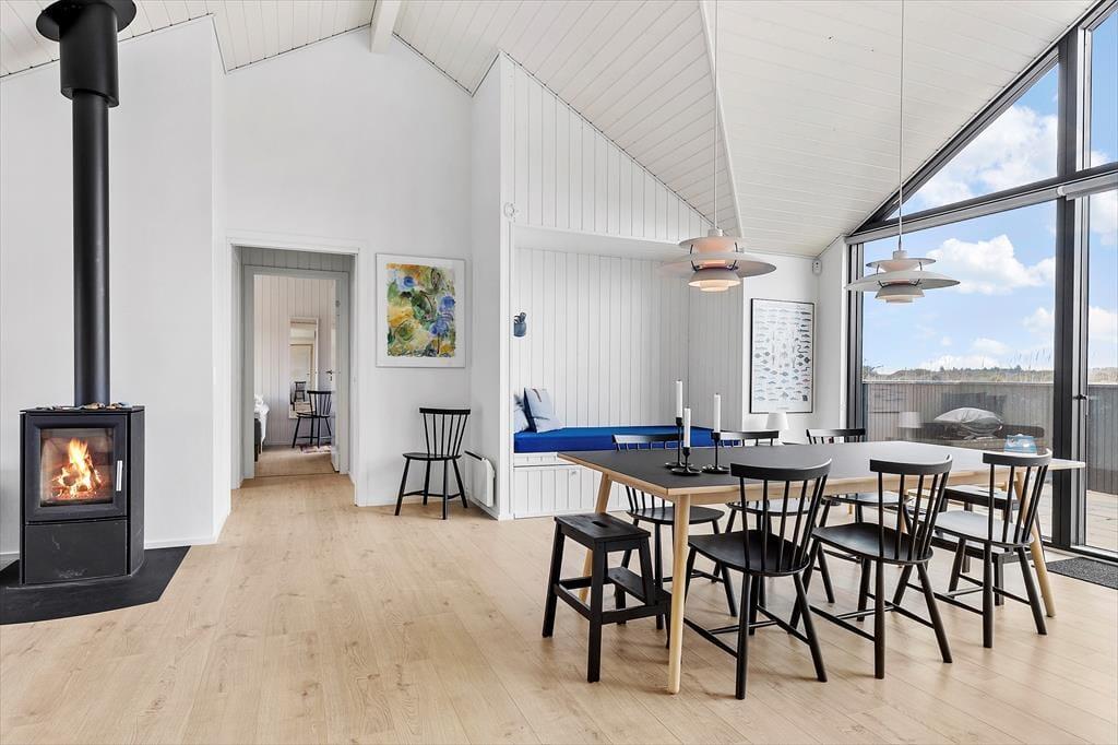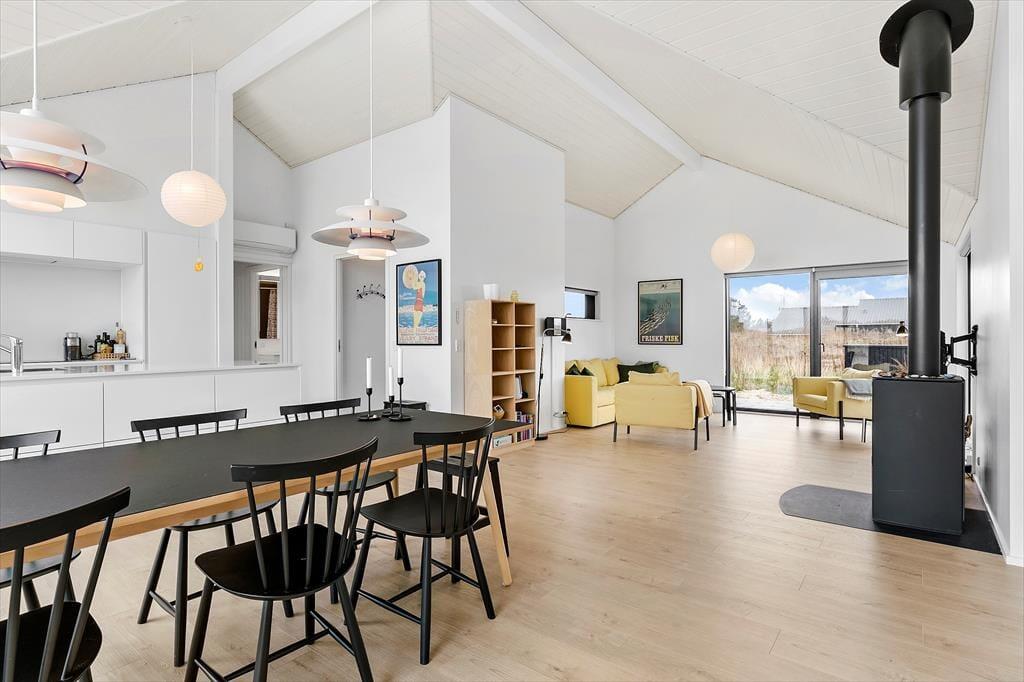 Indenfor møder du en lys og moderne indretning, hvor atmosfæren straks får skuldrene til at sænke sig. Stuen er samlingspunktet, hvor store vinduespartier lukker lyset ind og skaber en venlig stemning fra morgen til aften. Her kan I samles om brætspil ved spisebordet eller lade snakken flyde, mens maden bliver tilberedt i det åbne køkken. Om aftenen er sofaen et oplagt sted at krybe sammen med en god bog eller en film, mens duften af nybrygget kaffe breder sig. Planløsningen gør det nemt at være flere afsted sammen – uanset om I er to familier eller en gruppe gode venner, som drømmer om at dele ferieminder i et hjemligt sommerhusmiljø.