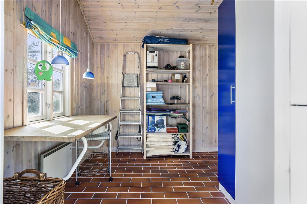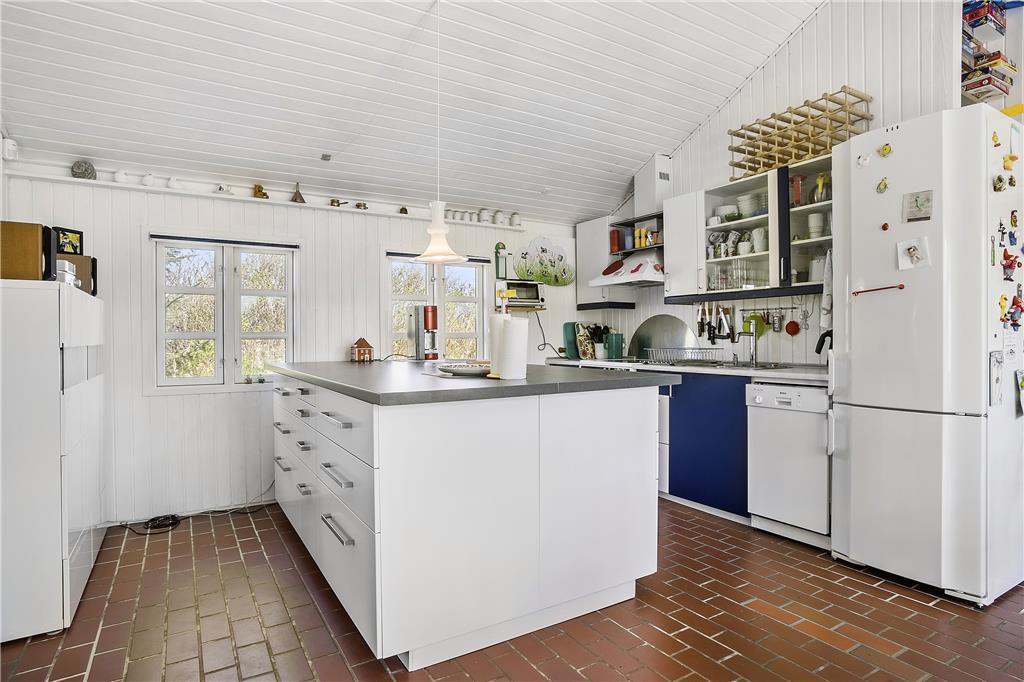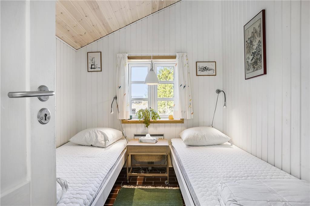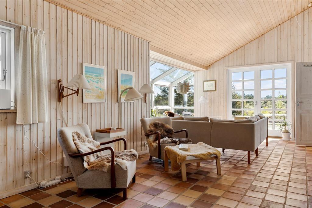 Sommerhuset byder dig indenfor med en lys og rummelig atmosfære, hvor store vinduespartier og højt til loftet skaber en følelse af frihed og nærhed til naturen. Det centrale opholdsrum kombinerer stue og køkken i en åben planløsning, der gør det nemt at være sammen – uanset om du slapper af i sofaen, laver mad eller nyder et måltid ved spisebordet. Brændeovnen i stuen spreder varme og hygge på køligere dage, og de naturskønne omgivelser kan nydes direkte fra vinduerne. Soveværelserne er komfortabelt indrettede og indbyder til en god nats søvn, så du vågner frisk og klar til dagens oplevelser.