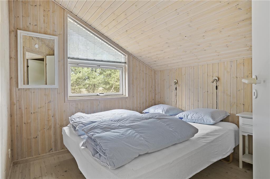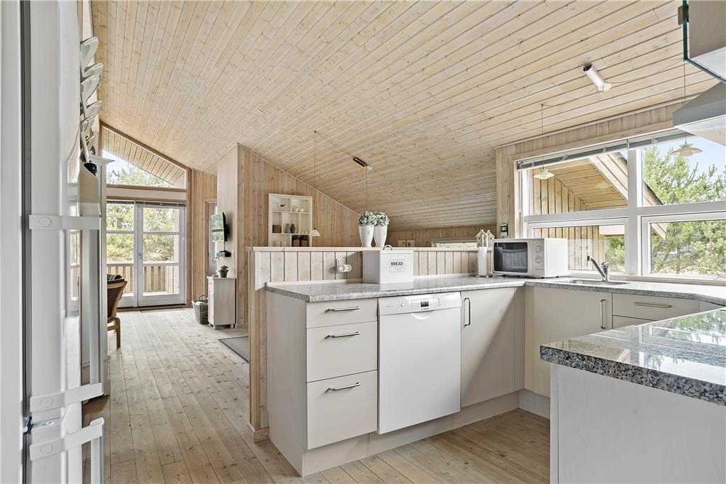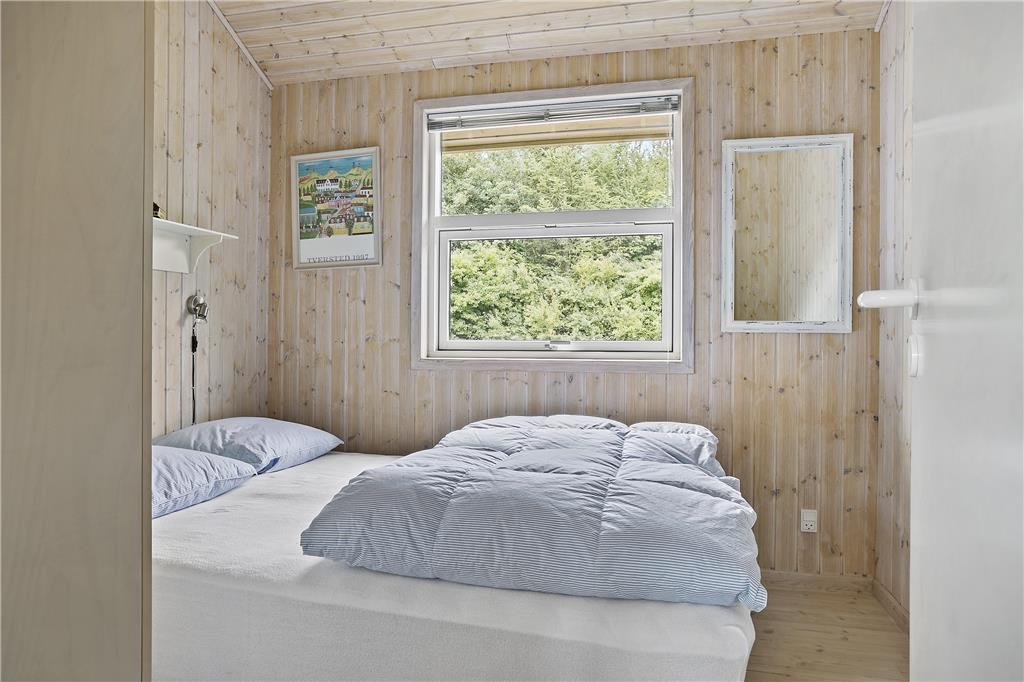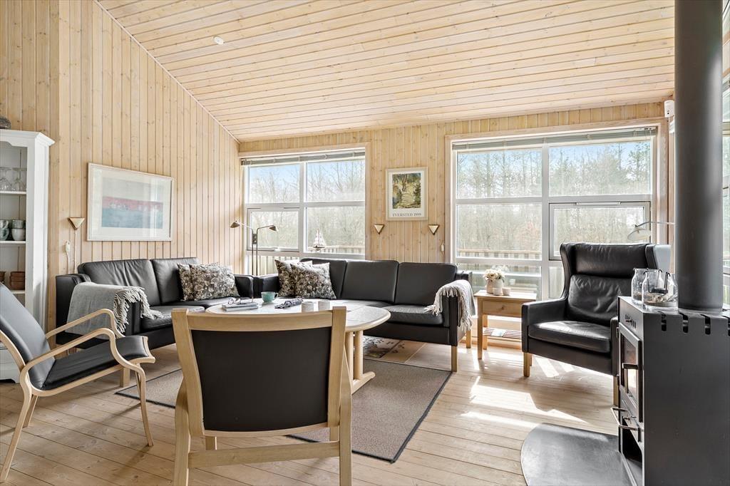Indenfor byder sommerhuset på en lys og indbydende atmosfære, der understreges af loft til kip og store vinduespartier, som lader lyset strømme ind og trækker naturen helt tæt på. Stuen er udstyret med en brændeovn, der spreder varme og hygge på kølige aftener, og det åbne køkken giver rig mulighed for at lave mad sammen, mens samtalen flyder frit. De lyse rum og den gennemtænkte indretning gør det nemt at føle sig hjemme, og husets soveværelser er komfortable oaser, hvor du kan lade op til en ny dag fuld af oplevelser.