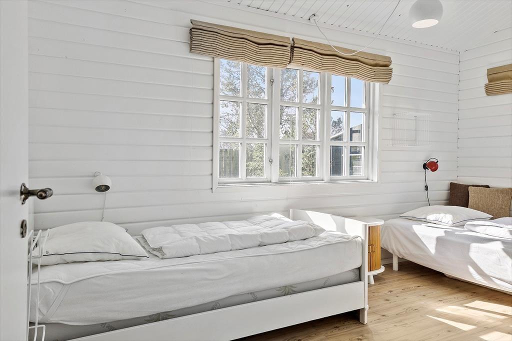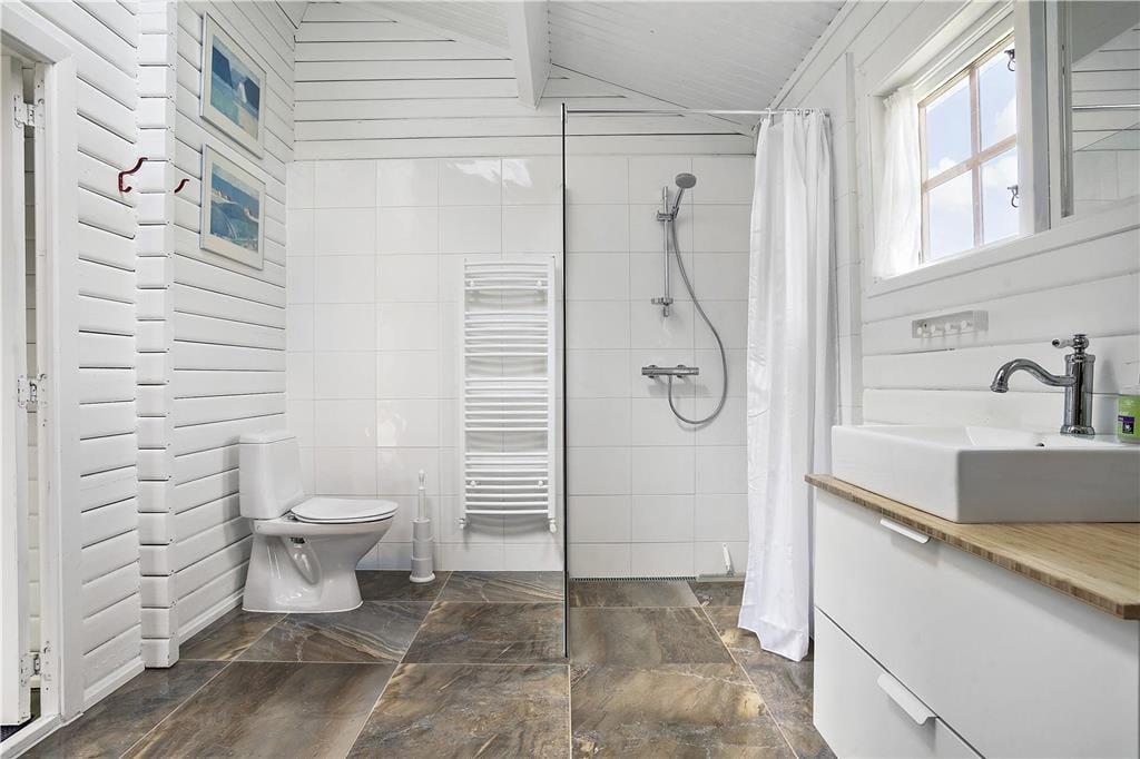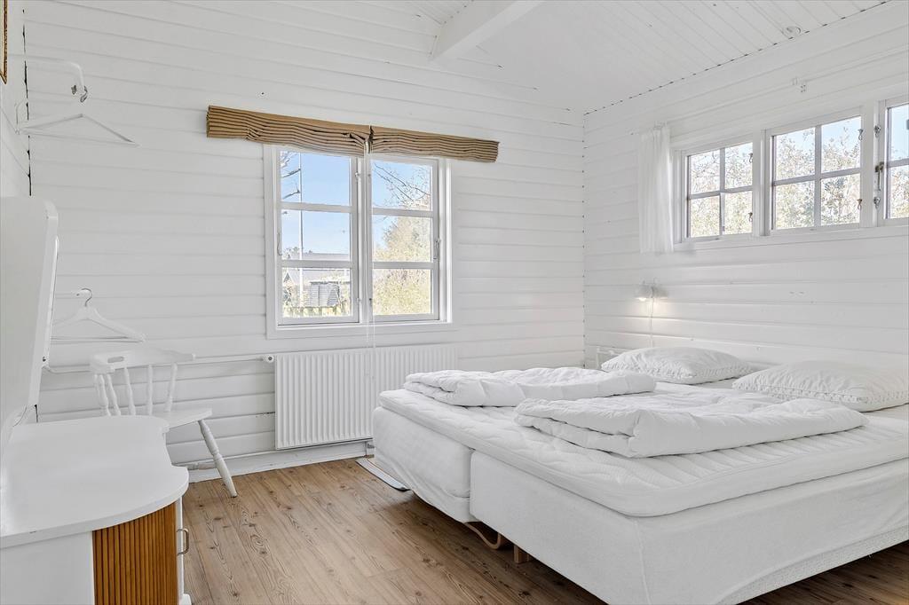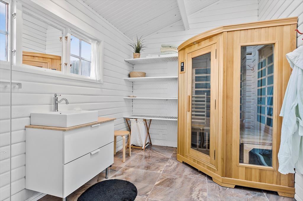 Inde i sommerhuset bliver du mødt af et stort og lyst opholdsrum, hvor stue og køkken smelter sammen i ét. De store vinduer lukker lyset ind og skaber en indbydende atmosfære, mens loftet til kip giver en luftig og rummelig fornemmelse. Brændeovnen spreder varme og hygge på de køligere dage, mens den infrarøde sauna tilføjer en ekstra dimension af velvære. Sommerhuset har to badeværelser, hvilket gør det ekstra komfortabelt for familien eller vennegruppen, der nyder ferien sammen.
