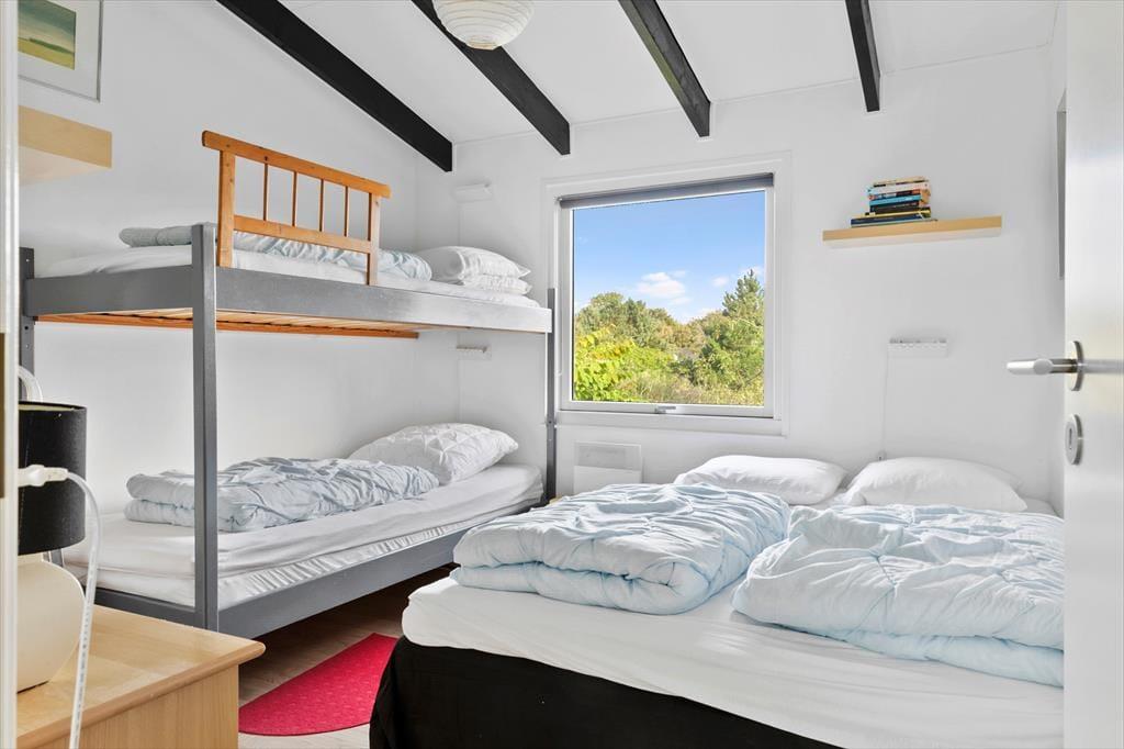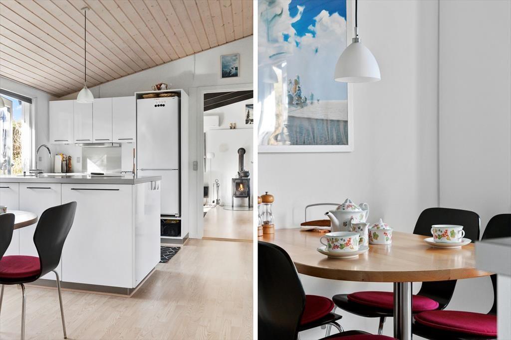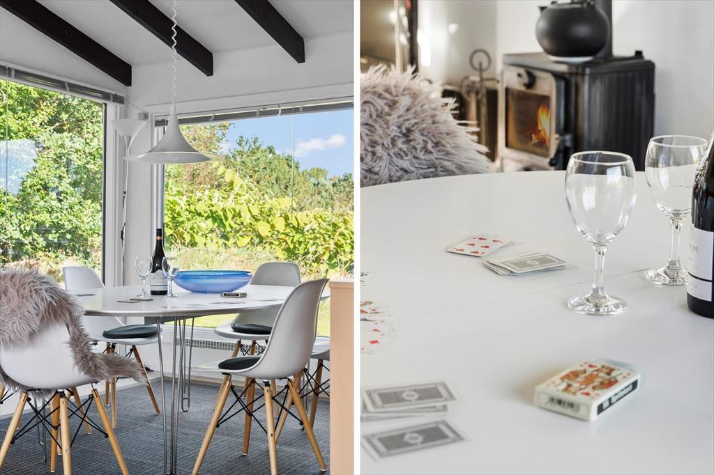 Indenfor mødes du af en stor og lys stue, hvor store vinduer lader dagslyset strømme ind og skaber en behagelig atmosfære. Stuen er hjemmets naturlige samlingspunkt, hvor du kan synke ned i sofaen foran brændeovnen og nyde varmen efter en frisk gåtur ved stranden. Spisebordet indbyder til lange middage med familien, og den åbne forbindelse til køkkenet gør det let at være social, mens der laves mad. Huset rummer plads til seks personer, så her er god plads til både familie og venner.