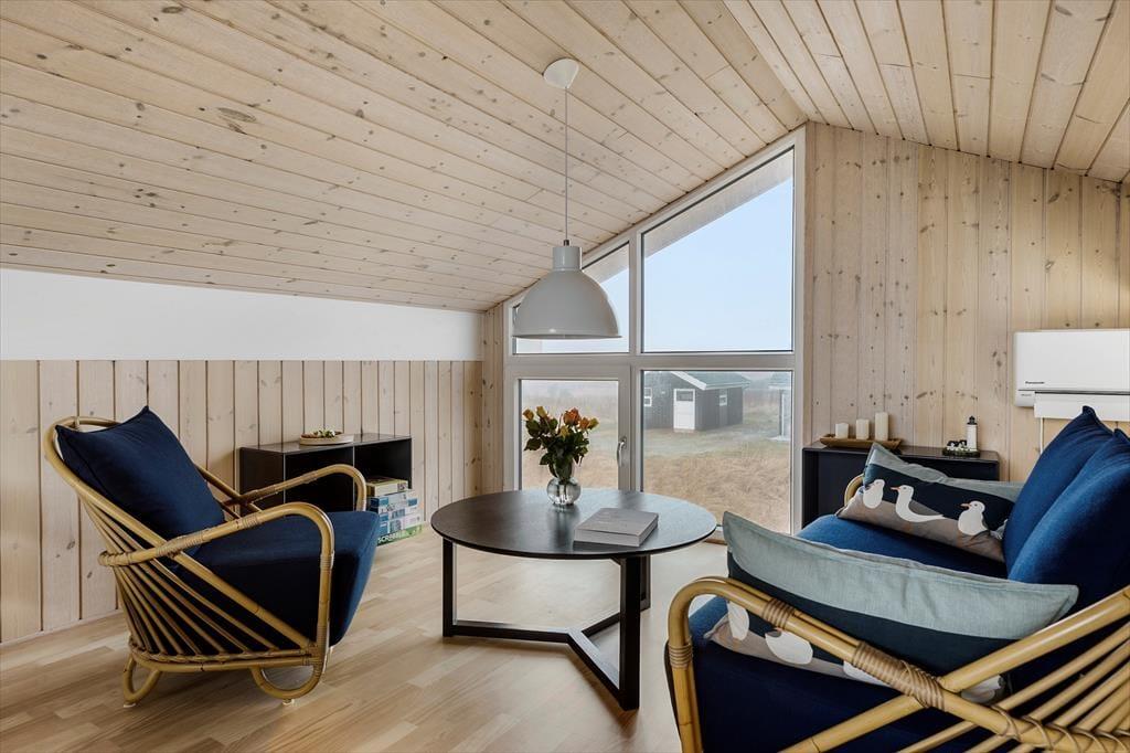 Når du træder ind i dette skønne sommerhus på Præstebakken 24, bliver du straks mødt af en lys og luftig atmosfære, hvor store vinduespartier inviterer naturen helt tæt på. Her kan du og dine kære slappe af i den rummelige stue, hvor solens stråler danser hen over trægulvet, og hvor brændeovnen spreder varme på kølige aftener. Fra hemsen har du en fantastisk udsigt over landskabet og endda et glimt af Vesterhavet, som venter lige i nærheden. Huset har plads til seks personer fordelt på hyggelige soveværelser, og med hele to badeværelser er der god komfort for alle. Det åbne køkken ligger i forbindelse med stuen, så du nemt kan nyde en god samtale, mens du tilbereder feriens måltider.