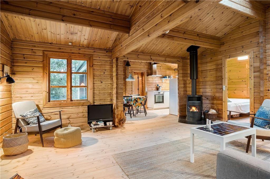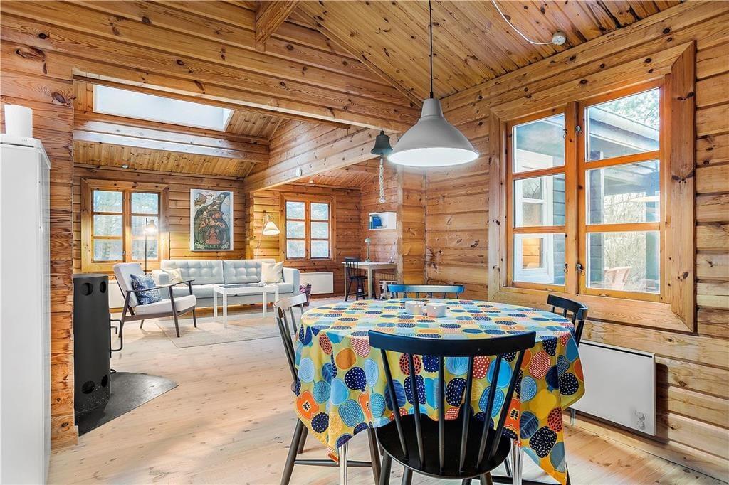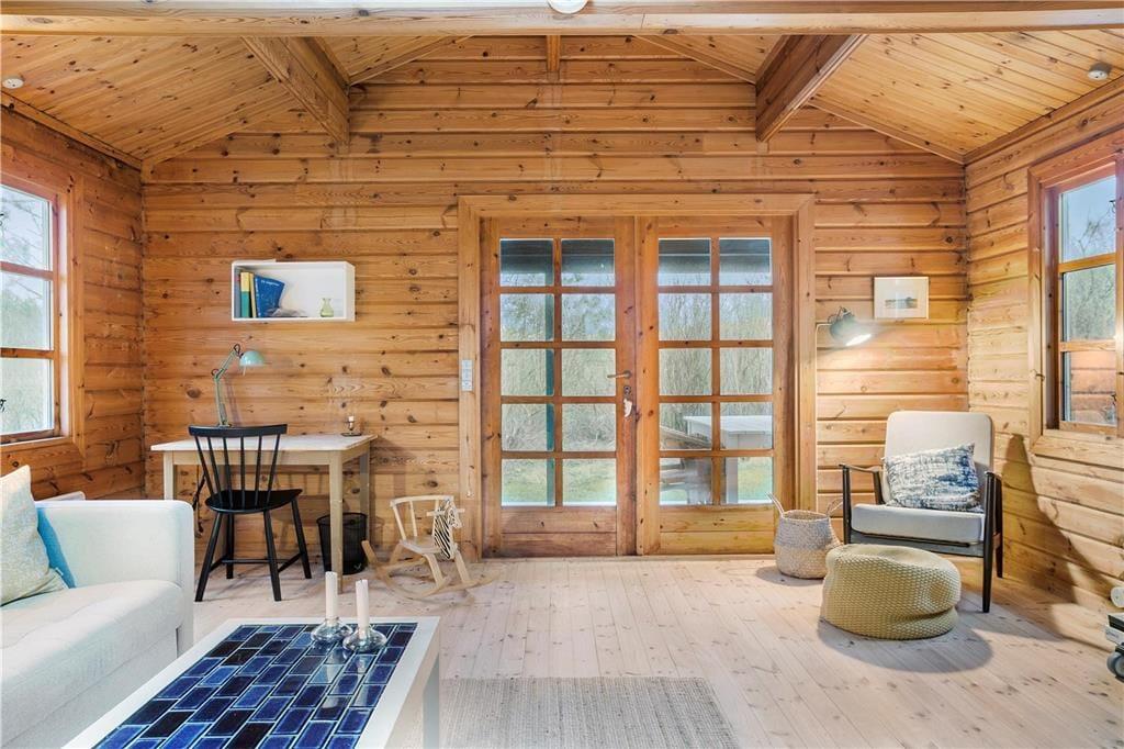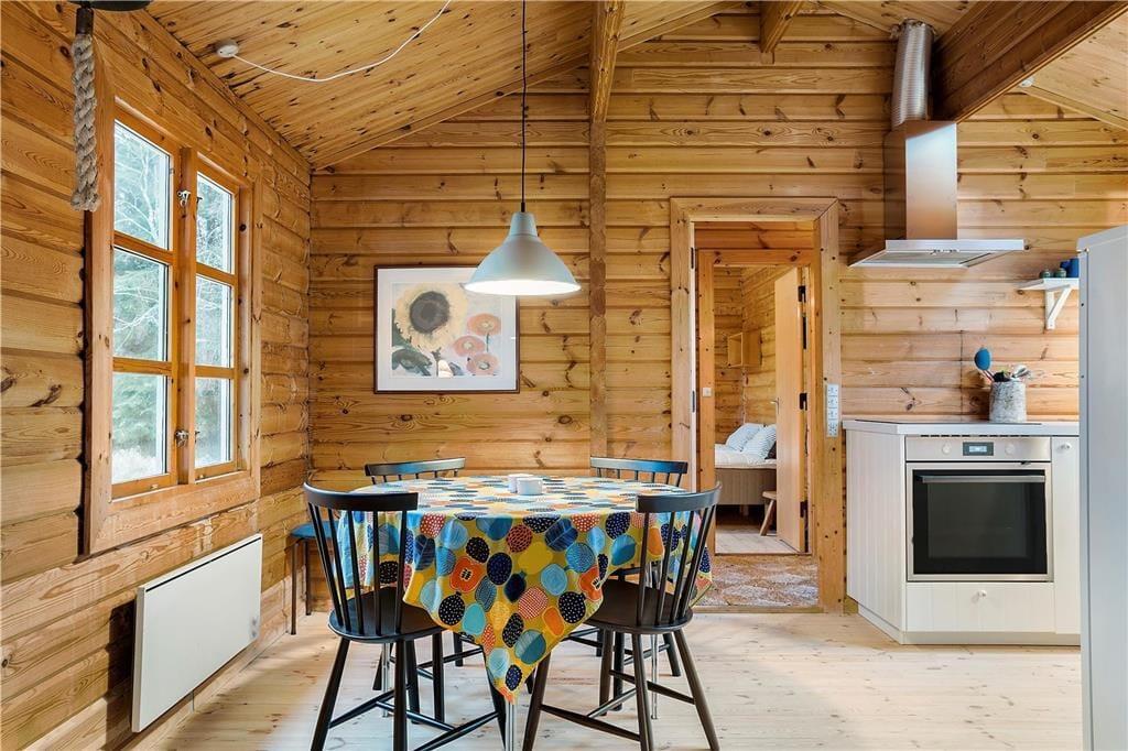 Indenfor mødes du af en hyggelig og autentisk sommerhusstemning, hvor brændeovnen hurtigt bliver et naturligt samlingspunkt for familien på de lidt køligere dage. Sommerhuset blev renoveret i 2019, så selvom det emmer af klassisk sommerhuscharme, byder det også på moderne komfort. Den åbne stue og spiseområde skaber en lys og rummelig atmosfære, hvor der er god plads til hyggelige middage og lange brætspilsaftener. Køkkenet er praktisk indrettet og ligger i åben forbindelse med stuen, så du altid kan være en del af samtalen, mens du laver mad.