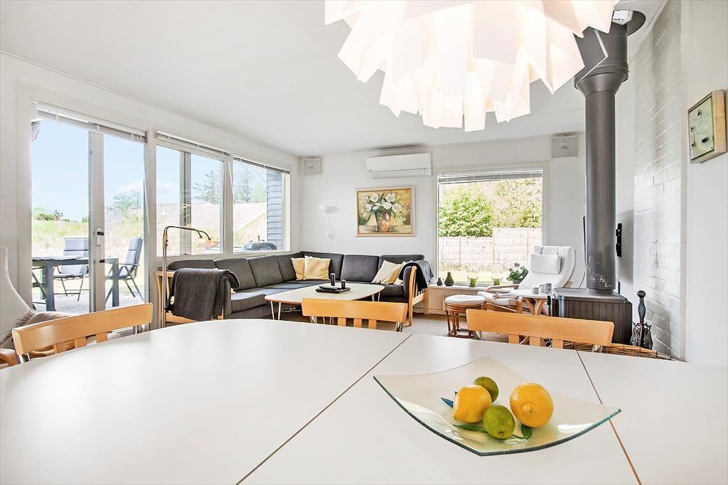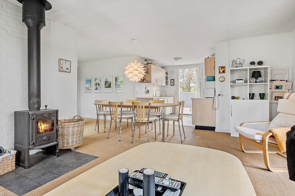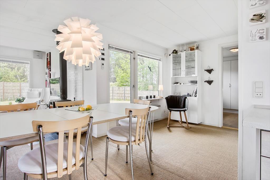 Når du træder indenfor i sommerhuset, mødes du af en lys og rummelig stue, hvor den åbne forbindelse til det velindrettede køkken skaber en hyggelig og social atmosfære. Her kan hele familien samles omkring spisebordet eller slænge sig i sofaen til en god film. Når vejret ikke indbyder til udendørsaktiviteter, kan du nyde varmen fra brændeovnen, der skaber den perfekte stemning til afslapning. De store vinduer giver et smukt lysindfald, og det veludstyrede køkken gør det let at forberede både små måltider og festmåltider. I bryggerset finder du praktisk plads til både vaskemaskine og opbevaring. Med flere gode soveværelser er der god plads til, at både store og små kan få en god nats søvn, så I er klar til at tage på nye eventyr.