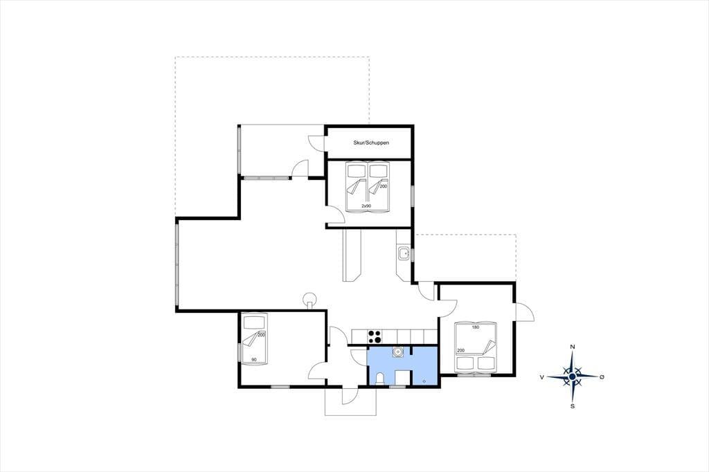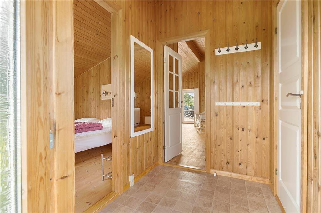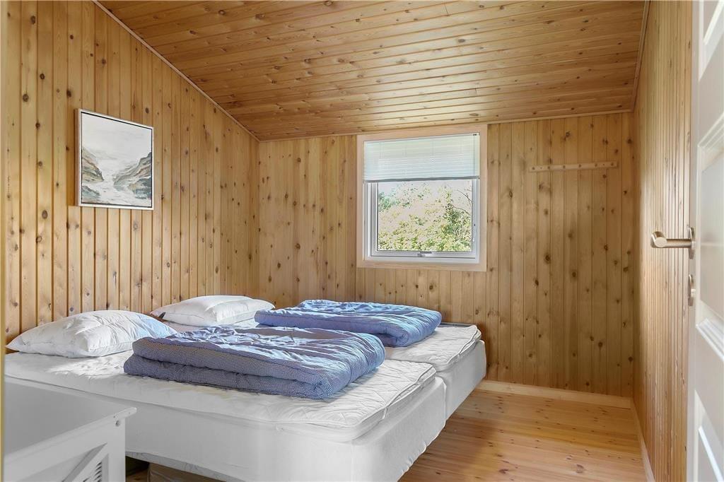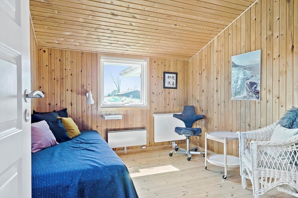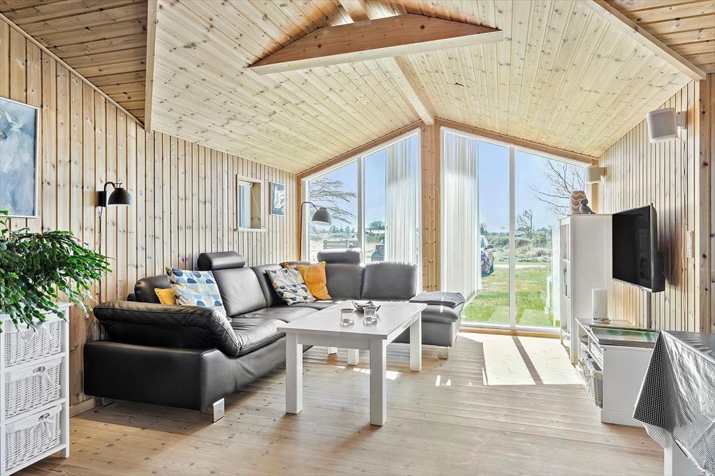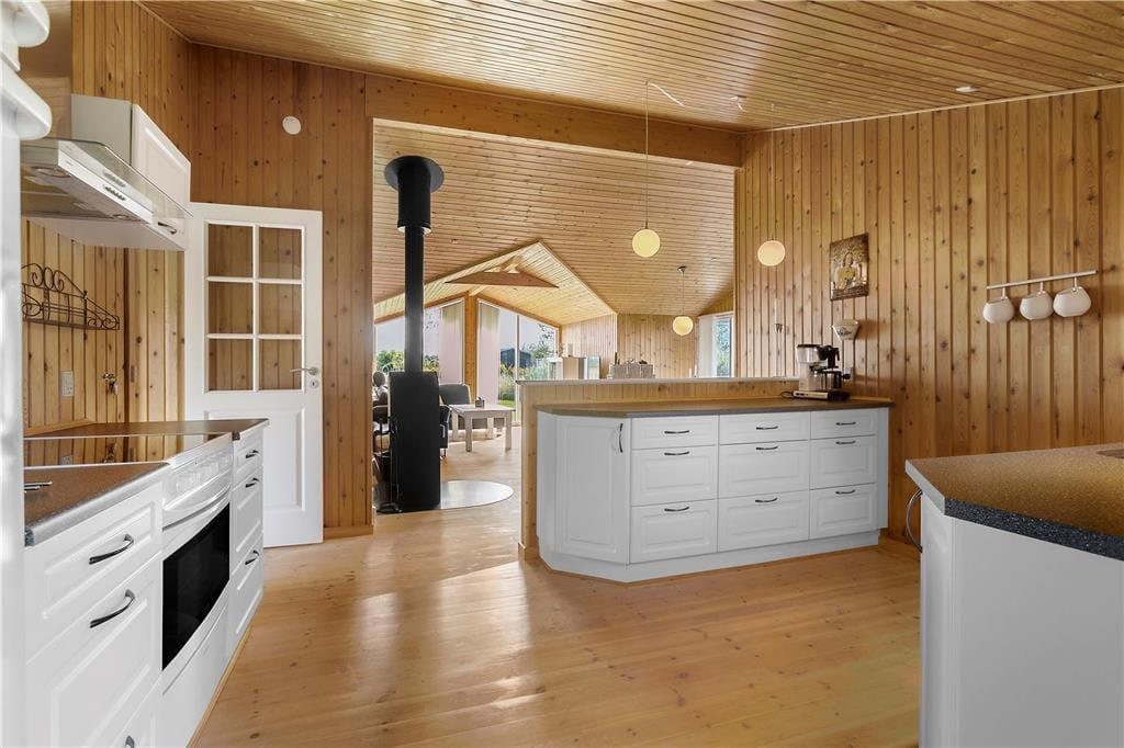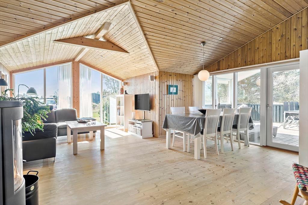 Når du træder indenfor i sommerhuset, bliver du mødt af en lys og indbydende atmosfære, der skaber en hjemlig følelse. Den rummelige stue har loft til kip, hvilket giver en dejlig åben fornemmelse, og de store vinduer sikrer masser af naturligt lys hele dagen. Stuen ligger i åben forbindelse med det funktionelle køkken, så du kan være sammen med dine kære, både mens du laver mad og når du slapper af efter en lang dag. Den varme, hyggelige stemning gør, at du hurtigt føler dig hjemme her. I den åbne planløsning er der rig plads til at tilbringe tid med familie og venner – enten omkring spisebordet eller i sofaen foran tv’et, hvor en afslappet aften kan finde sted med en god film.
