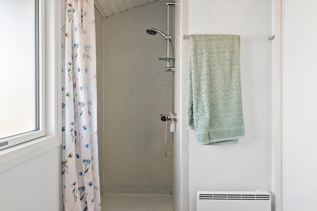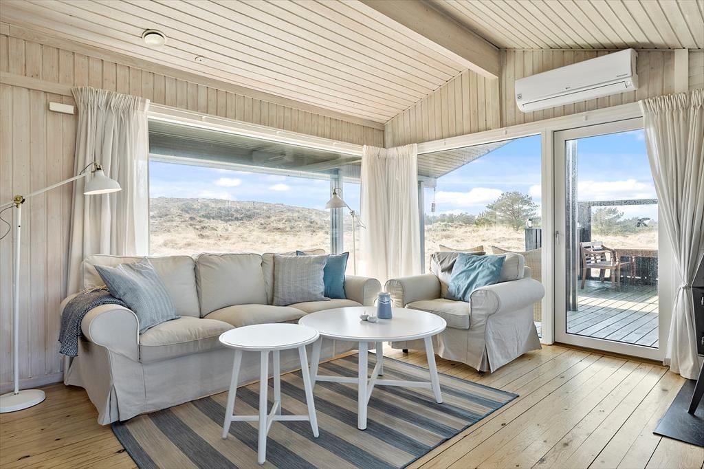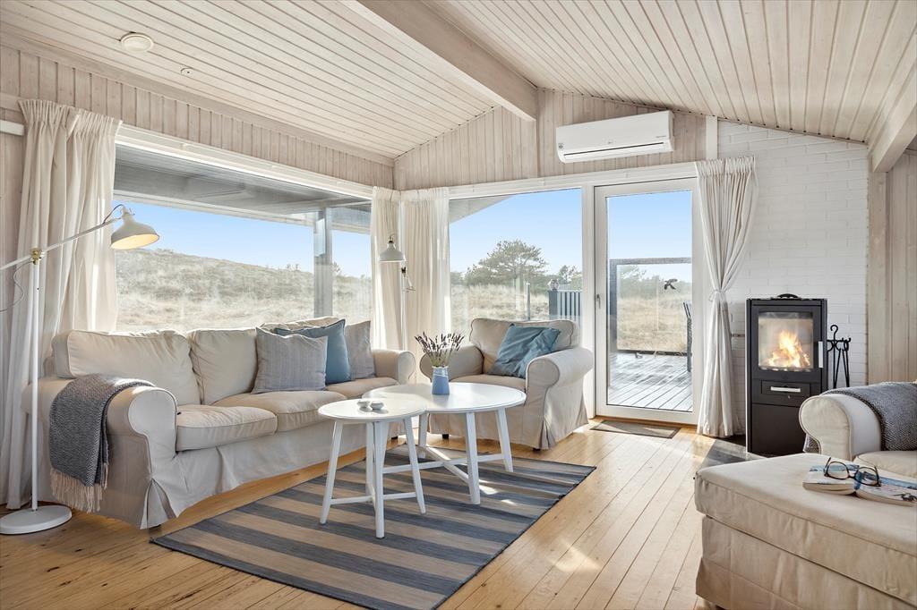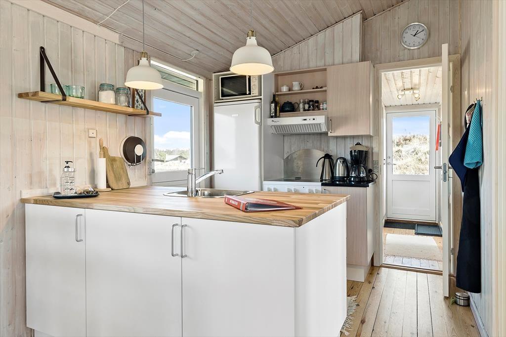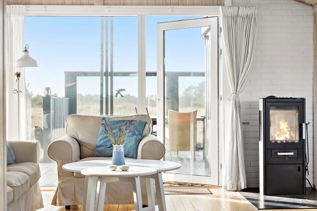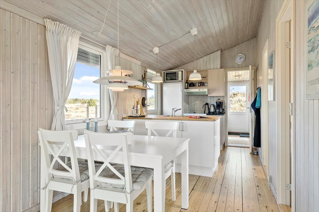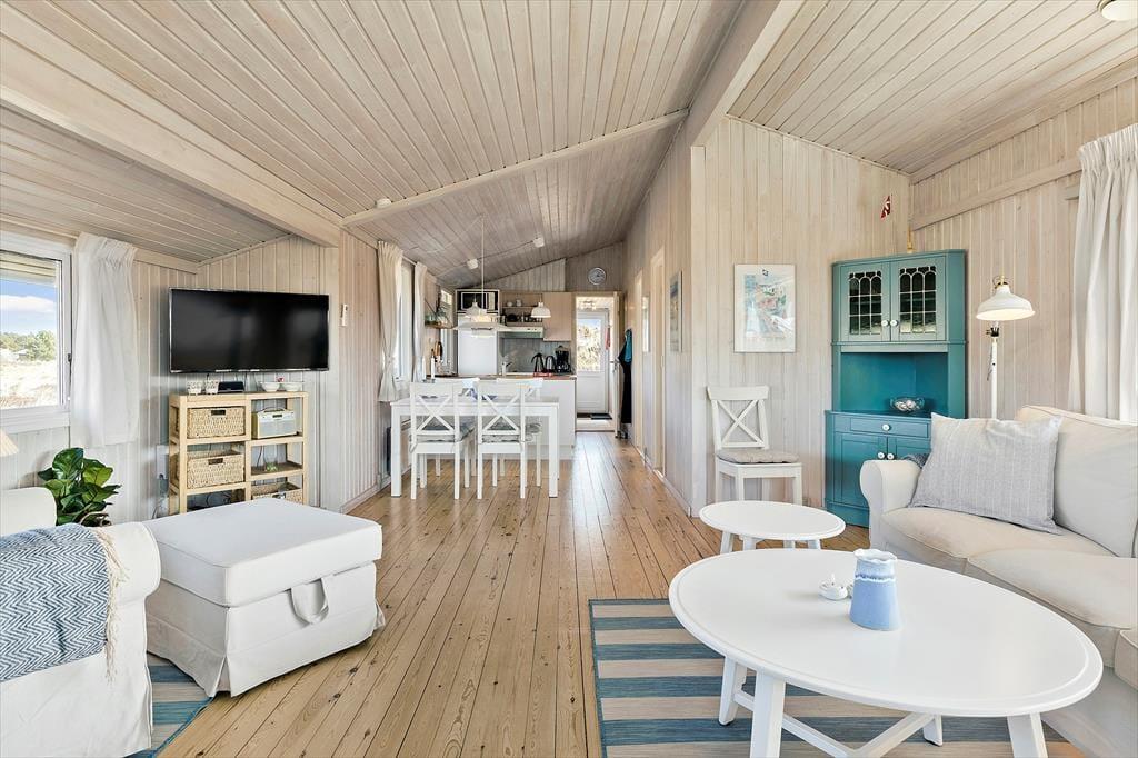 Når du træder ind i sommerhuset, bliver du mødt af en lys og indbydende atmosfære. Loftet går til kip, hvilket skaber en rummelig og luftig fornemmelse, der sammen med den klassiske sommerhusstemning giver et perfekt feriemiljø. Brændeovnen er det naturlige midtpunkt i stuen, og her kan du finde varme og hygge på kølige aftener. Den åbne planløsning giver en dejlig forbindelse mellem stue og køkken, hvor det er nemt at samles til måltider eller afslapning. Uanset om du er her med familie eller venner, vil den praktiske indretning sikre, at alle har plads til både samvær og privatliv.