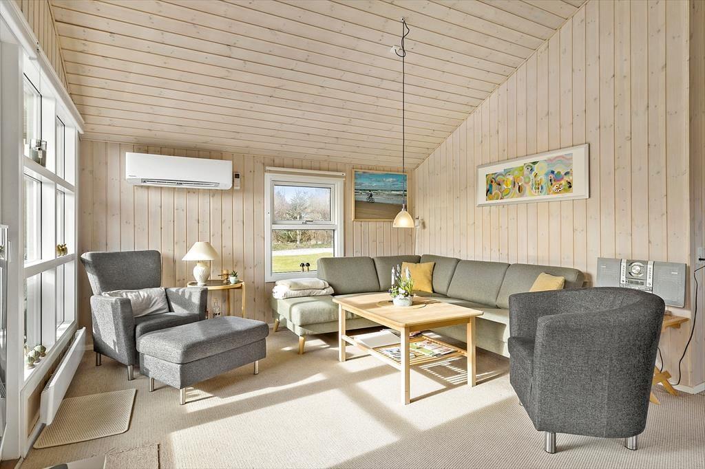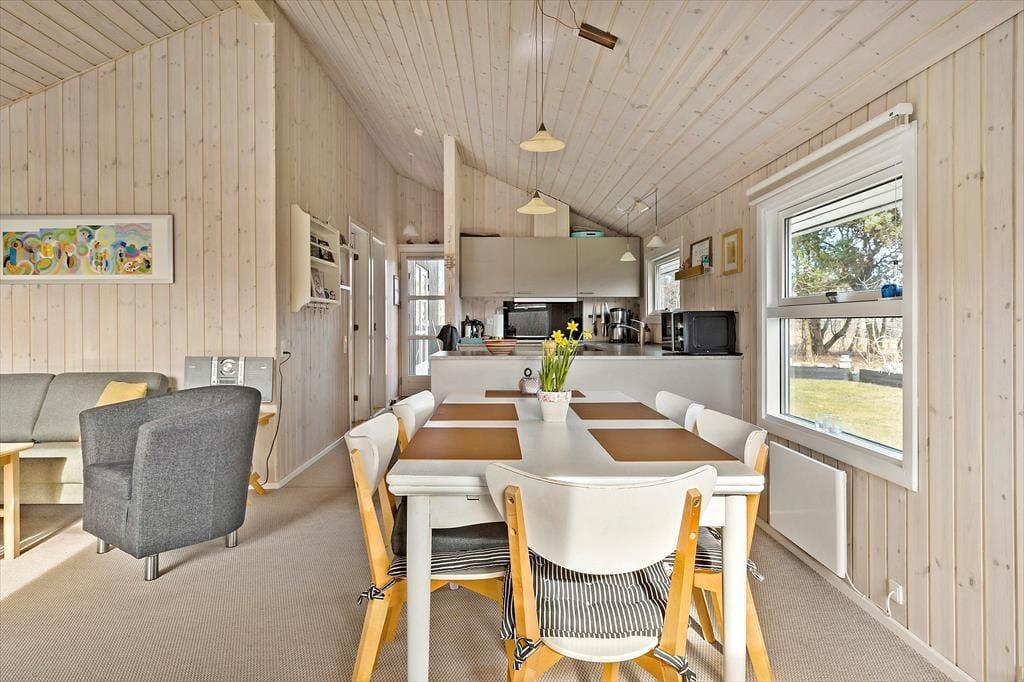 Når du træder ind i sommerhuset, bliver du mødt af et lyst og venligt rum med masser af naturligt lysindfald. Stuen har en skøn atmosfære med god plads til at slænge sig i sofaen, tage en stille stund med en bog eller samles omkring bordet til kortspil og samtaler. Det åbne rumforløb skaber god kontakt mellem stue og køkken, så du hele tiden er tæt på dem, du holder ferie med. En brændeovn og varmepumpe sørger for, at indeklimaet er behageligt året rundt – også hvis vejret en dag indbyder til indendørs hygge. Der er gode sovepladser i huset, og i det hyggelige anneks er der plads til to personer, som gerne vil have lidt ekstra ro og privatliv – ideelt til teenagere, bedsteforældre eller et vennepar.