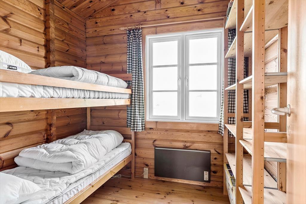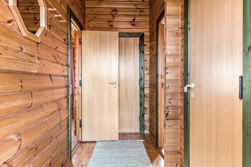 Hvis I er til sommerhuse med sjæl og personlighed, vil I falde for Kornblomstvej 13. Sommerhuset, der måler 77 m2 og har plads til seks personer, blev opført i 1974, og selvom rummene emmer af original charme, fremstår det stadig pænt og velholdt. Et dejligt køkken ligger i åben forbindelsen med stuen, der byder på spisebord, sofaarrangement og sågar en gyngestol ved brændeovnen. Der er hverken tv eller Wi-fi i huset, men I kan selvfølgelig benytte jer af jeres egne devices, hvis I har trådløs forbindelse – og ellers kan I bruge det som en kærkommen anledning til at holde fri fra skærmene og i stedet fordybe jer i avisen, krydsogtværsen og den gode samtale. Fra entréen har I adgang til et badeværelse med bruser og vaskemaskine såvel som et soveværelse med dobbeltseng, og fra stuen har I adgang til yderligere to soveværelser, som begge er med køjeseng.