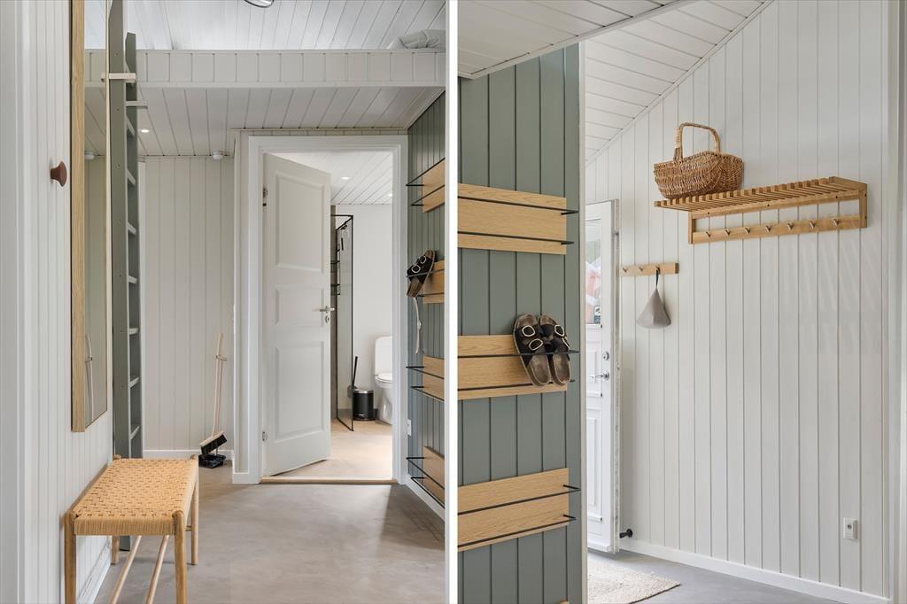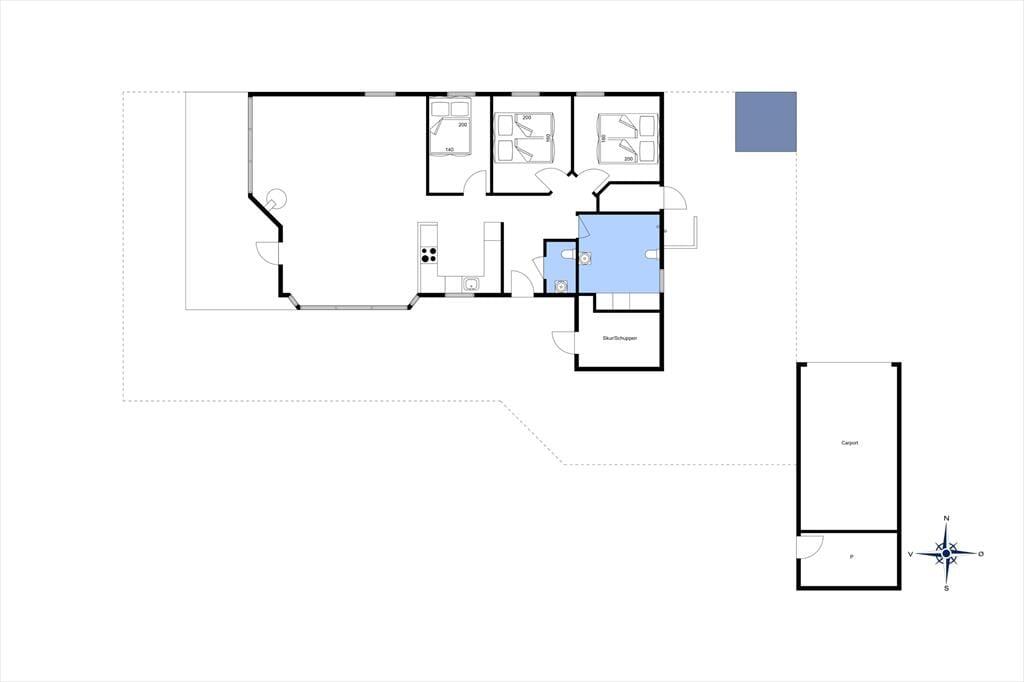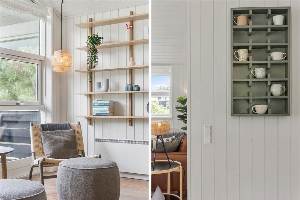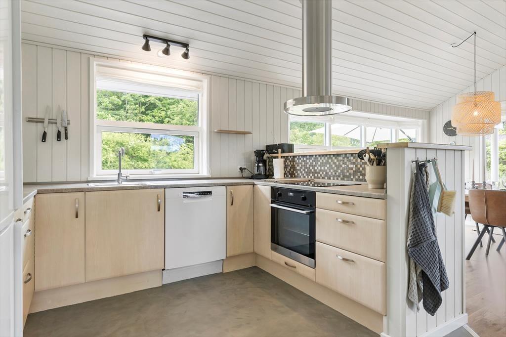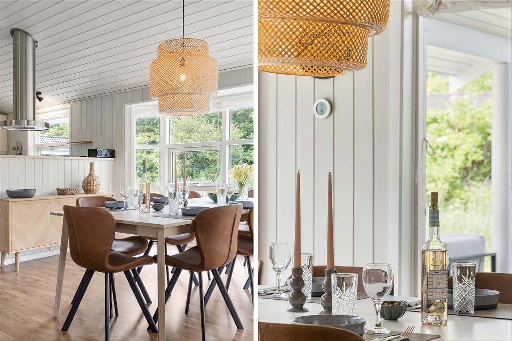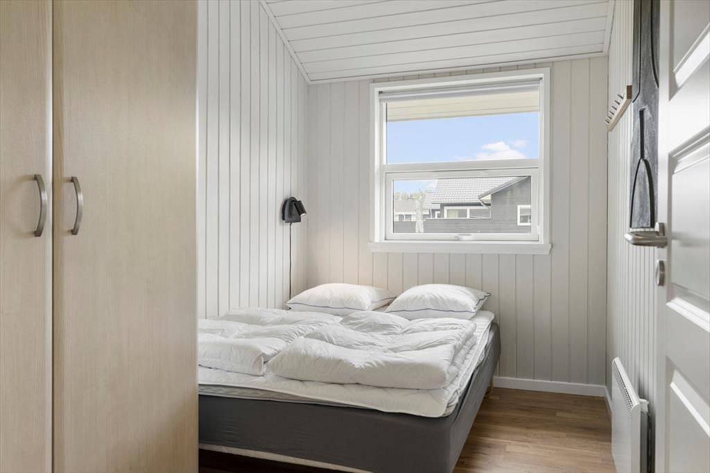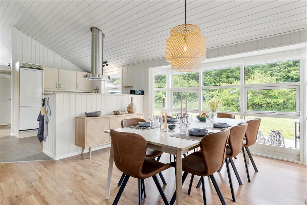 Atmosfæren er lys og let inden døre i sommerhuset, der måler 109 m2 og har en glimrende planløsning til seks personer. De tre soveværelser er alle udstyret med komfortable dobbeltsenge, og foruden et rummeligt badeværelse byder huset også på et pænt gæstetoilet. Du og familien kommer nu sikkert til at tilbringe flest af døgnets vågne timer i stuen, for det er et skønt opholdsrum med store vinduer, loft til kip og et integreret køkken med alt det nødvendige, når der skal kokkereres. Spisebordet er et hyggeligt sted at mødes til brætspil, gode samtaler og lækre måltider, og i sofaafdelingen har du både fladskærms-tv’et og brændeovnen lige i nærheden, så her kan I rigtigt hygge igennem med filmaftener og andre tilbagelænede stunder.