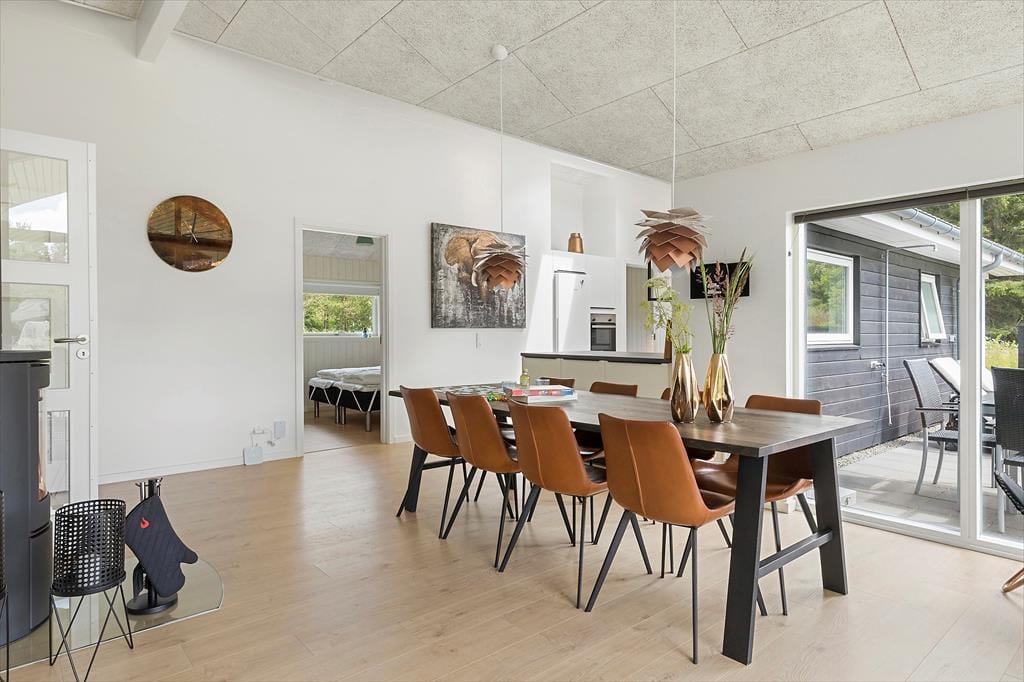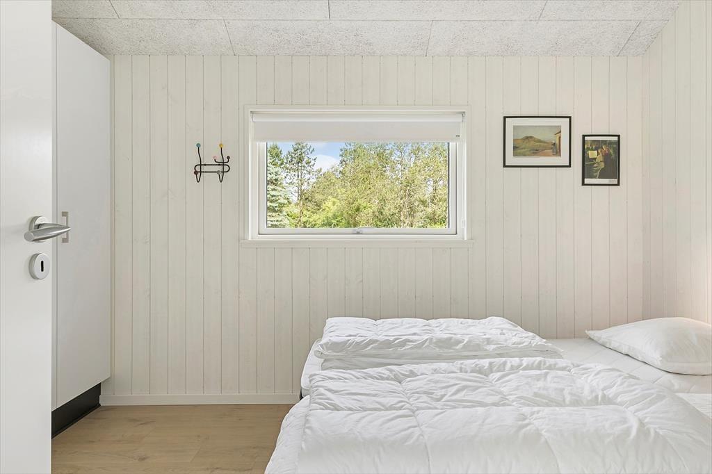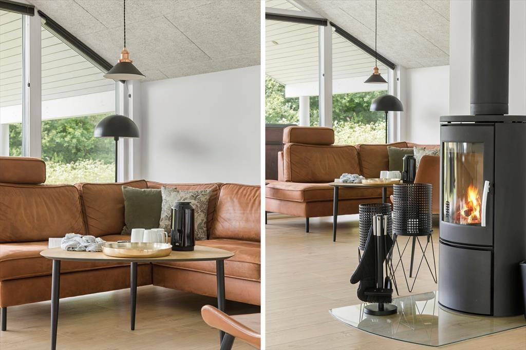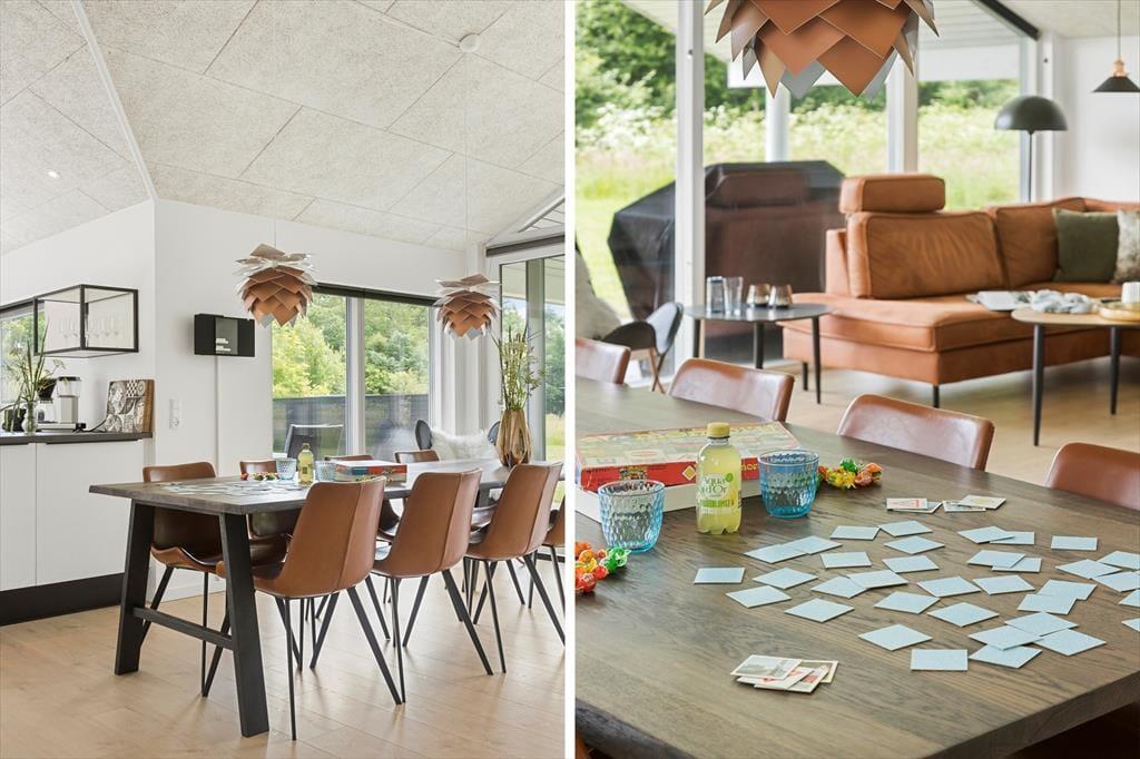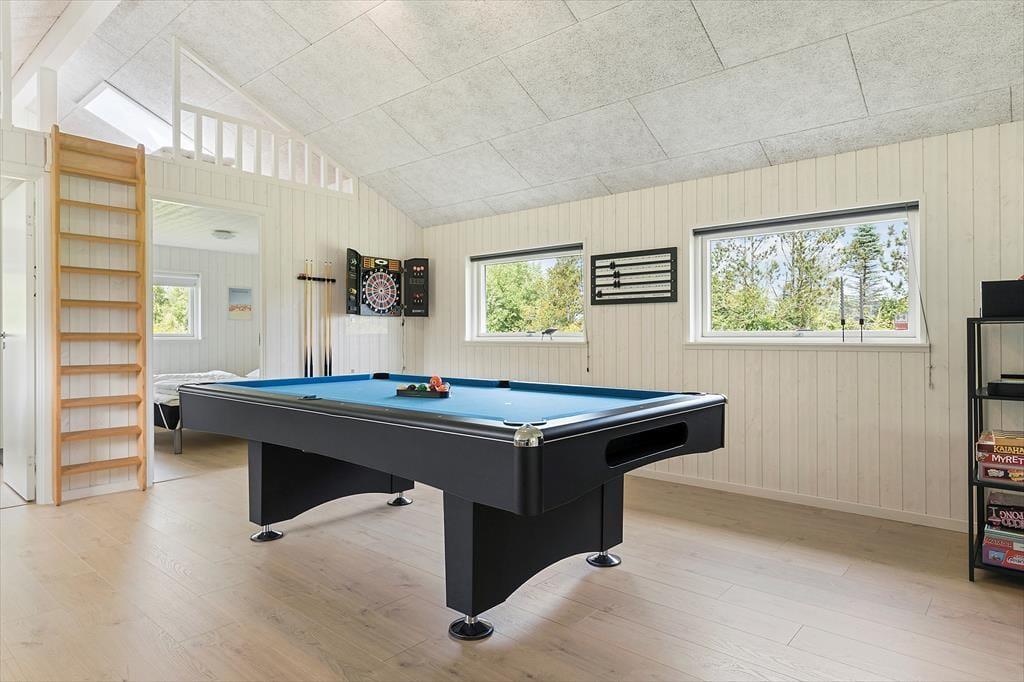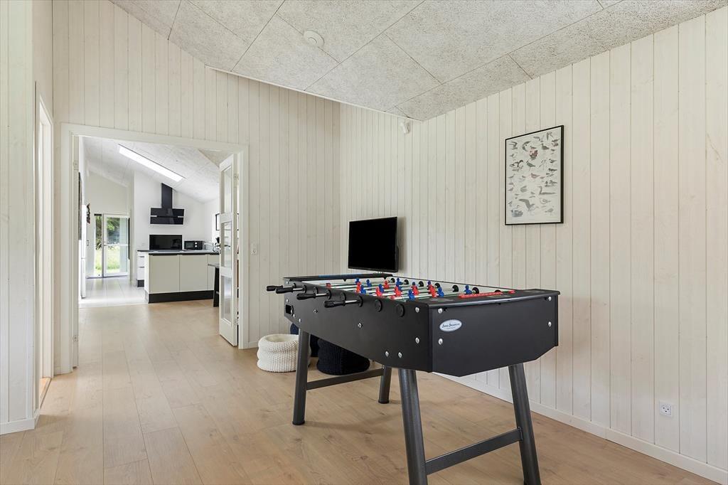 Da sommerhuset blev opført i 2019, blev der lagt vægt på at skabe en lys og indbydende feriebolig, hvor gæsterne har god plads til at hygge sig sammen – såvel som til at finde en rolig krog, når humøret er til det. Hvis du vil slappe helt af, vil saunaen på det største af husets to badeværelser sikkert være et hit, og det kan også være skønt at tænde op i brændeovnen og slå sig ned i stuens sofaafdeling med en god kop kaffe og yndlingsserien på fladskærms-tv’et. Skal der være mere gang i den, kan du og dine kære dyste i pool, dart, bordtennis og bordfodbold i aktivitetsrummet, inden I tryller et lækkert måltid frem i det veludstyrede køkken og nyder resten af aftenen sammen omkring spisebordet. Den gennemtænkte planløsning byder på fire soveværelser, og de har en lige så rar atmosfære som de øvrige rum.