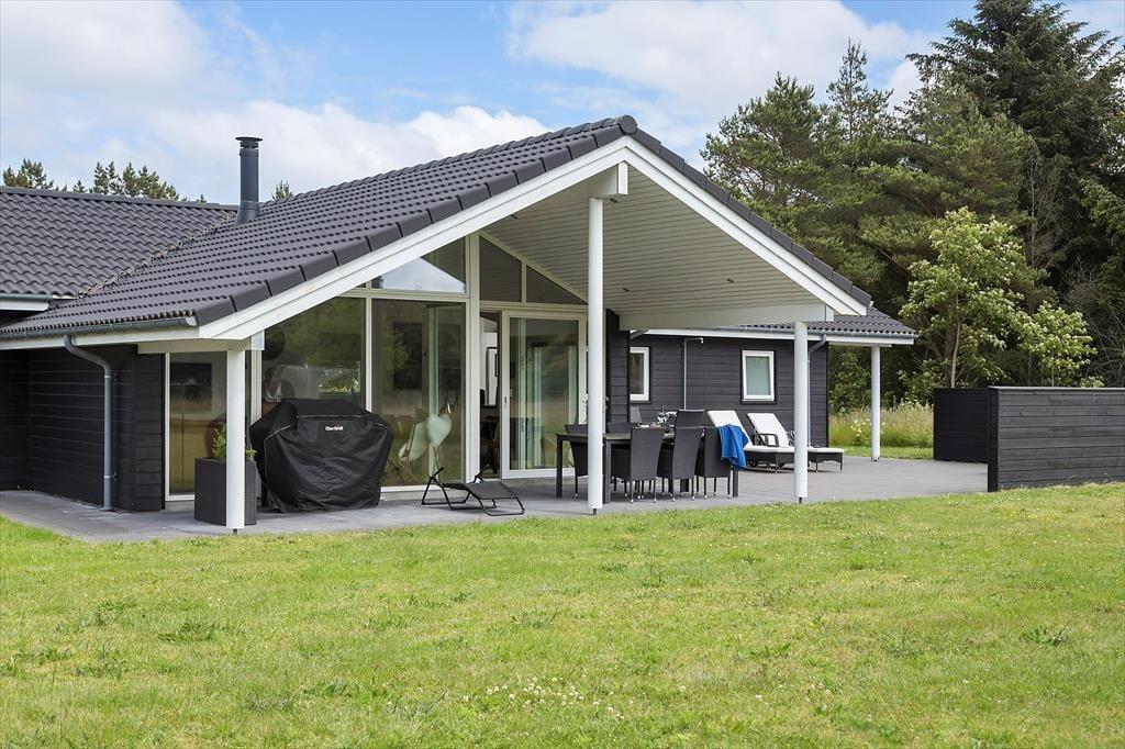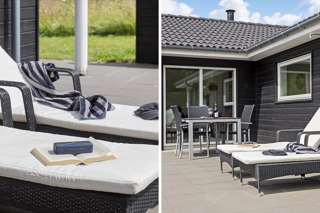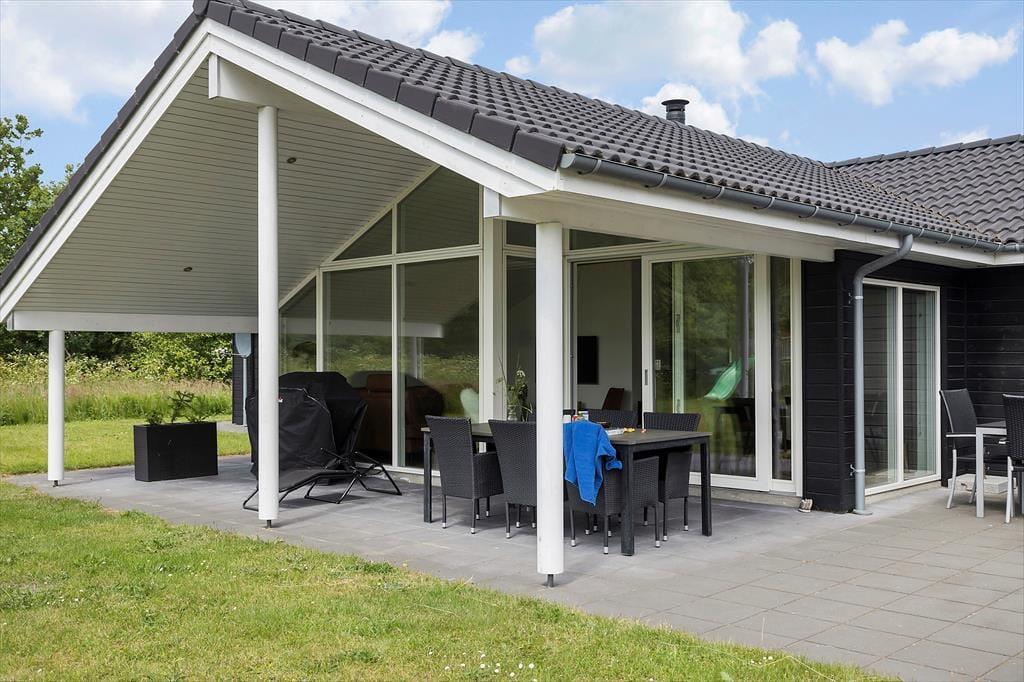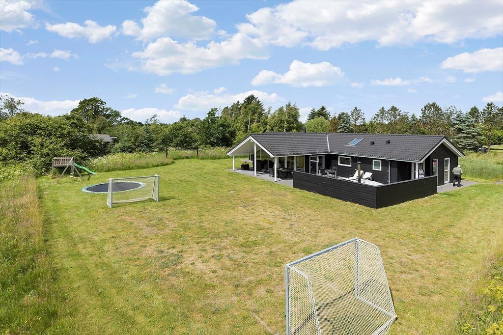 Fra stuen har du direkte adgang til sommerhusets sydvendte terrasse. Orienteringen er perfekt, hvis du drømmer om at sidde i solen det meste af dagen – og ellers kan du finde en skyggefuld opholdsplads under overdækningen. Til børnene er der trampolin og legestativ med gynger, og hele familien kan hygge sig med at spille fodbold eller lege fangeleg på græsplænen. Trænger du til at blive frisket op, kan du skylle dig under udebruseren, inden I går i gang med at grille og dække bord til aftensmaden. Og når mørket falder på, og stjernerne kigger frem på himlen, kan I slutte dagen med at slappe af i vildmarksbadet.