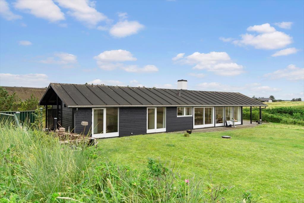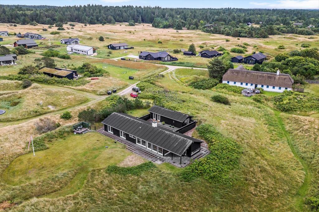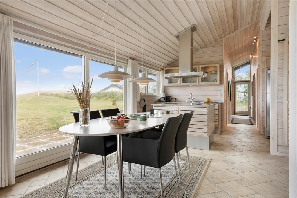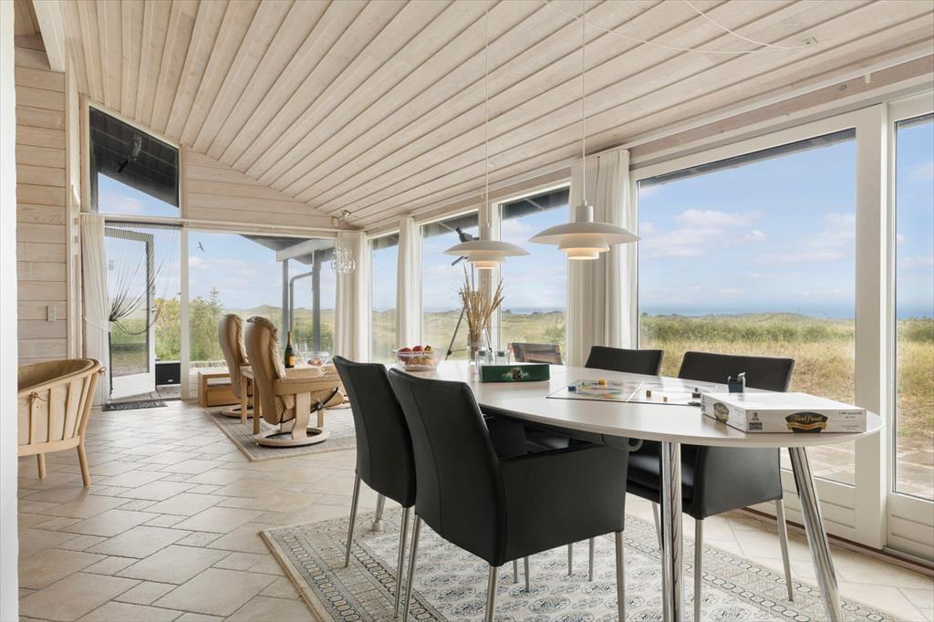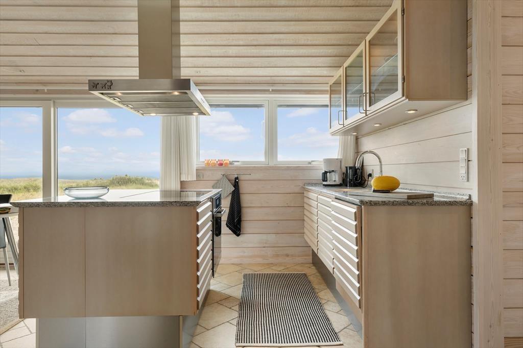 Når du træder ind i sommerhuset, møder du lyse og rummelige rum, der alle har det ene formål – at give dig følelsen af afslapning og nærvær. Husets store panoramavinduer åbner op for en storslået udsigt til klitlandskab og Vesterhavet og lader lyset strømme ind, så naturens stemning bliver en integreret del af hjemmets atmosfære. Her er alt, hvad du behøver af moderne komfort, og med et åbent køkken og opholdsområde er der lagt op til hyggelige stunder, hvor familien kan samles om madlavning og afslappende måltider. Uanset om du vil nyde en rolig stund alene eller i selskab med andre, byder dette sommerhus på de perfekte rammer for en ferie med fokus på ro og nærvær.