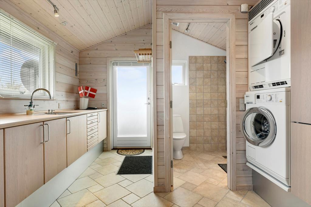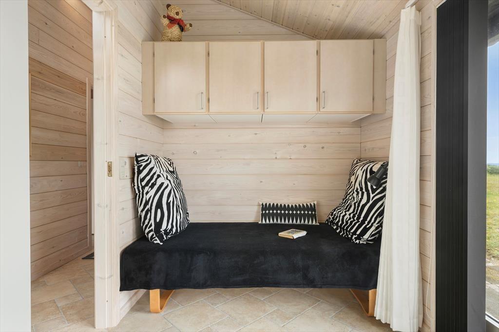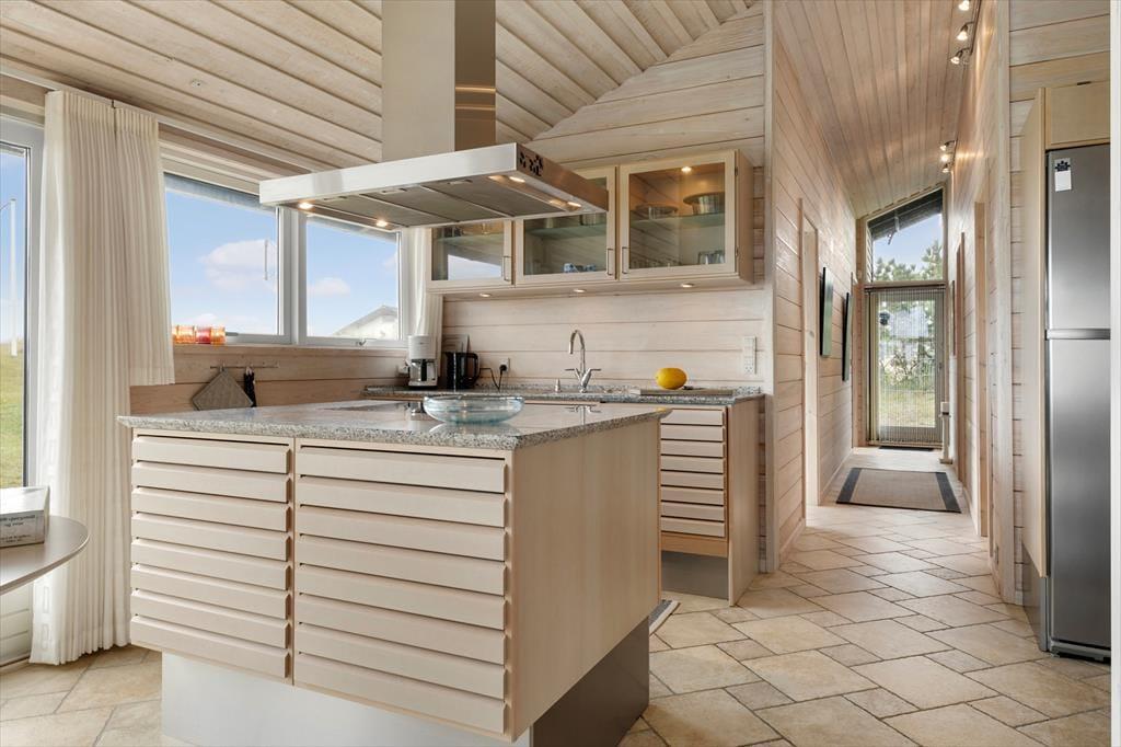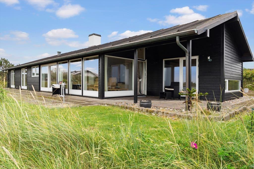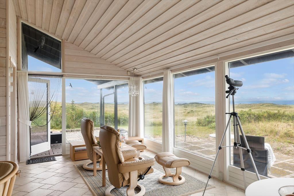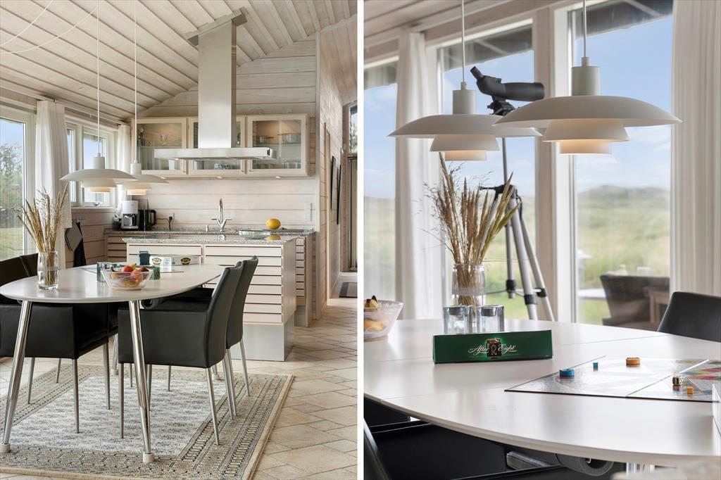 Når du træder ind i sommerhuset, møder du lyse og rummelige rum, der alle har det ene formål – at give dig følelsen af afslapning og nærvær. Husets store panoramavinduer åbner op for en storslået udsigt til klitlandskab og Vesterhavet og lader lyset strømme ind, så naturens stemning bliver en integreret del af hjemmets atmosfære. Her er alt, hvad du behøver af moderne komfort, og med et åbent køkken og opholdsområde er der lagt op til hyggelige stunder, hvor familien kan samles om madlavning og afslappende måltider. Uanset om du vil nyde en rolig stund alene eller i selskab med andre, byder dette sommerhus på de perfekte rammer for en ferie med fokus på ro og nærvær.