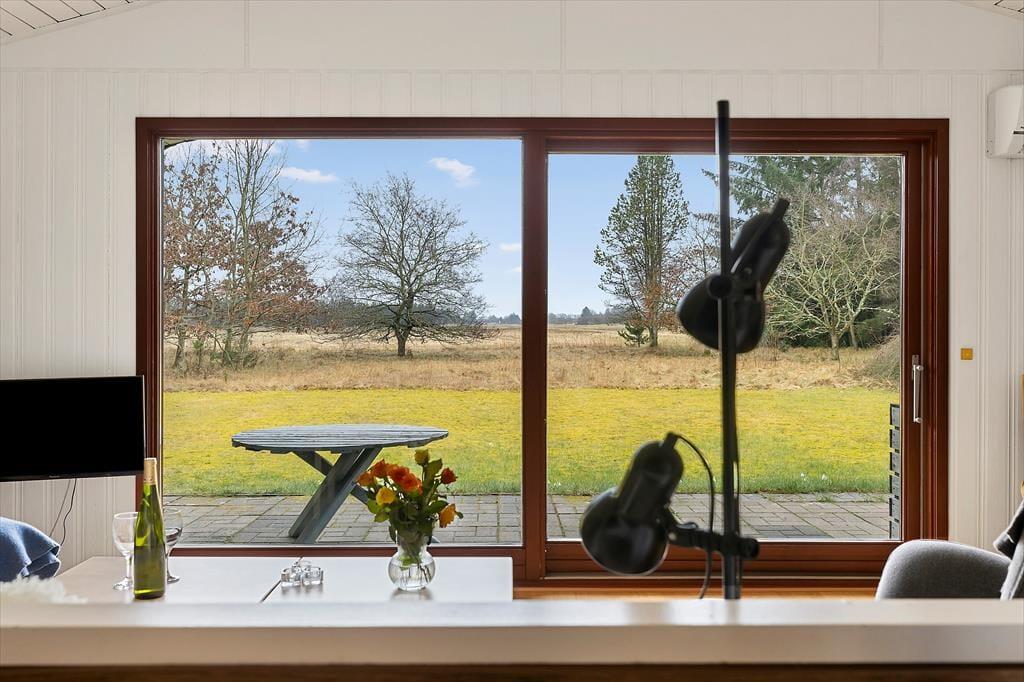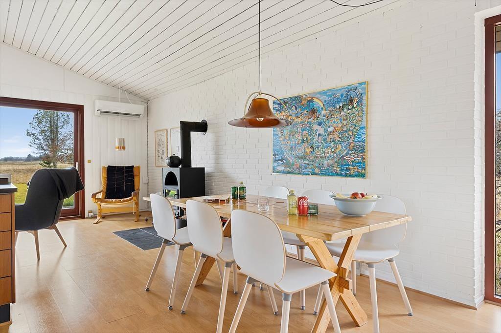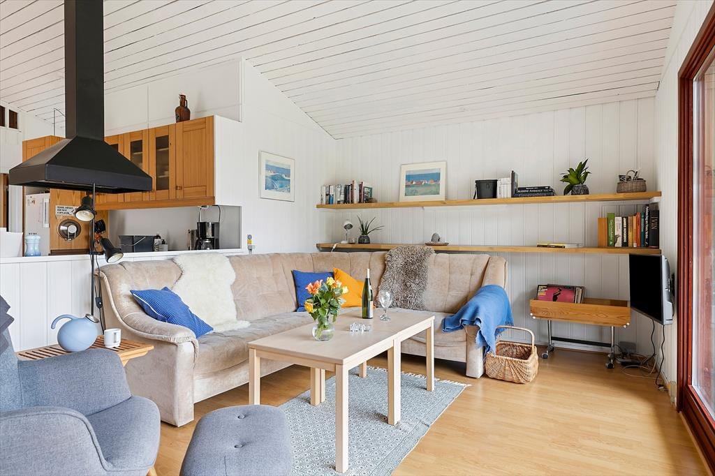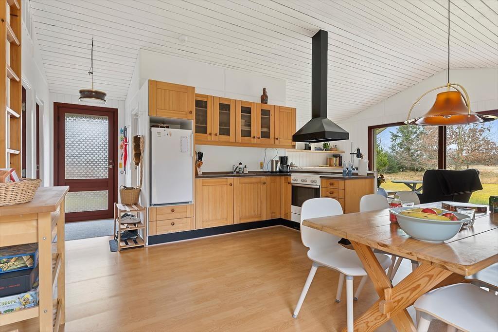 Sommerhuset har en klassisk og hyggelig indretning, hvor store vinduer skaber en lys og indbydende atmosfære. Her er plads til afslapning i stuen, hvor du kan læse en god bog, spille spil med familien eller blot nyde udsigten til den omgivende natur. Det åbne opholdsrum samler stue, spiseplads og køkken i ét, så hele familien kan være sammen, selv når maden tilberedes. Indretningen er enkel og funktionel, og fra stuen har du direkte adgang til terrassen, hvor du kan trække frisk luft og nyde udsigten til grunden.