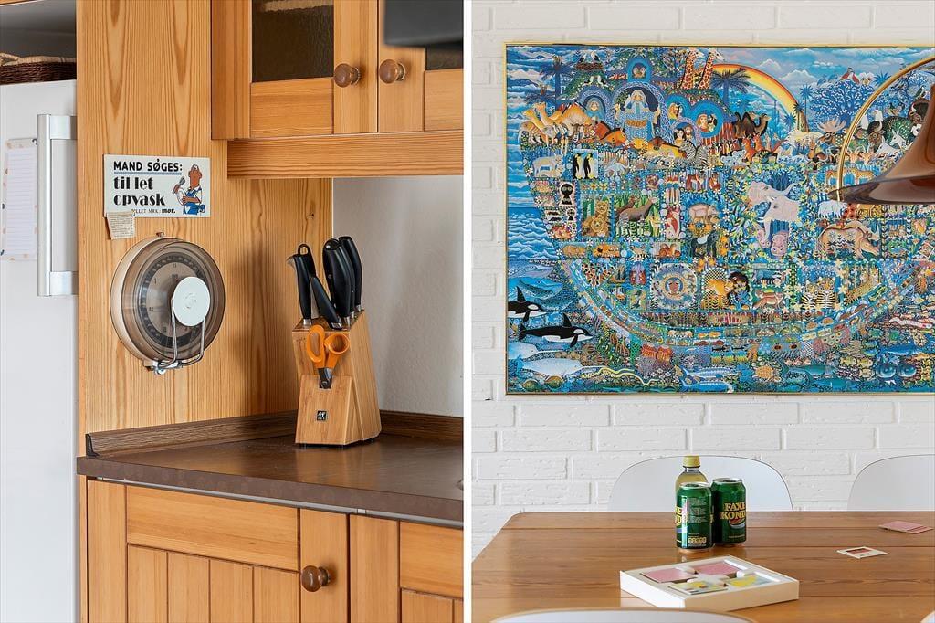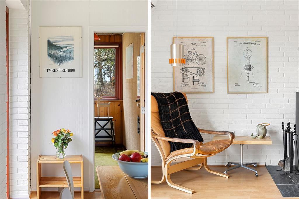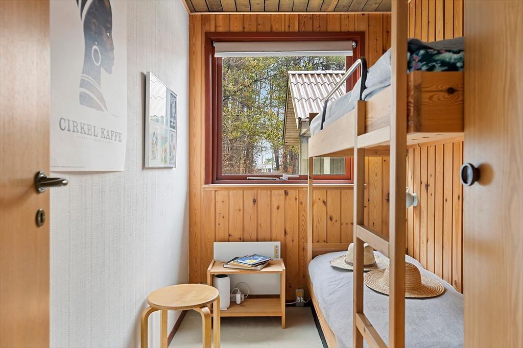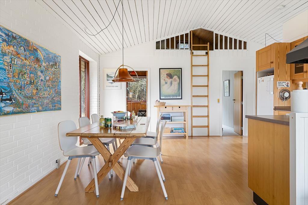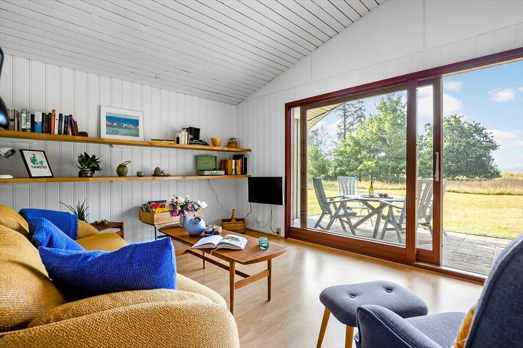 Sommerhuset har en klassisk og hyggelig indretning, hvor store vinduer skaber en lys og indbydende atmosfære. Her er plads til afslapning i stuen, hvor du kan læse en god bog, spille spil med familien eller blot nyde udsigten til den omgivende natur. Det åbne opholdsrum samler stue, spiseplads og køkken i ét, så hele familien kan være sammen, selv når maden tilberedes. Indretningen er enkel og funktionel, og fra stuen har du direkte adgang til terrassen, hvor du kan trække frisk luft og nyde udsigten til grunden.