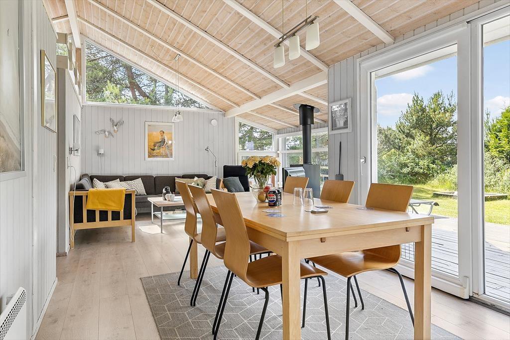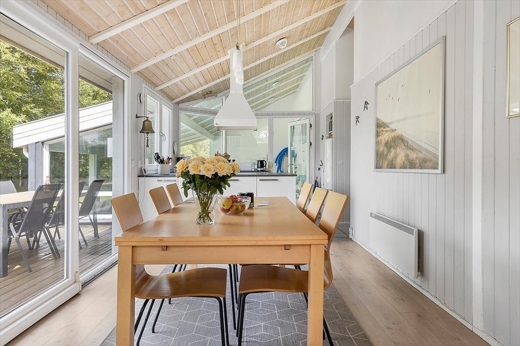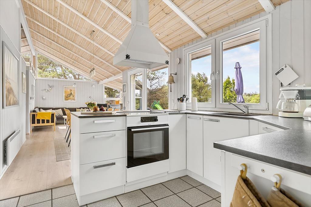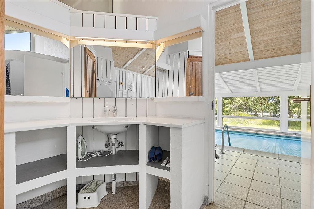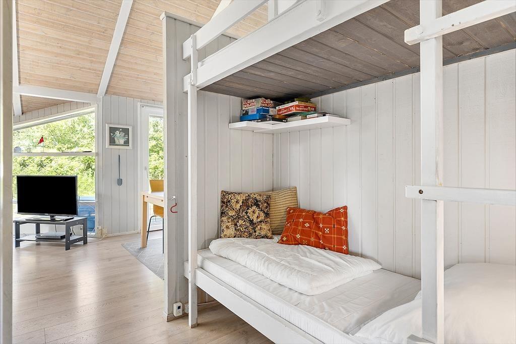 Det første, du lægger mærke til, når du træder indenfor i sommerhuset, er det dejlige lysindfald fra de store vinduespartier, som åbner rummene op og inviterer solen helt ind i stuen. Indretningen er venlig og hjemlig – lige som man ønsker det, når man holder fri fra hverdagen. Fra den rummelige opholdsstue er der kig direkte ind til den indbydende poolafdeling, som uden tvivl vil være familiens favoritsted på de dage, hvor badetøjet næsten ikke kan komme hurtigt nok på. Her kan børnene boltre sig, mens de voksne nyder en kop kaffe i sofaen – måske med udsigten til, at dagens vandplask bliver afløst af en stille aften foran tv’et eller omkring spisebordet. Køkkenet ligger praktisk i forlængelse af stuen, så du kan være med i samtalen, selv mens maden simrer. Og når dagen går på hæld, venter sommerhusets soveværelser med ro og afslapning efter en dag fyldt med indtryk og samvær.