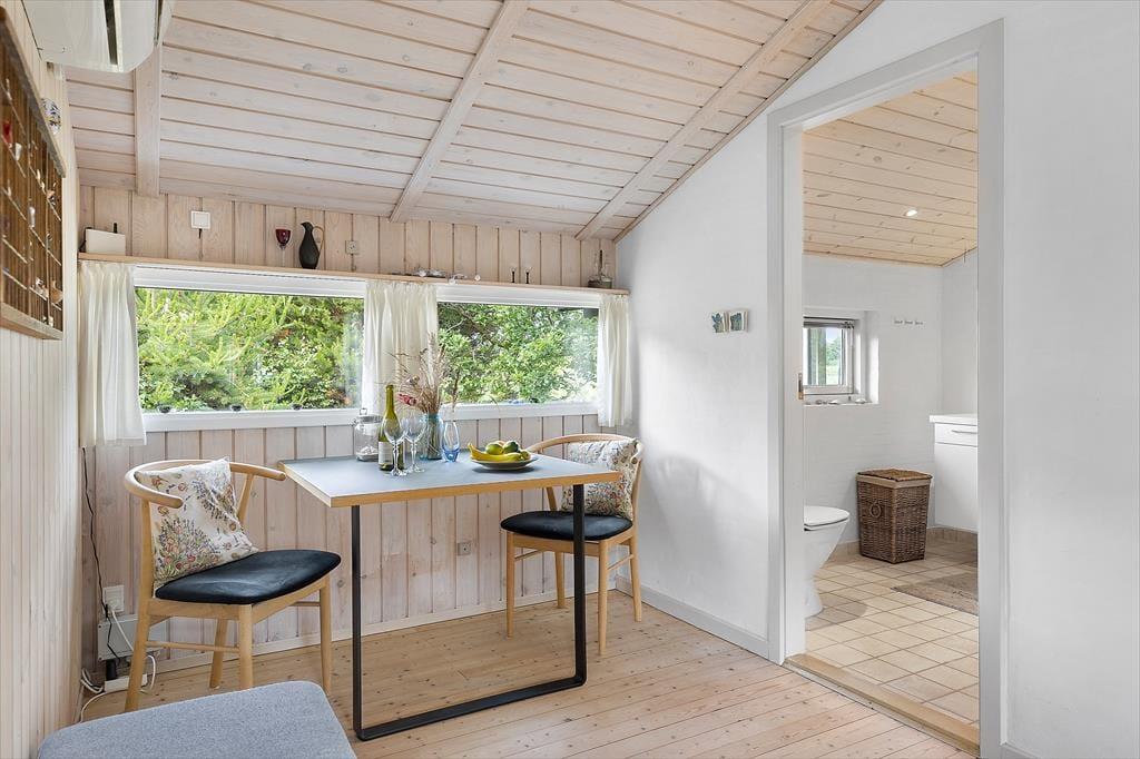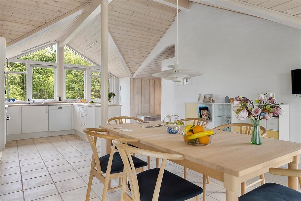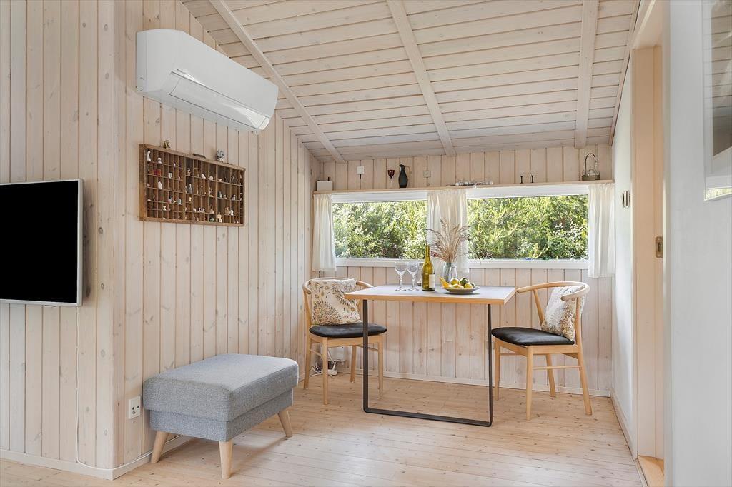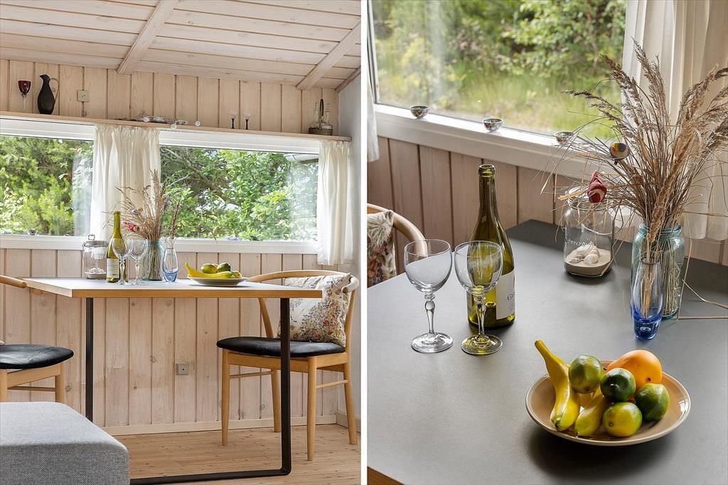 Det charmerende sommerhus byder på en skøn og indbydende indretning, hvor store vinduespartier trækker dagslyset helt ind i rummene og skaber en lys og venlig stemning. Her er tænkt over detaljerne – både når det gælder funktionalitet og hygge. Stuen indbyder til samvær og afslapning med sin rare atmosfære, og det åbne opholdsrum binder køkken, spiseplads og sofaområde fint sammen, så I kan være sammen på tværs af aktiviteter. Måske står en i familien og laver morgenkaffe i køkkenet, mens andre læser bøger i sofaen eller spiller kort ved spisebordet – her er plads til det hele. Når mørket falder på, kan du trække gardinerne for og nyde stilheden, der kun afbrydes af aftenens lyde fra naturen udenfor. Det er sådan et sted, hvor ferien får lov at folde sig ud i eget tempo.