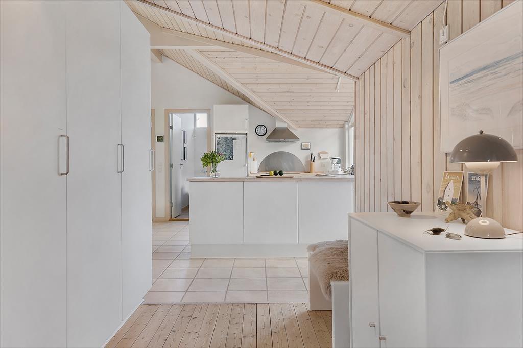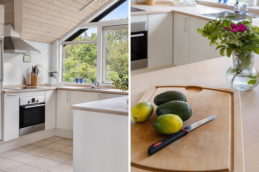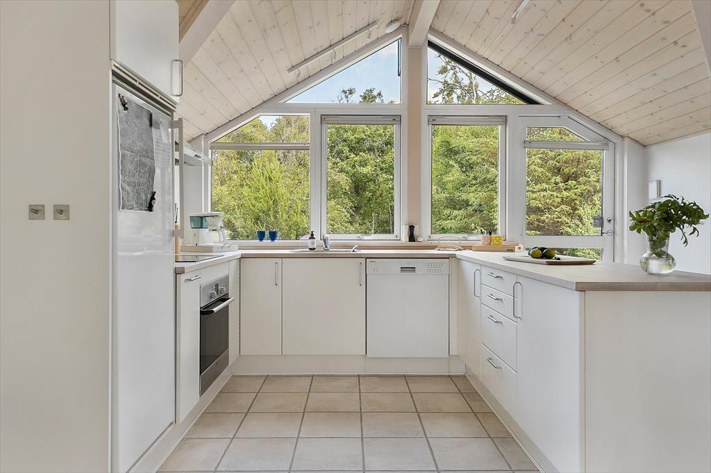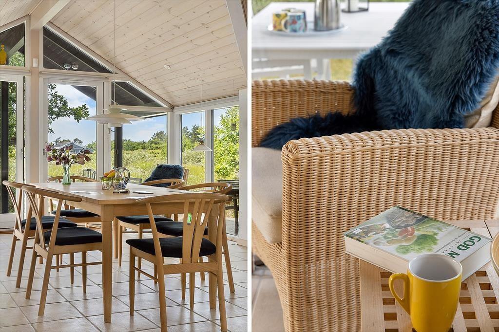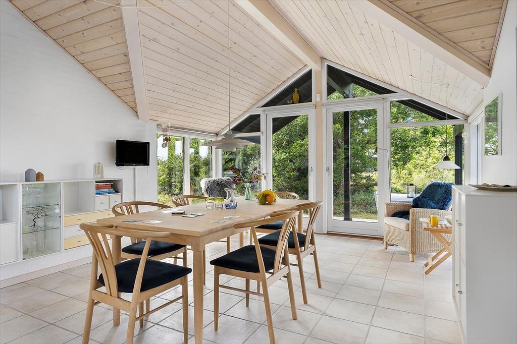 Det charmerende sommerhus byder på en skøn og indbydende indretning, hvor store vinduespartier trækker dagslyset helt ind i rummene og skaber en lys og venlig stemning. Her er tænkt over detaljerne – både når det gælder funktionalitet og hygge. Stuen indbyder til samvær og afslapning med sin rare atmosfære, og det åbne opholdsrum binder køkken, spiseplads og sofaområde fint sammen, så I kan være sammen på tværs af aktiviteter. Måske står en i familien og laver morgenkaffe i køkkenet, mens andre læser bøger i sofaen eller spiller kort ved spisebordet – her er plads til det hele. Når mørket falder på, kan du trække gardinerne for og nyde stilheden, der kun afbrydes af aftenens lyde fra naturen udenfor. Det er sådan et sted, hvor ferien får lov at folde sig ud i eget tempo.