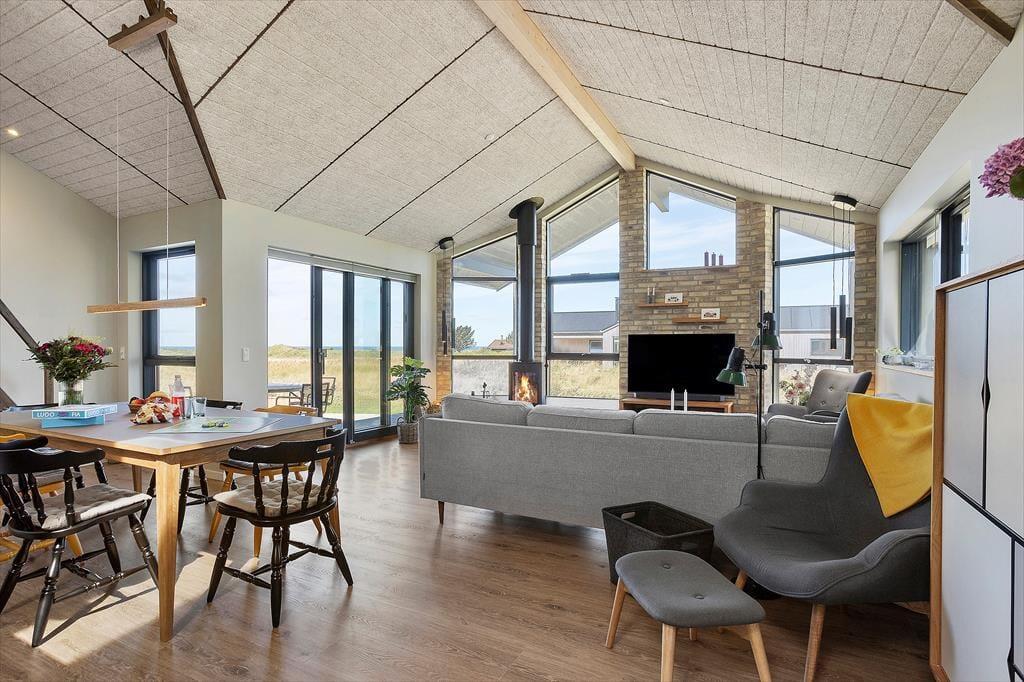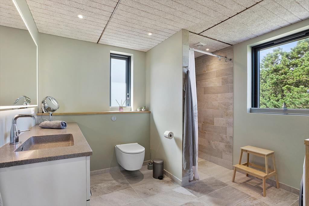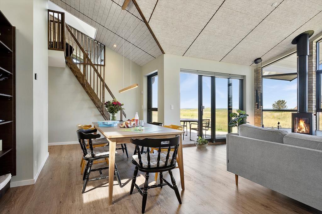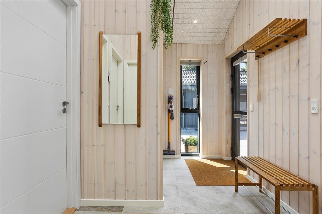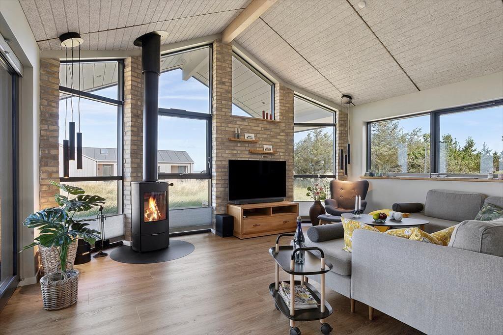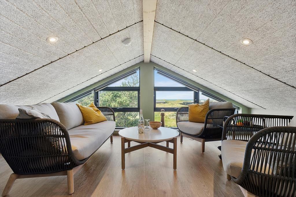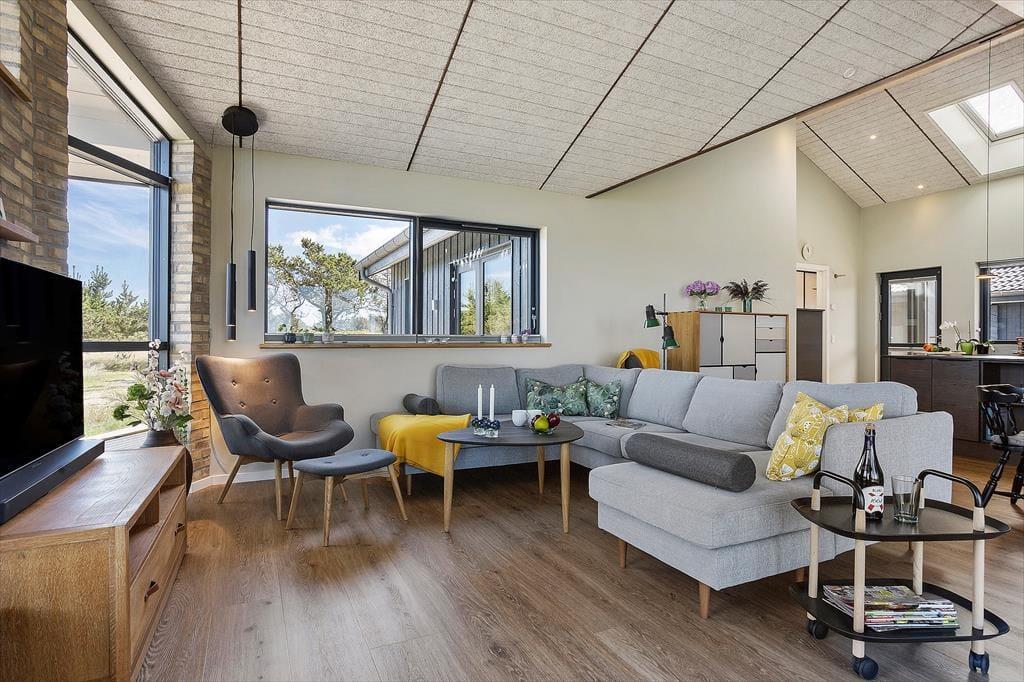 Når du ankommer til det lyse og stilfulde sommerhus på Mellemklitvej 32, sker det via snoede skovveje, der allerede fra første øjeblik indrammer den særlige ro og nærhed til naturen, som venter dig. Indenfor mærker du hurtigt, at her er tænkt på både funktionalitet og feriehygge. De lyse rum føles luftige og behagelige – ikke mindst takket være fire ovenlysvinduer, der sikrer et godt indeklima, selv når solen for alvor bager udenfor. Hvert af husets værelser har direkte udgang til terrassen, så du let kan starte dagen med en stille stund i morgensolen. På hemsen finder du en hyggelig krog med udsigt til havet – perfekt til en rolig læsestund eller et glas vin, når dagen går på hæld. I det vestvendte soveværelse er der desuden indrettet en hjemmearbejdsplads med en 27" pc-skærm, så du kan kombinere ferie og arbejde uden at gå på kompromis med komforten. Sommerhuset rummer to skønne badeværelser. Det ene er udstyret med både badekar og infrarød sauna, hvor du kan forkæle dig selv efter en dag ved havet eller i naturen. Det andet badeværelse har vaskemaskine, tørretumbler og en praktisk vaskeplads – ideelt til længere ophold eller børnefamilier. I det tilstødende aktivitetsrum finder du ekstra køle- og fryseplads, så der altid er plads til både kolde drikke og is til børnene.