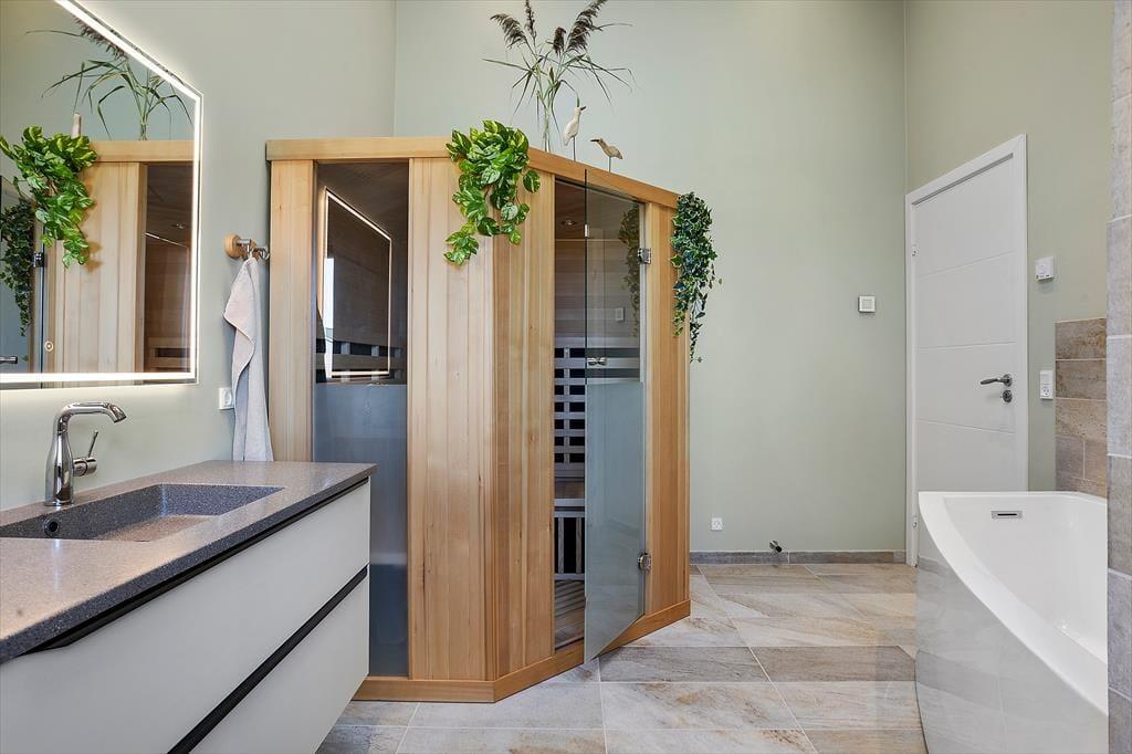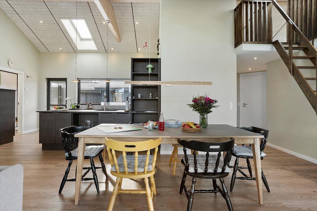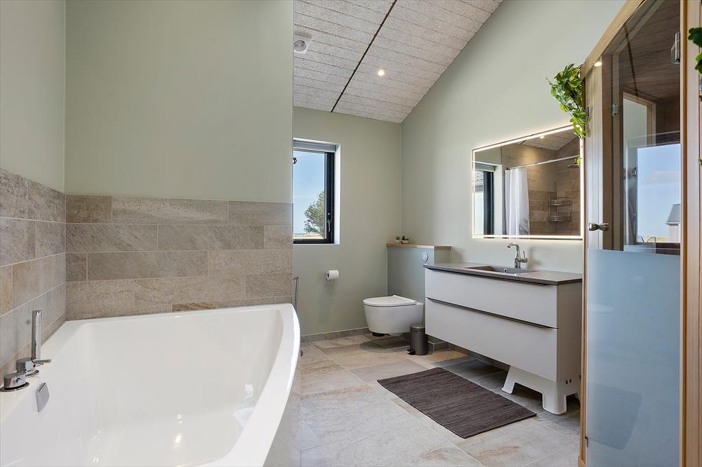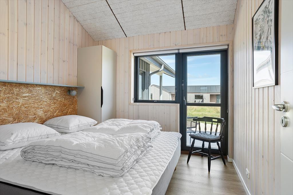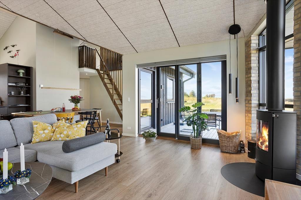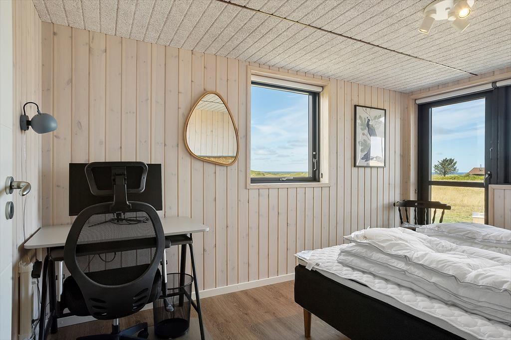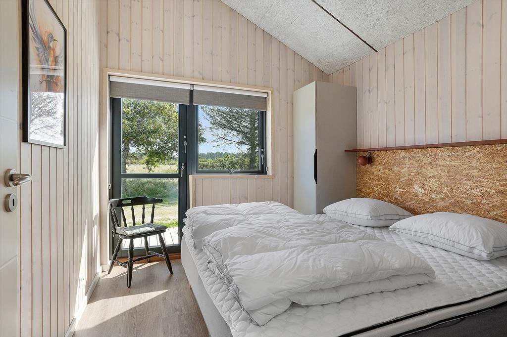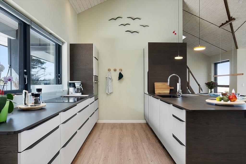 Når du ankommer til det lyse og stilfulde sommerhus på Mellemklitvej 32, sker det via snoede skovveje, der allerede fra første øjeblik indrammer den særlige ro og nærhed til naturen, som venter dig. Indenfor mærker du hurtigt, at her er tænkt på både funktionalitet og feriehygge. De lyse rum føles luftige og behagelige – ikke mindst takket være fire ovenlysvinduer, der sikrer et godt indeklima, selv når solen for alvor bager udenfor. Hvert af husets værelser har direkte udgang til terrassen, så du let kan starte dagen med en stille stund i morgensolen. På hemsen finder du en hyggelig krog med udsigt til havet – perfekt til en rolig læsestund eller et glas vin, når dagen går på hæld. I det vestvendte soveværelse er der desuden indrettet en hjemmearbejdsplads med en 27" pc-skærm, så du kan kombinere ferie og arbejde uden at gå på kompromis med komforten. Sommerhuset rummer to skønne badeværelser. Det ene er udstyret med både badekar og infrarød sauna, hvor du kan forkæle dig selv efter en dag ved havet eller i naturen. Det andet badeværelse har vaskemaskine, tørretumbler og en praktisk vaskeplads – ideelt til længere ophold eller børnefamilier. I det tilstødende aktivitetsrum finder du ekstra køle- og fryseplads, så der altid er plads til både kolde drikke og is til børnene.